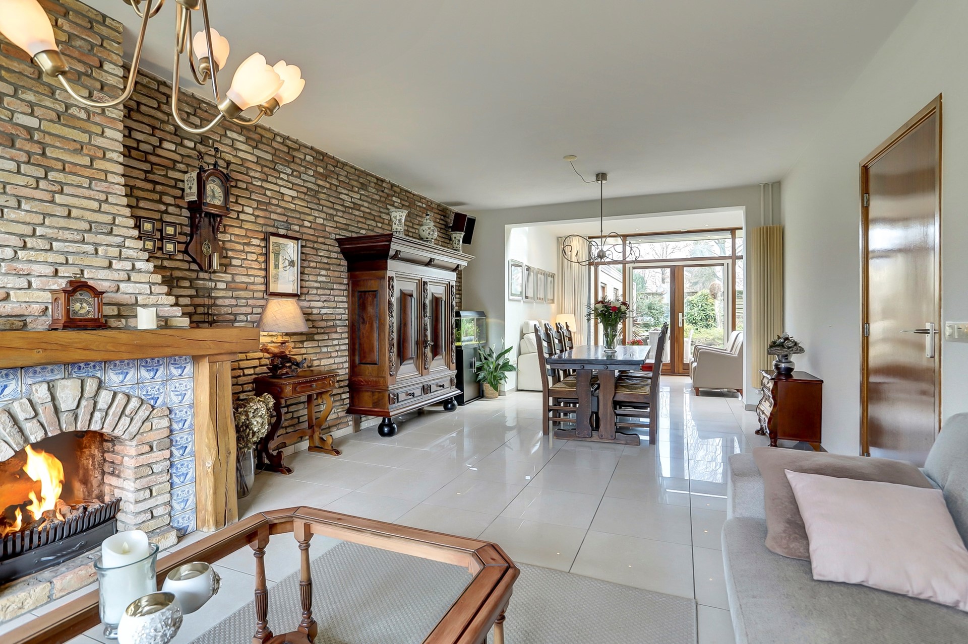Vanuit de keuken is de woonkamer te bereiken. De woonkamer is met een diepte van ca. 11m royaal van opzet waardoor veel indelingen mogelijk zijn. De kamer is uitgevoerd met een prachtige tegelvloer, witte wand- en plafondafwerking. De kamer is ondanks de grootte ook erg knus en gezellig door de vele extra's. Ideaal om met de familie rond de gashaard te vertoeven of in de tweede zithoek aan de achterzijde van de fluitende vogeltjes in de tuin te genieten. De grote raampartijen en lichtstraat zorgen voor tenslotte veel daglichttoetreding waardoor de lampen elke dag pas laat aan hoeven.