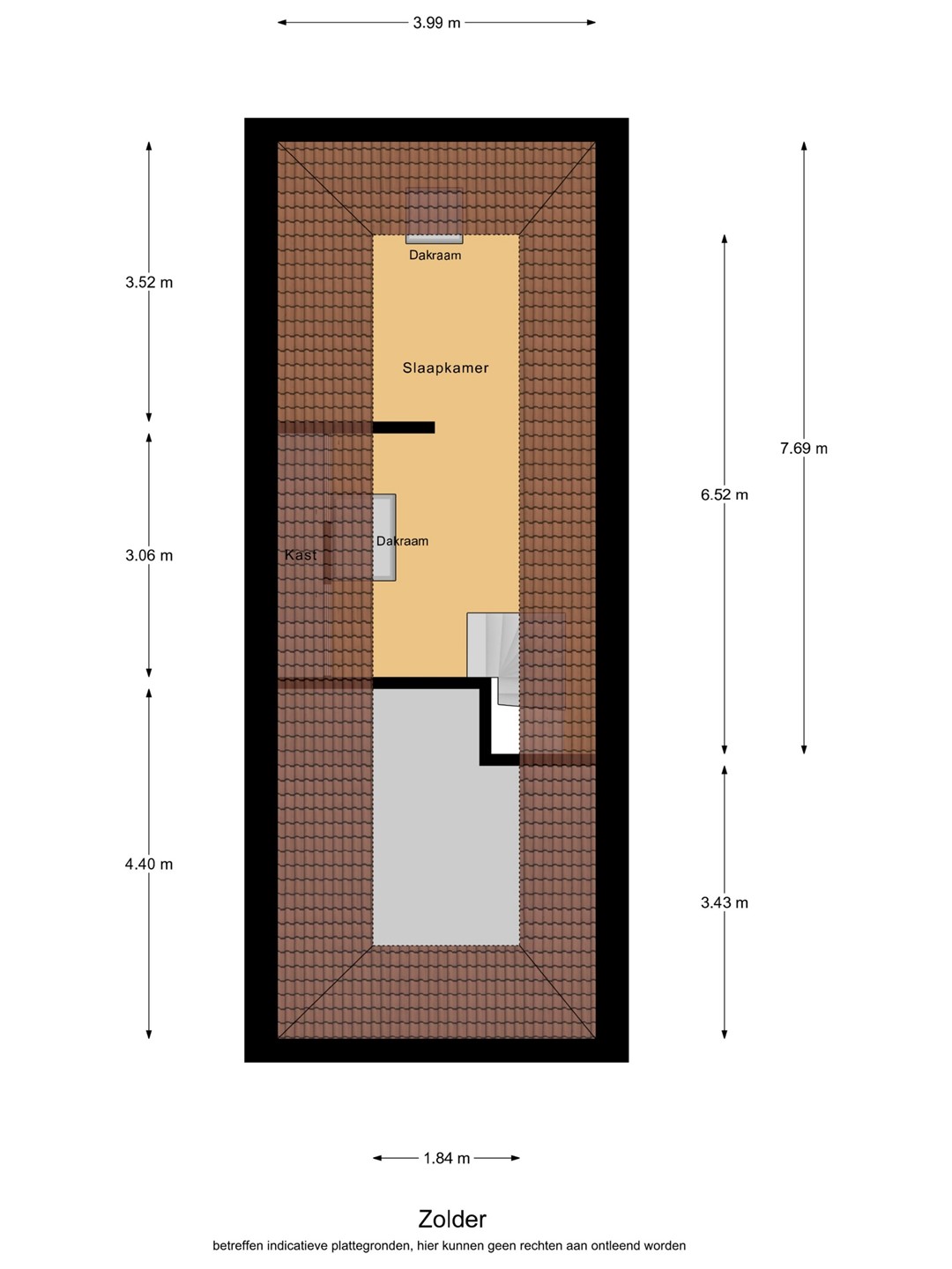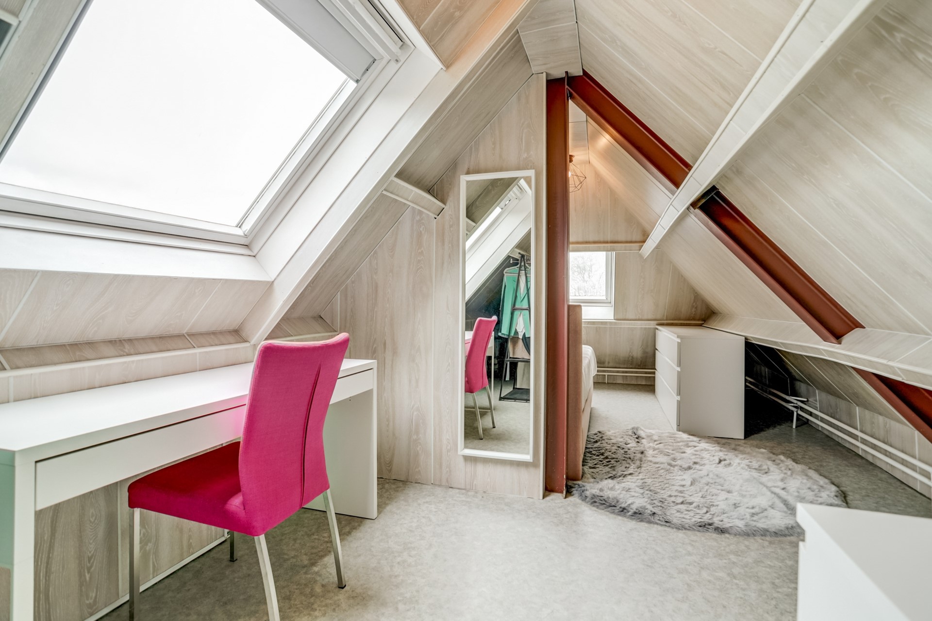 Zodra je de trap oploopt, loop je direct de slaapkamer in, welke voldoende ruimte biedt voor een tweepersoonsbed, bureau en een kledingkast. Tevens beschikt deze ruimte over twee dakramen voor het nodige daglicht en ventilatie.
