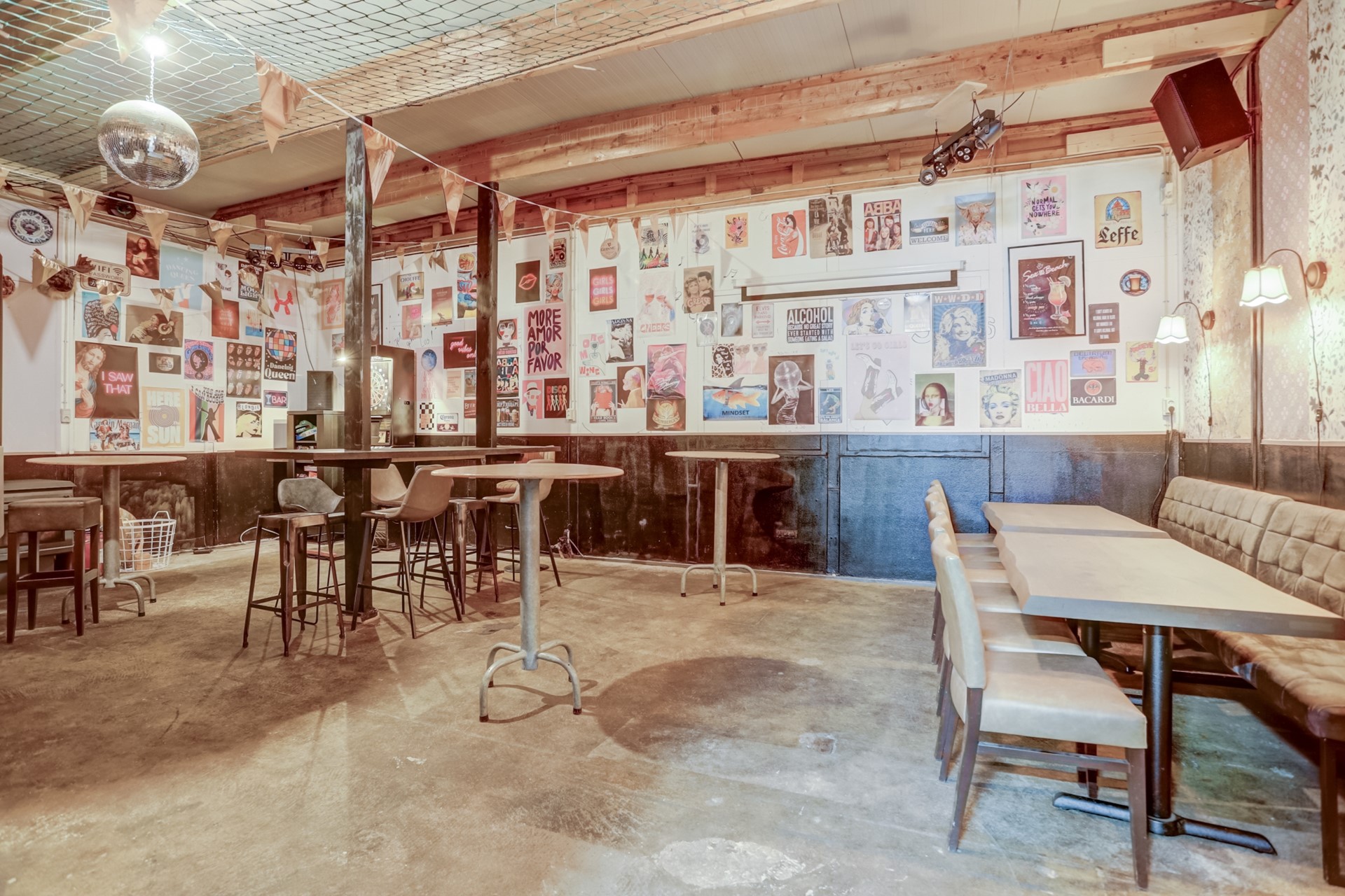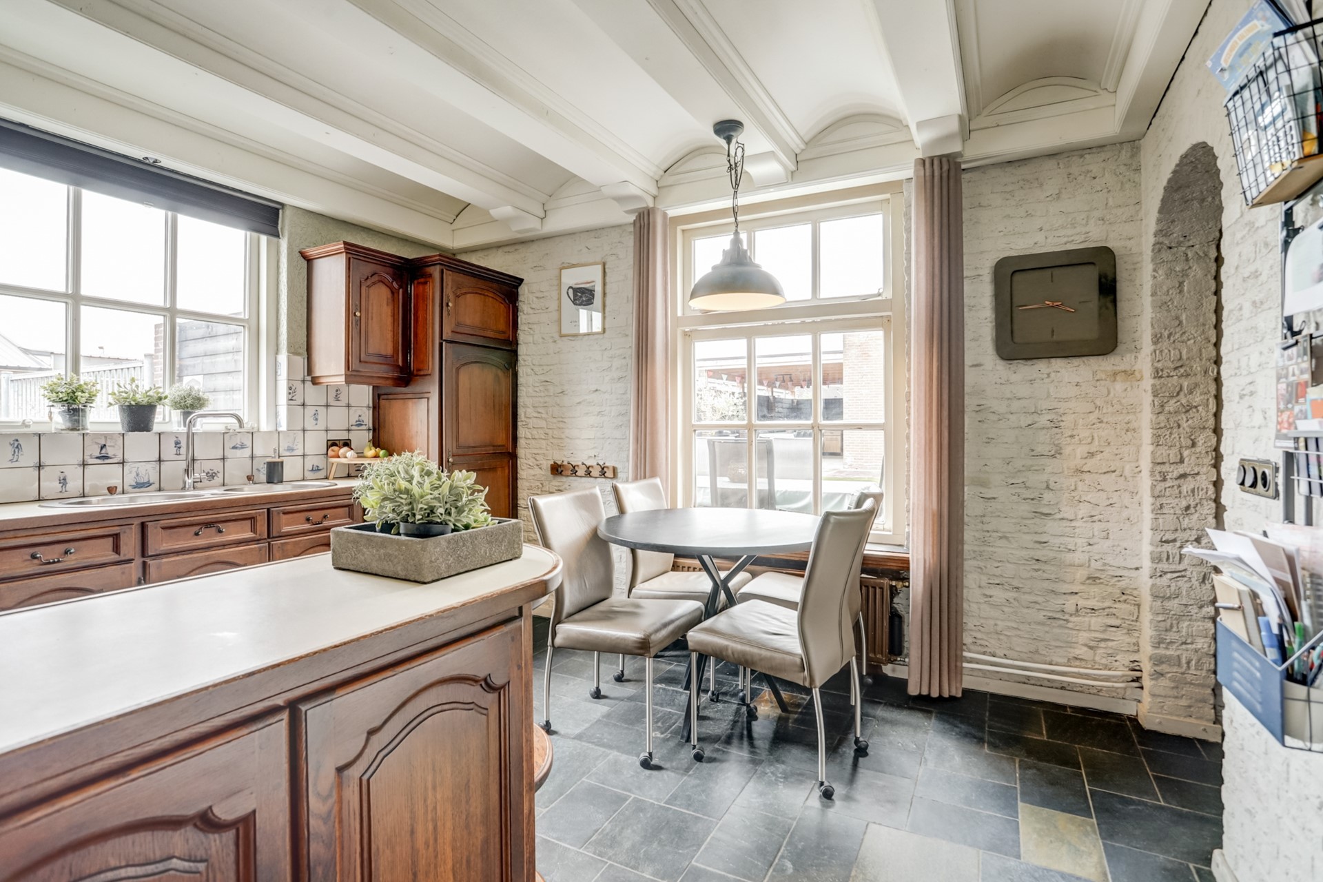 De ramen met roedes en het sfeervolle balkenplafond geven de ruimte net dat beetje extra karakter.