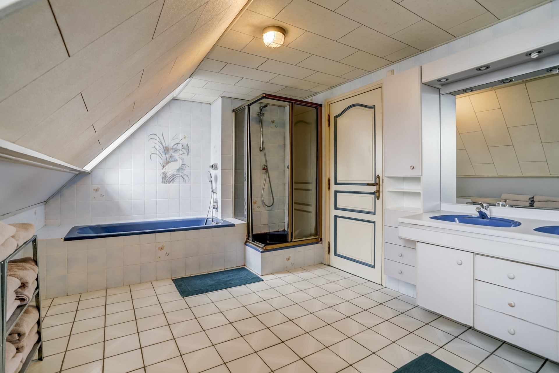 Deze royale badkamer beschikt over de juiste ruimte en indeling om hier iets moois van te maken. De badkamer beschikt over een groot badmeubel met dubbele wasbak, een douche, ligbad en voldoende opbergruimte.