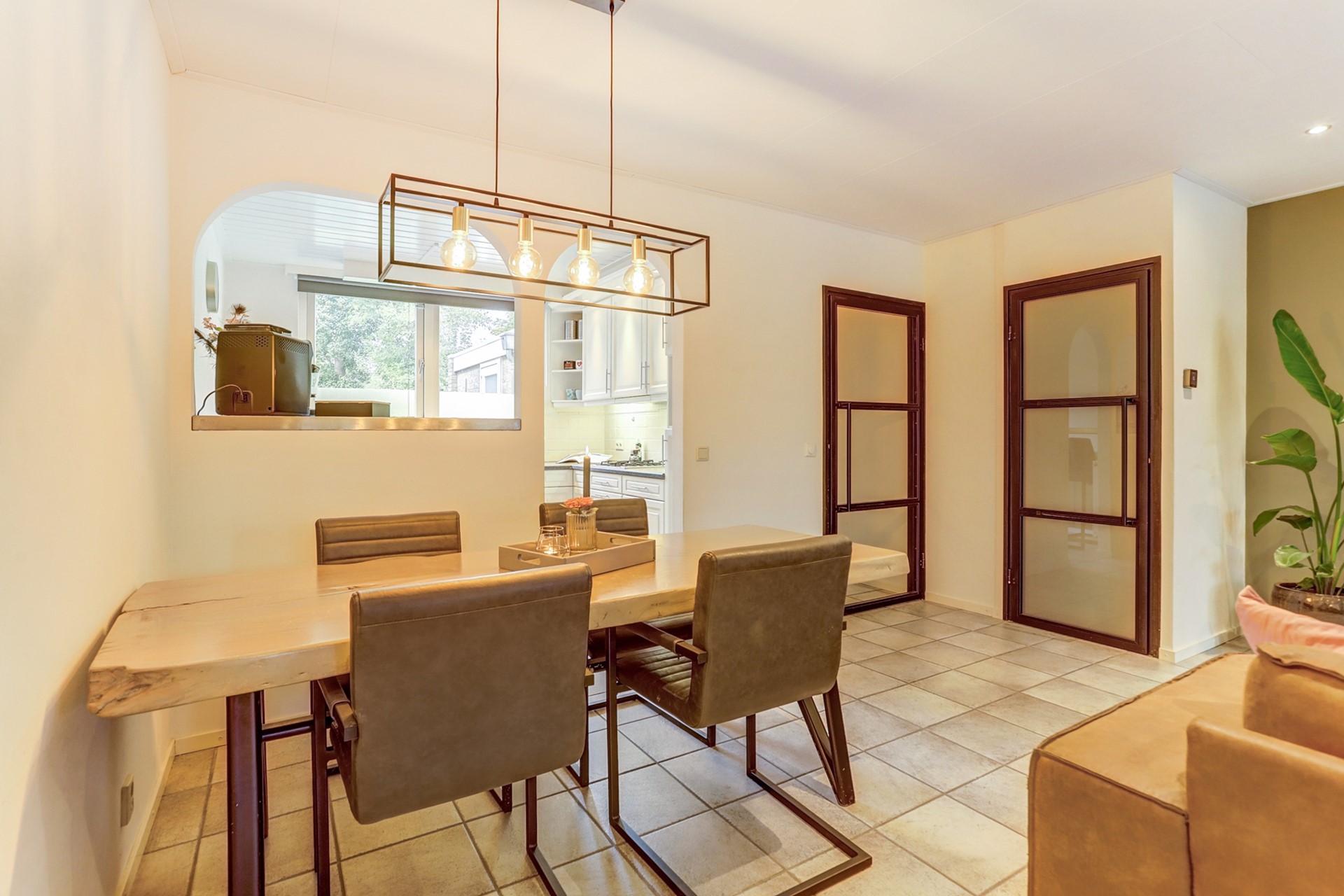 De tegelvloer loopt naadloos door vanuit de woonkamer, wat zorgt voor een ruimtelijk geheel. Daarnaast biedt de uitbouw een deur naar de tuin en een raam dat zorgt voor natuurlijke ventilatie en prettig daglicht.