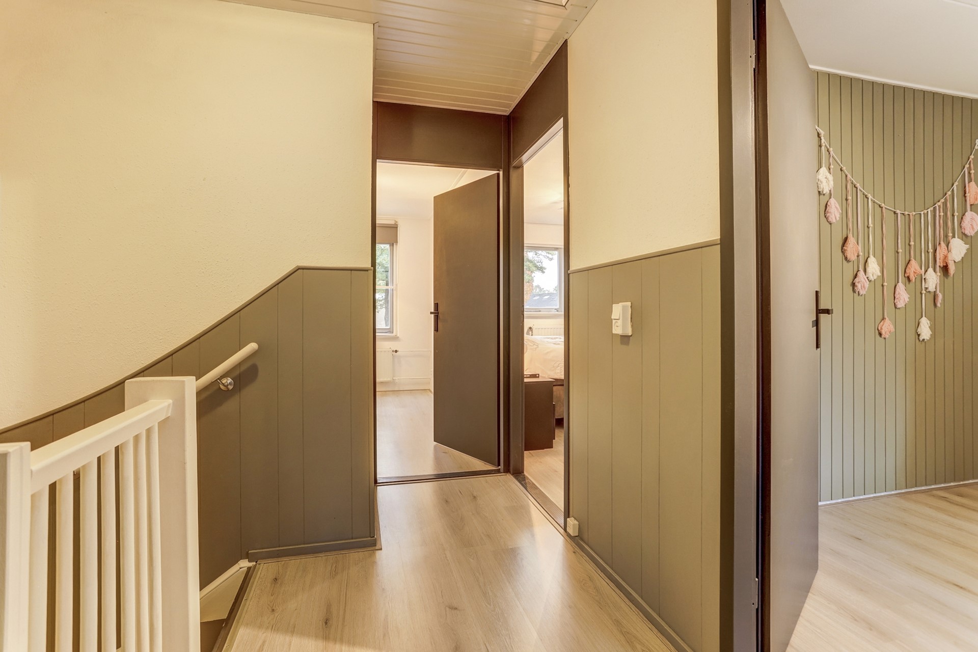 Over de hele verdieping ligt een tijdloze laminaatvloer, gecombineerd met frisse, lichte wanden en plafonds. De zwart geschilderde deuren geven een moderne touch, terwijl de fraaie lambrisering op de overloop zorgt voor extra sfeer en karakter.
