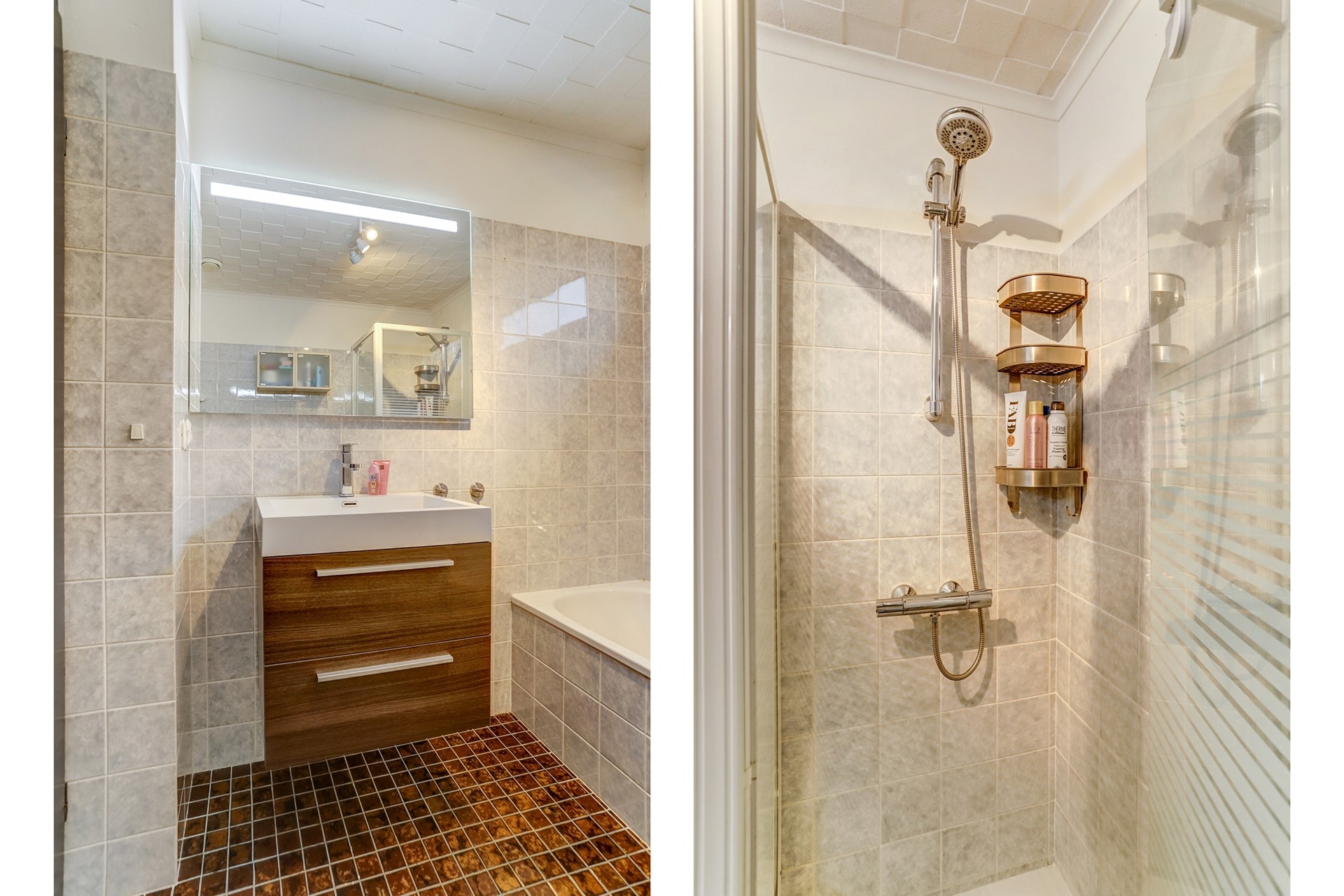 De badkamer is ruim en van alle gemakken voorzien. Het is geen ultra-moderne designruimte, maar wel goed onderhouden en comfortabel in gebruik. Je vindt er een ligbad onder het raam, een vernieuwd badmeubel met kastruimte en verlichte spiegel, een toilet (Sanibroyeur) en een aparte douchecabine met modern opbouw douchekraan . De badkamer is grotendeels betegeld en wordt verwarmd door een radiator.
