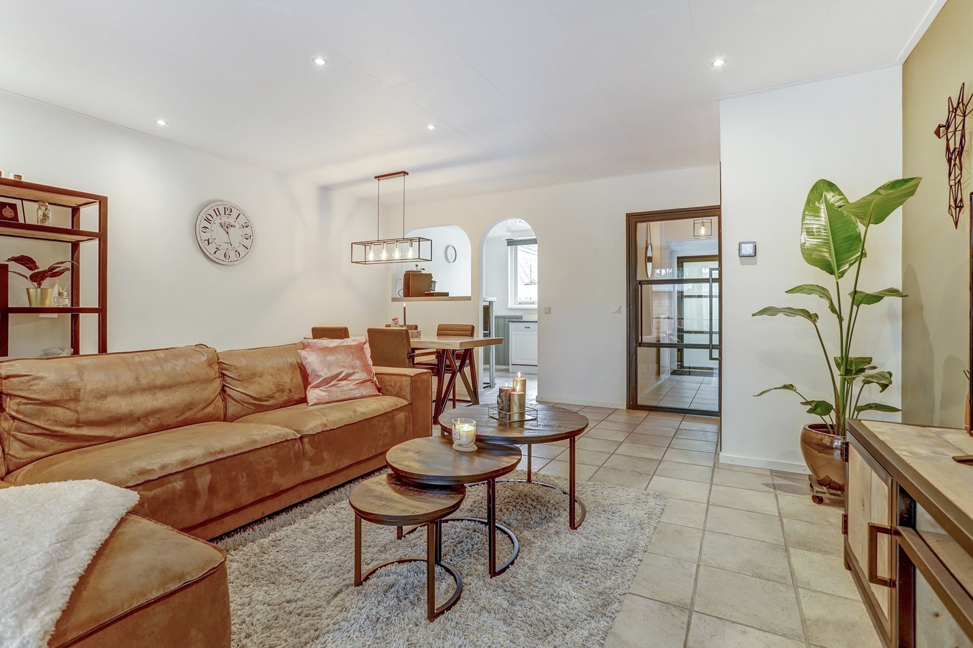 je voelt de verbinding met de keuken, maar ook met buiten en de uitbouw. Alles loopt hier naadloos in elkaar over! En niet te vergeten de afwerking, want deze is fris en neutraal gehouden, met een lichte tegelvloer, neutrale wanden en een plafond met inbouwspots.