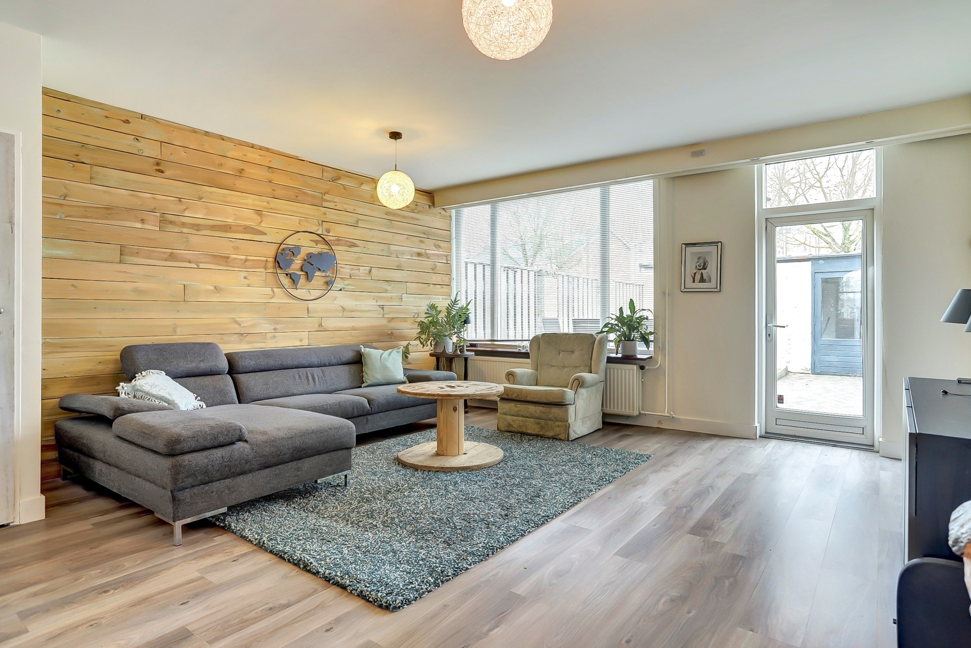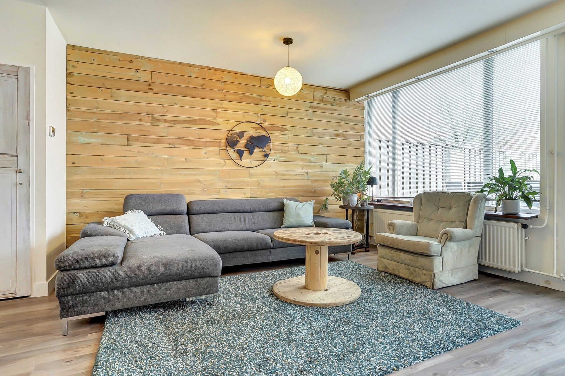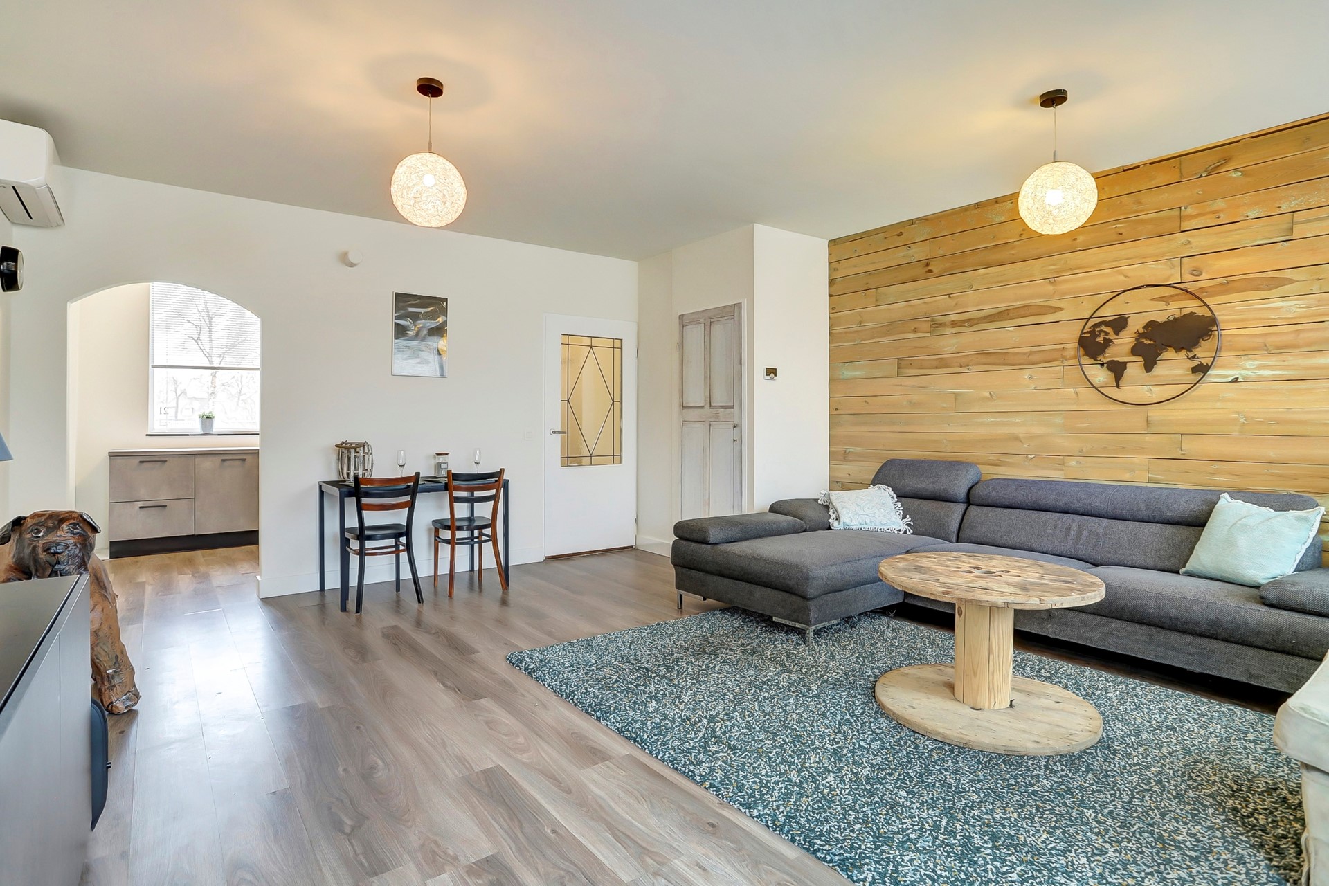 De woonkamer is afgewerkt met dezelfde laminaatvloer als de hal, waardoor alles één geheel voelt. Strakke wanden en plafond geven rust, en een wand met sfeervolle houten afwerking zorgt voor een warm en speels accent.