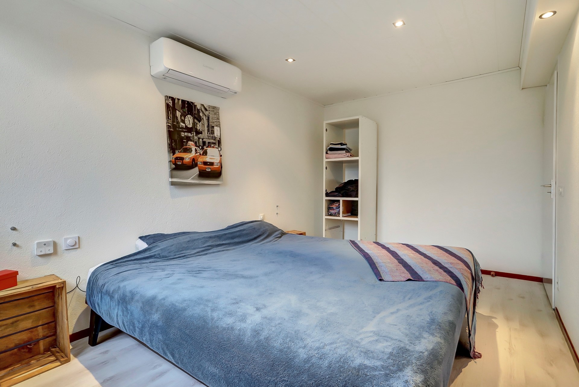 De master bedroom is gelegen aan de achterzijde van de woning en is royaal van opzet. Er is met gemak ruimte voor een tweepersoonsbed en een grote kledingkast. De grote raampartij met draai-kiepramen, uitgevoerd in kunststof kozijnen met dubbele beglazing, zorgt voor volop daglicht en goede ventilatie. Daarnaast beschikt de kamer over een praktische airco (2021), zodat je hier ook tijdens warme zomernachten heerlijk koel slaapt.