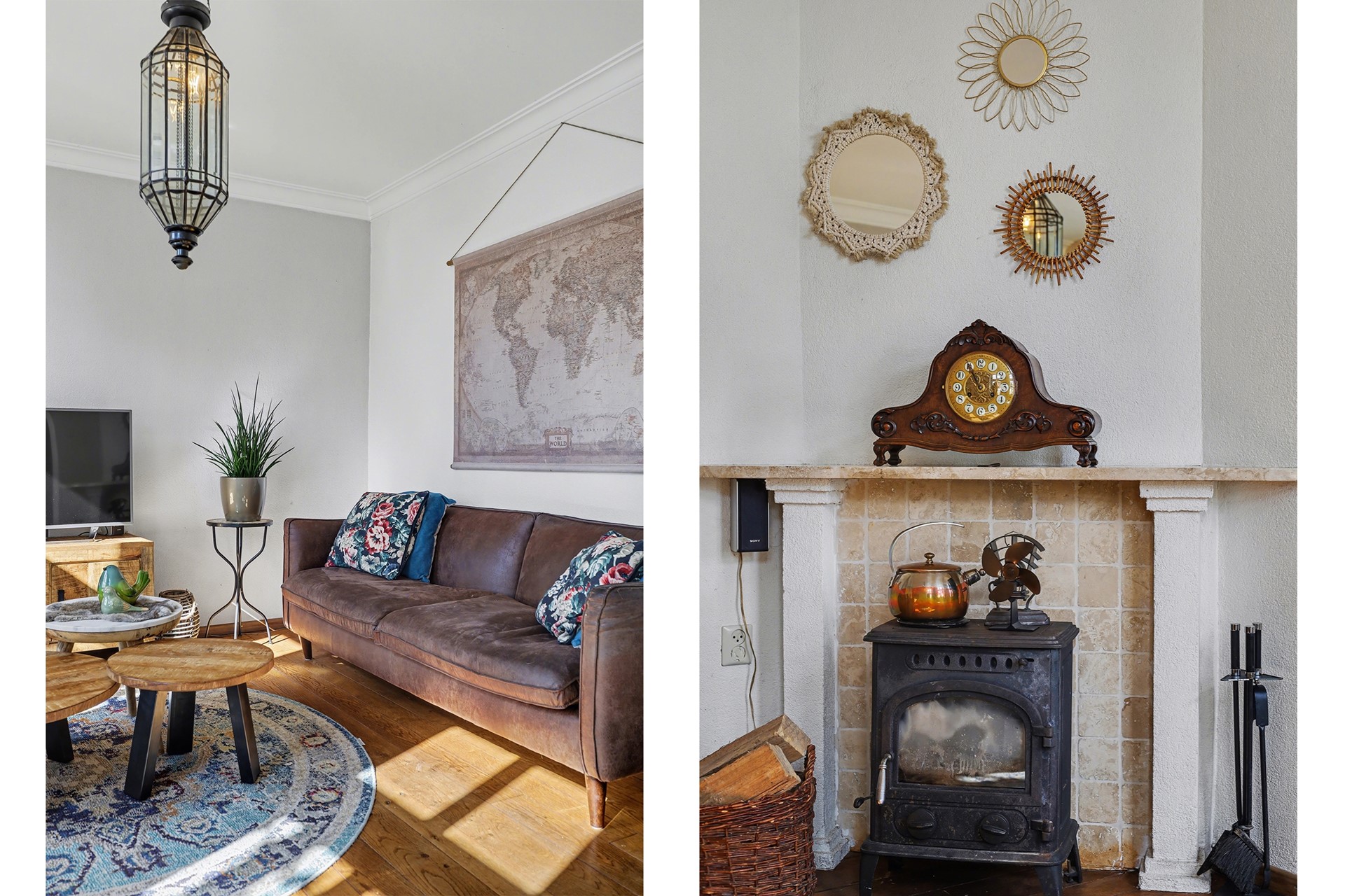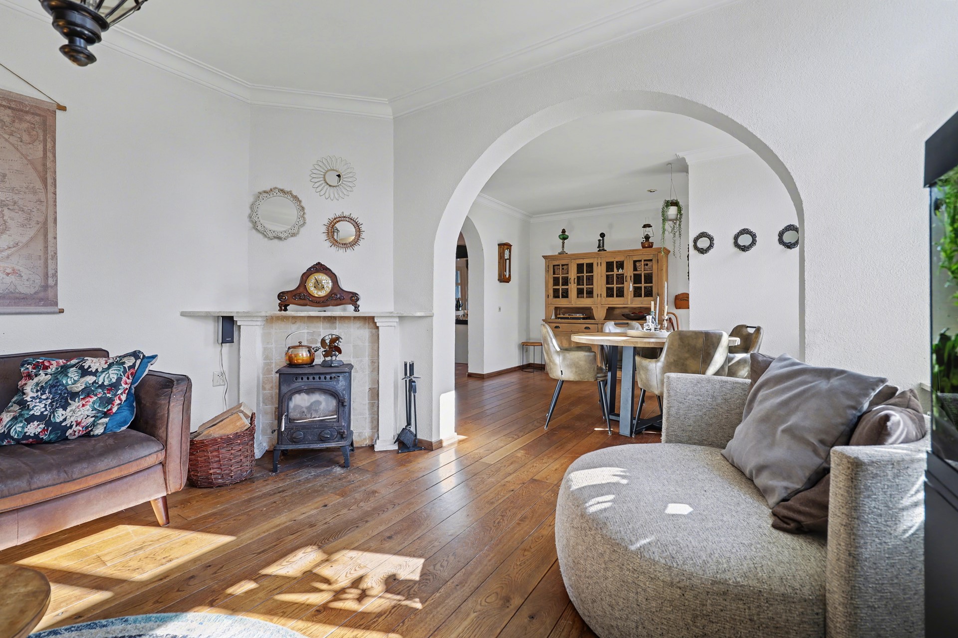 Het tweede deel van de woonkamer vormt een comfortabele zithoek met houtkachel, elegant verwerkt tegen de schouw. Voordat we door de charmante boog de eetkamer in lopen, nemen we je nog even mee naar de voordeur. Hier vind je een handige garderobenis en de meterkast, subtiel weggewerkt maar altijd binnen handbereik.