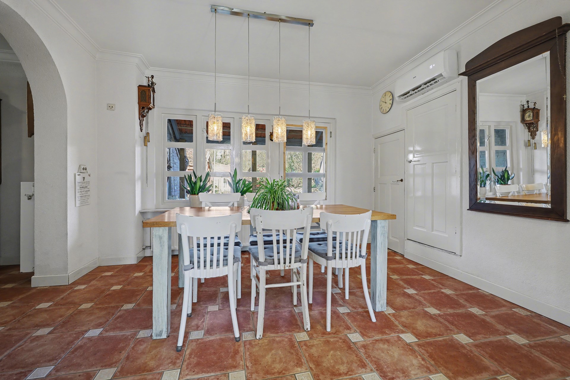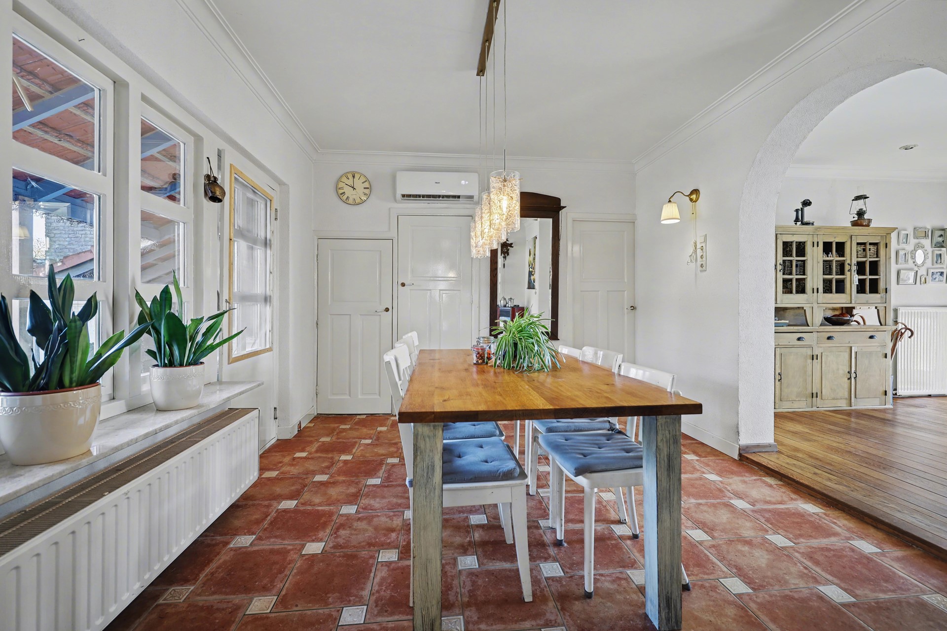 De eetkamer heeft een fijne basis en de authentieke details zijn prachtig behouden, zoals de paneeldeuren en de charmante raampartij met deur naar de tuin. De vloertegels geven de ruimte karakter en lopen naadloos door richting de keuken, wat zorgt voor eenheid en rust. De spachtelputz wandafwerking en de plafonds met elegante sierlijsten maken het geheel compleet. Het is hier heerlijk vertoeven bij de pelletkachel of met de airco aan op warme dagen.