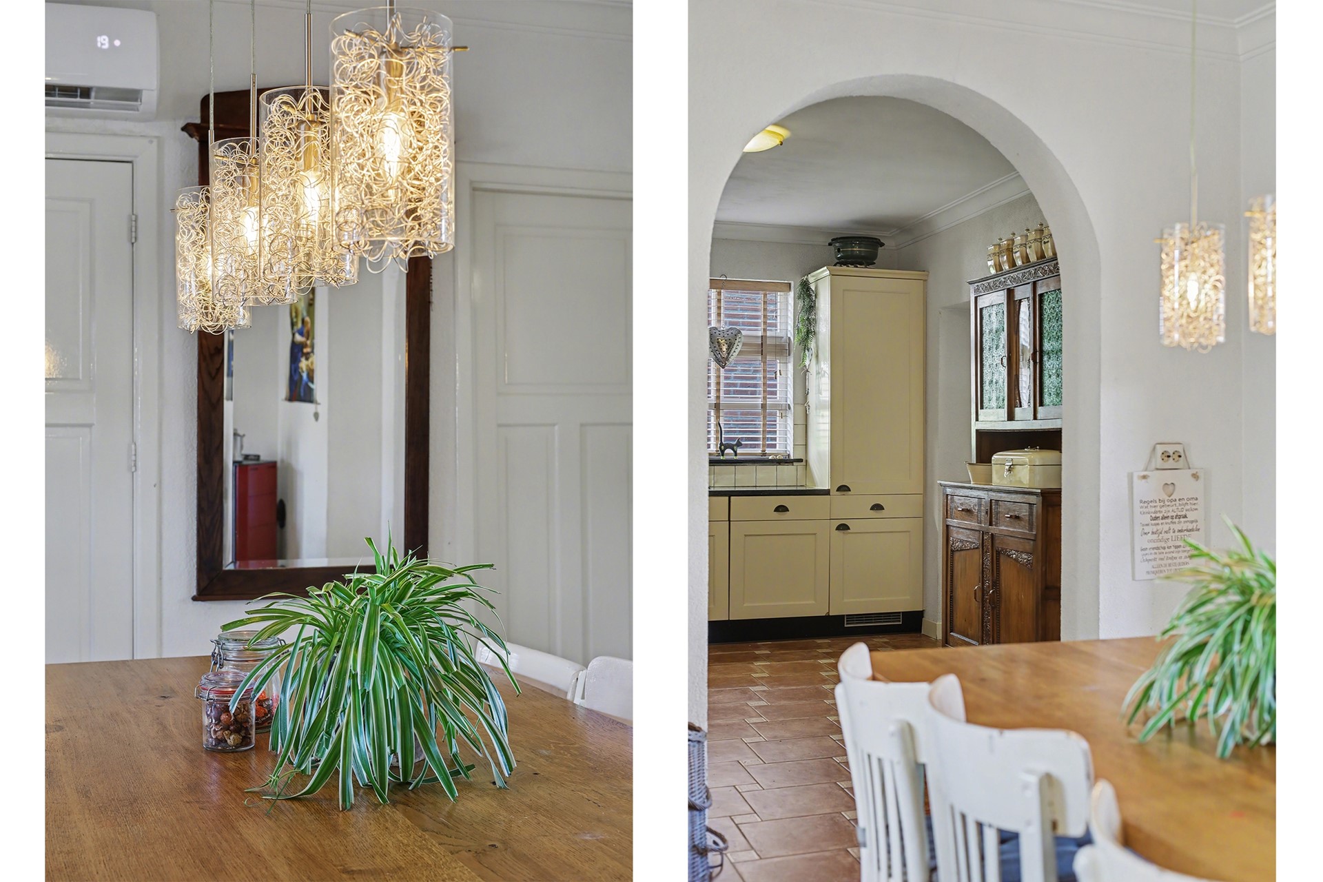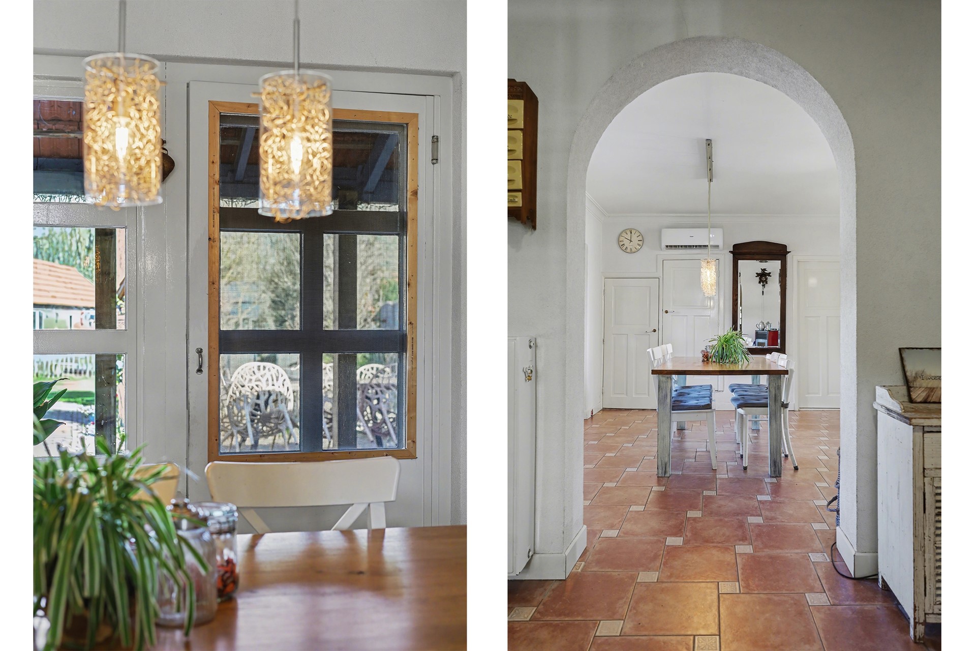 Verbinden, dat is het sleutelwoord! De eetkamer vormt het hart van dit huis, een plek waar leven en gezelligheid samenkomen. Vanuit deze ruimte loop je moeiteloos onder de overkapping de heerlijke tuin in, of ga je door de charmante boog rechtstreeks naar de keuken, waar koken bijna vanzelf onderdeel wordt van het samenzijn.