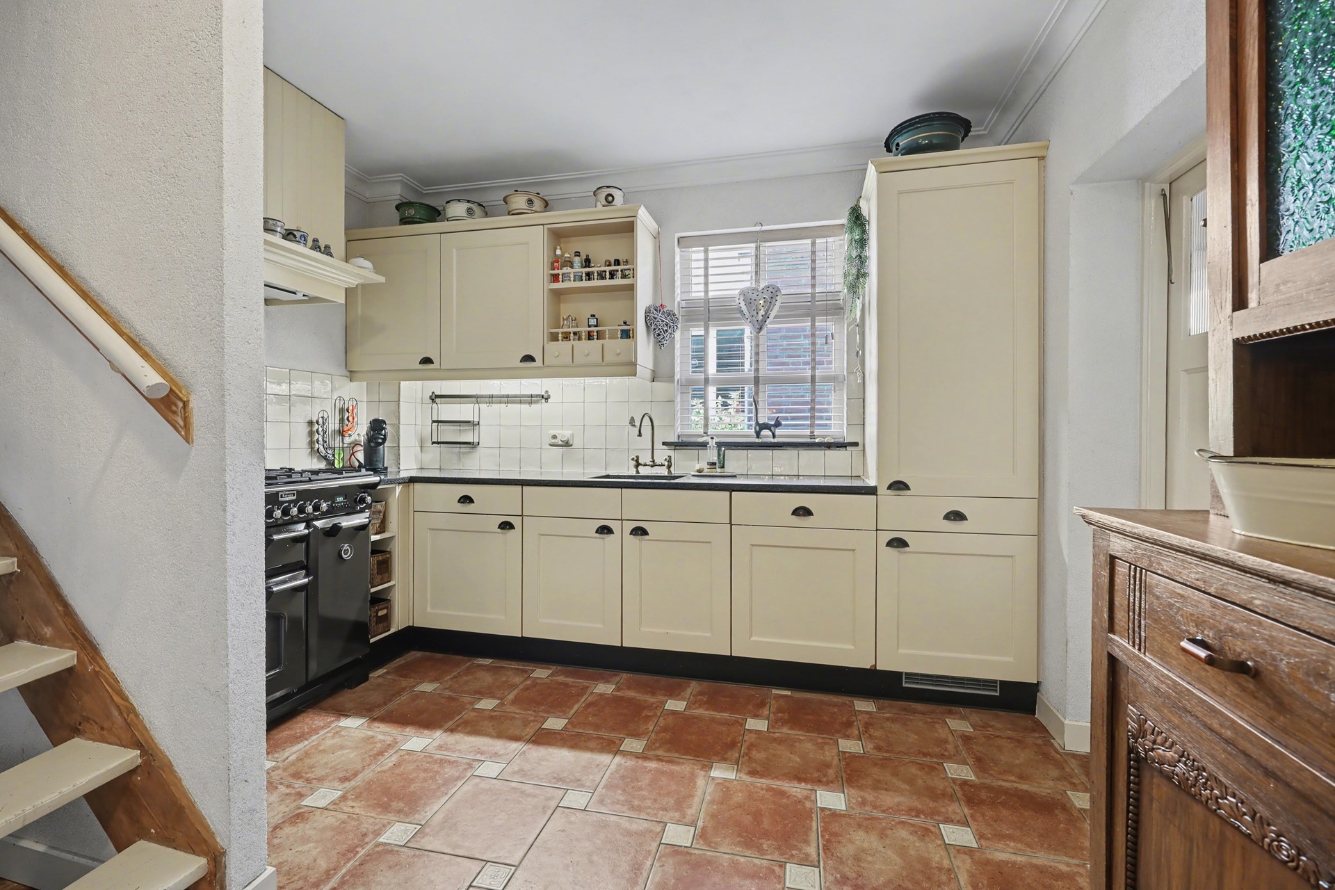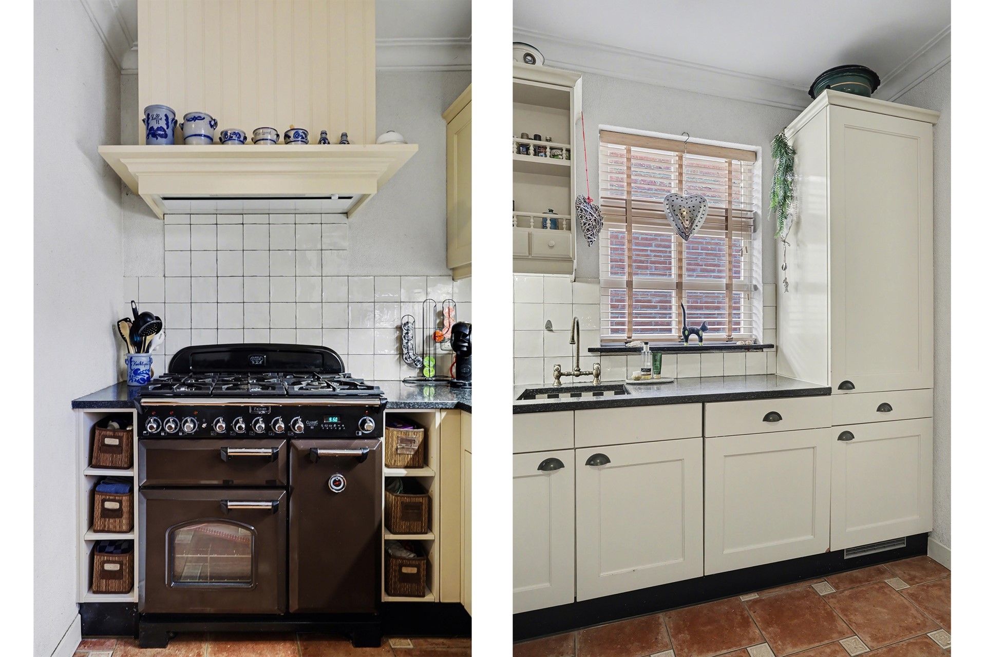Het hart van de begane grond wordt gevormd door de leefkeuken: een op maat gemaakte, landelijke houten keukeninrichting uit 2010, afgewerkt met een granieten werkblad en stijlvolle wandtegeltjes. Het Boretti-fornuis en de elegante spoelbak vormen echte blikvangers. Het fornuis is voorzien van twee ovens, een grill, vier pitten en een wokbrander. Daarnaast beschikt de keuken over de nodige kastruimte, een koelkast, vaatwasmachine en een afzuigschouw.