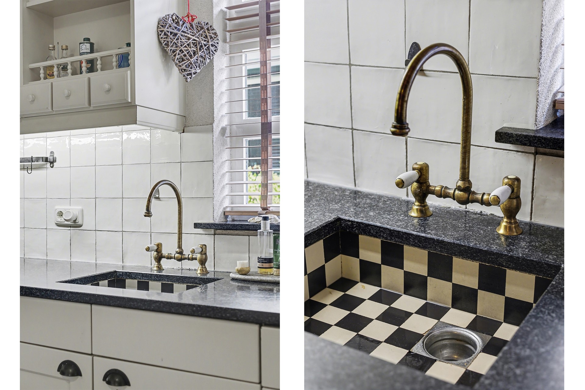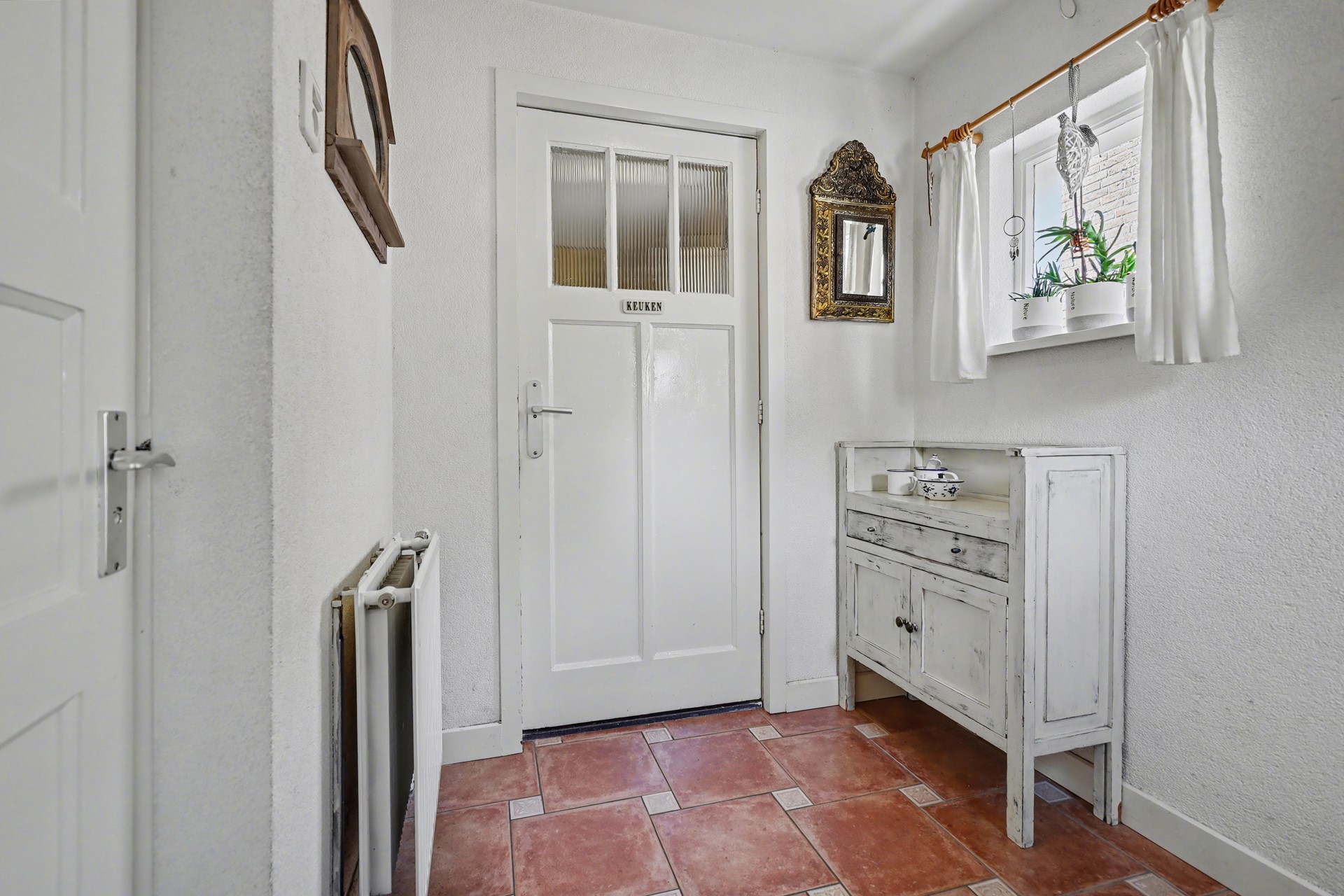 Vanuit de keuken loop je zo door naar de achterom. Ook hier is alles stijlvol doorgetrokken, met als sfeervol detail de charmante achterdeur.