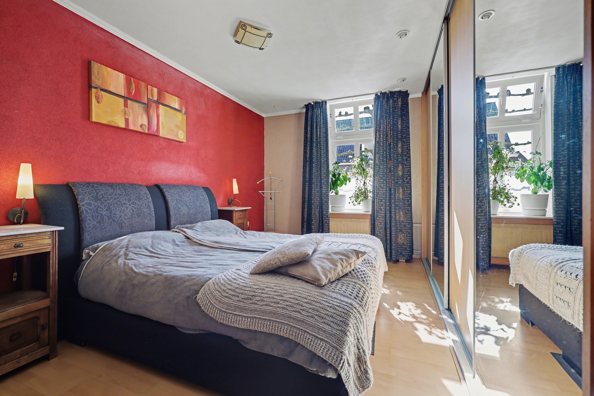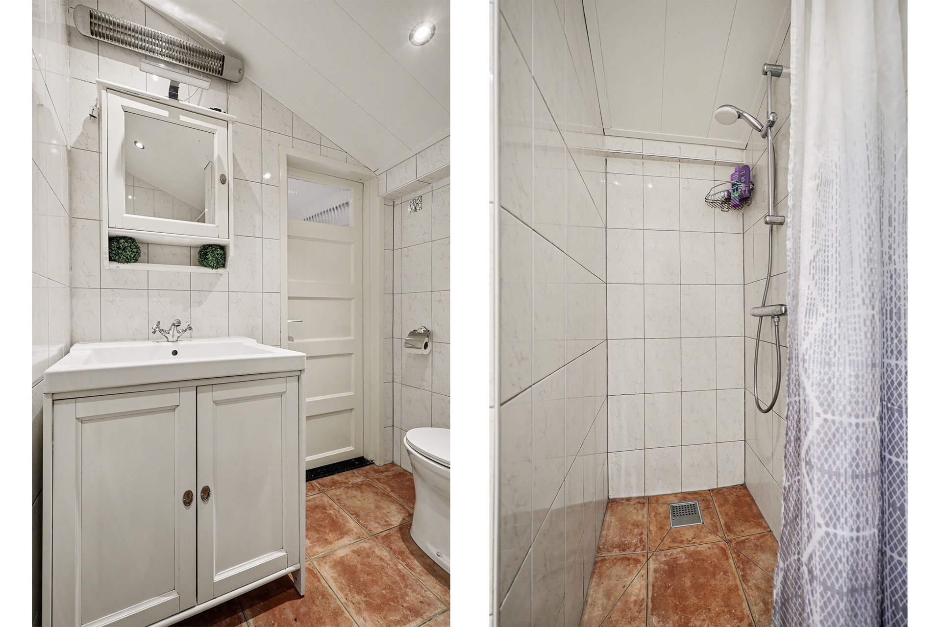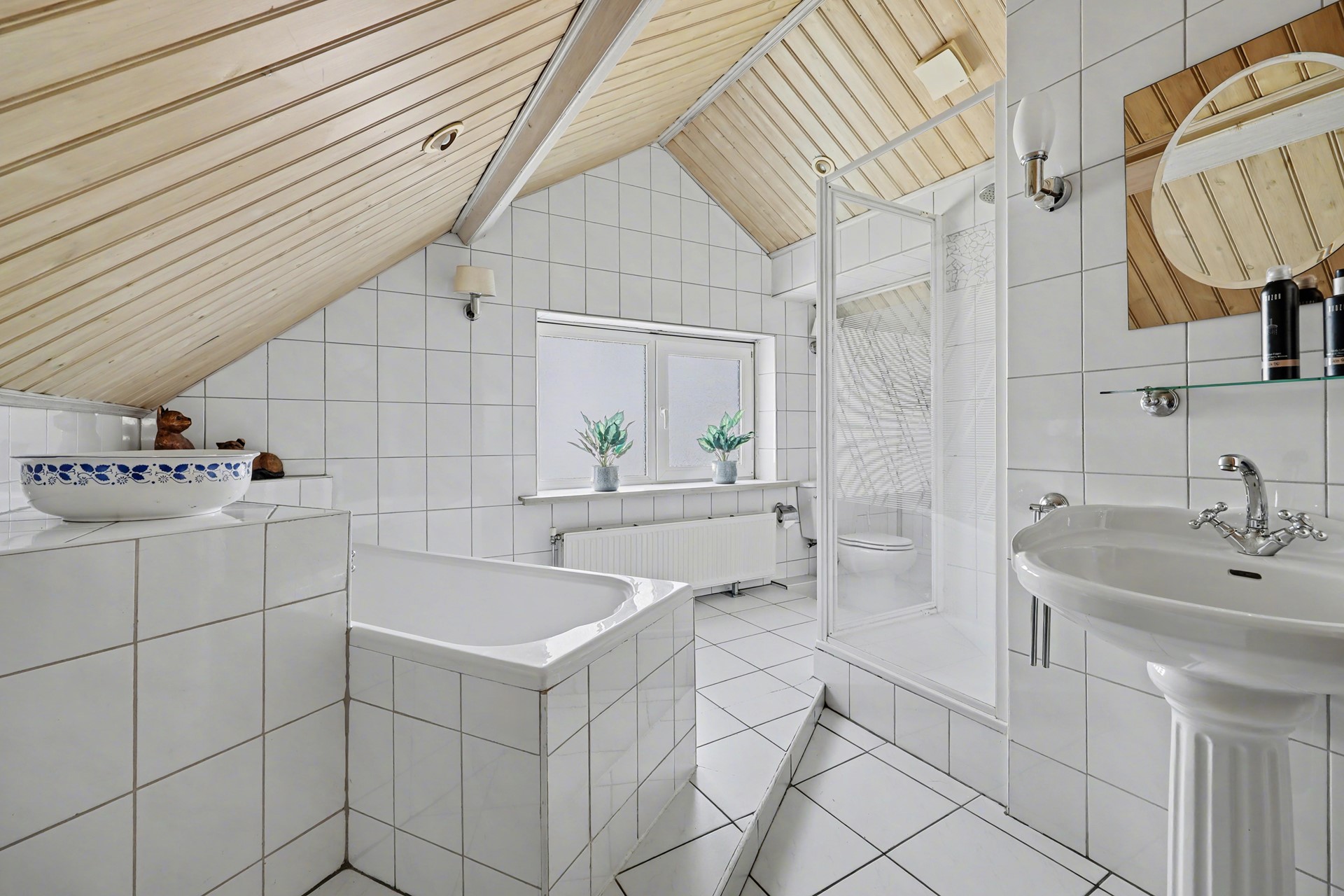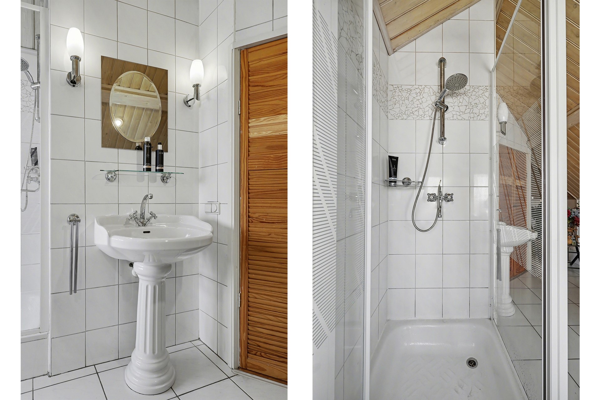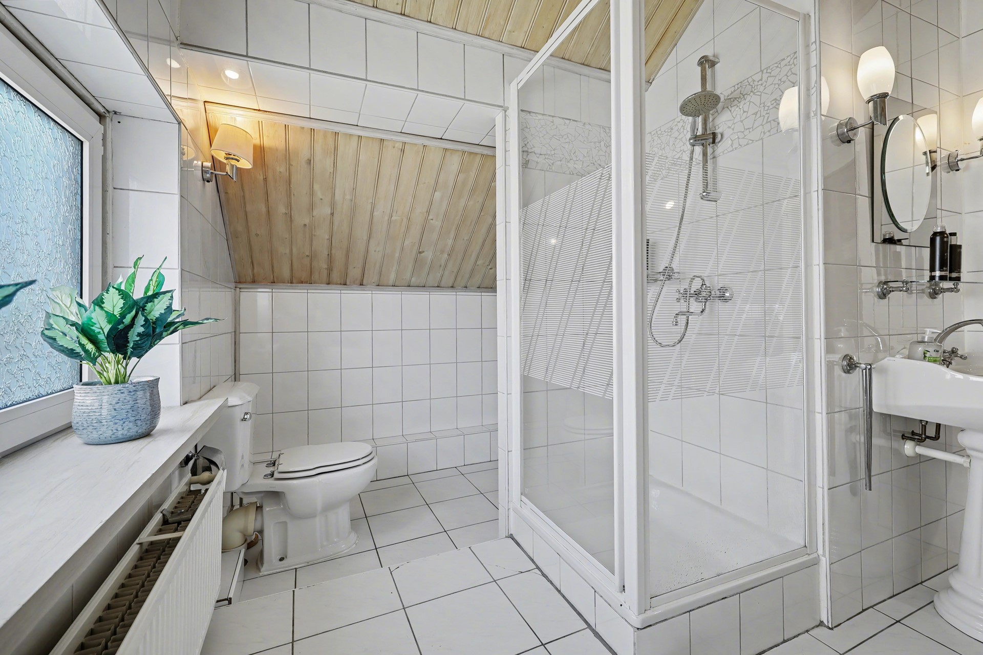 Het ligbad trekt meteen de aandacht, omdat het op een verrassende plek in de ruimte is geplaatst. Daarnaast vind je hier een toilet, een stijlvol vrijstaande fontein, een praktische douchecabine en een spiegelwand, die samen zorgen voor een functionele badkamer. De ruimte beschikt over een radiator en mechanische ventilatie. Een leuke extra: onder één van de schuine kanten vind je een deur naar nog meer bergruimte.