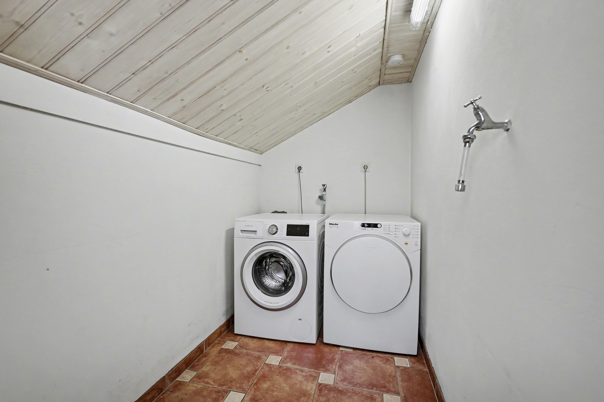 Via een subtiele verlaging bereik je de wasruimte, die in dezelfde stijl is afgewerkt en beschikt over de aansluitingen voor de wasmachine en droger.
