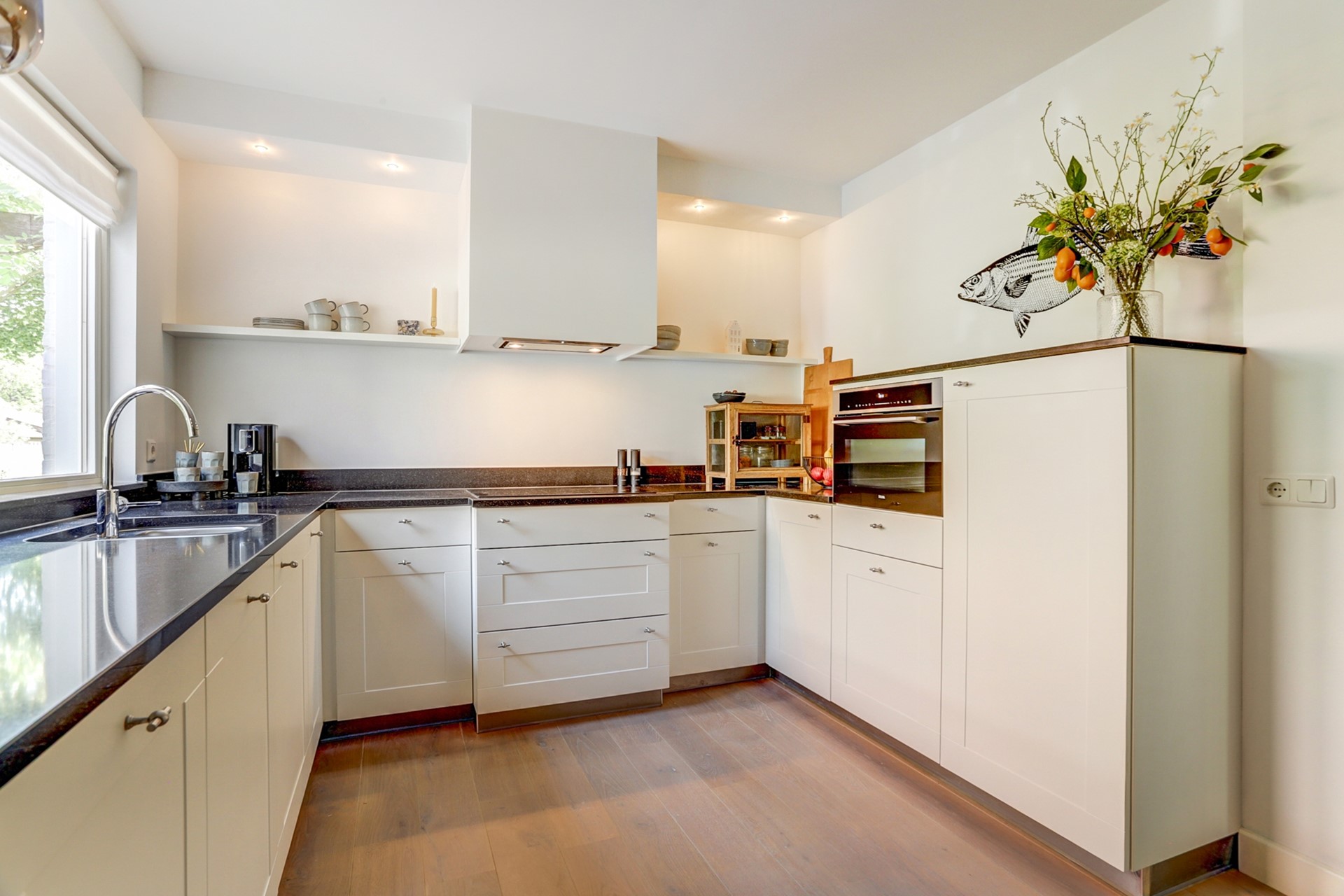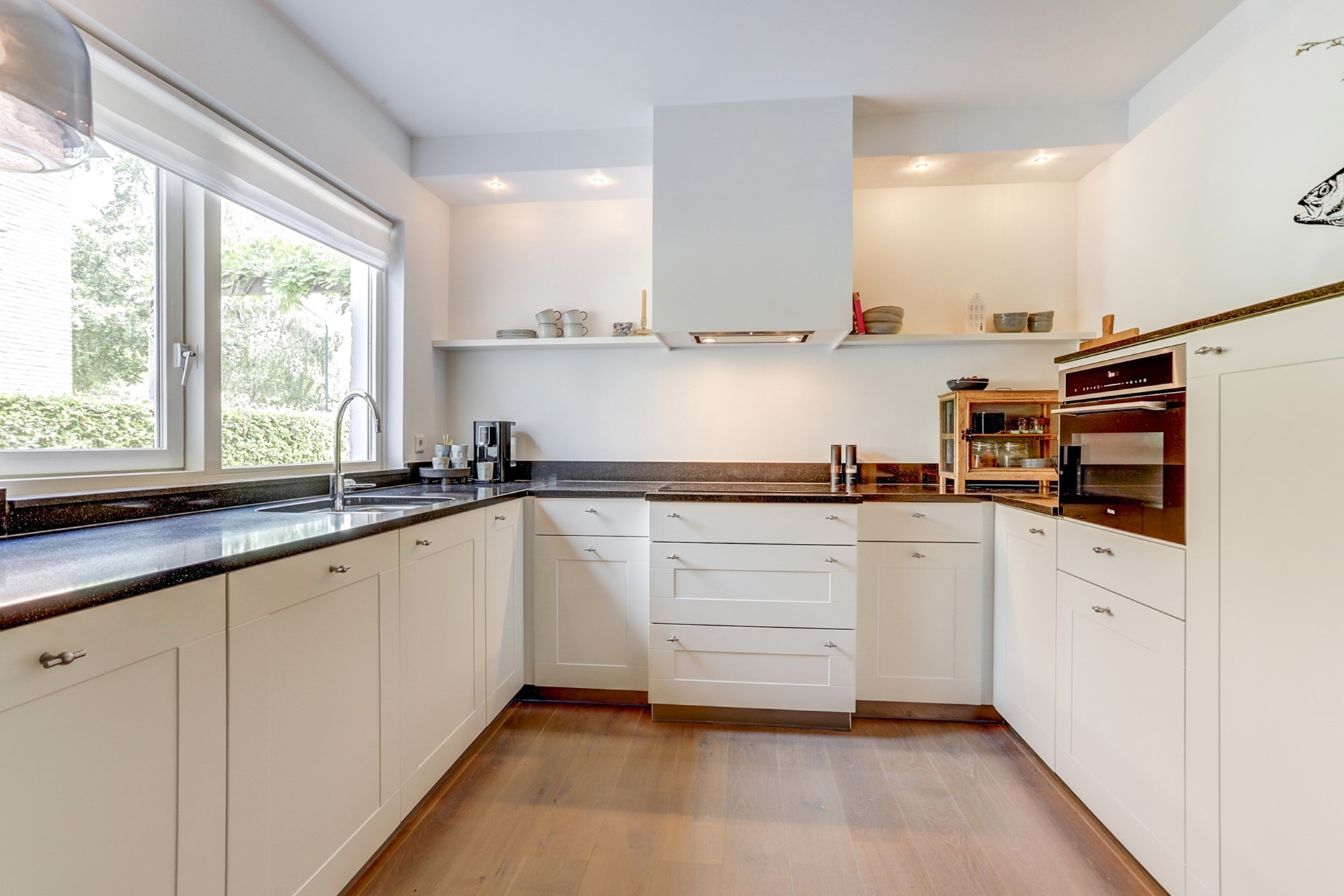 Via de woonkamer loop je zo door in de keuken, ook hier vind je dezelfde prachtige houten vloer terug. De keuken is geplaatst in een royale U-opstelling en biedt daarmee dan ook meer als voldoende werkblad ruimte, zodat jij hier de lekkerste gerechten kunt bereiden!