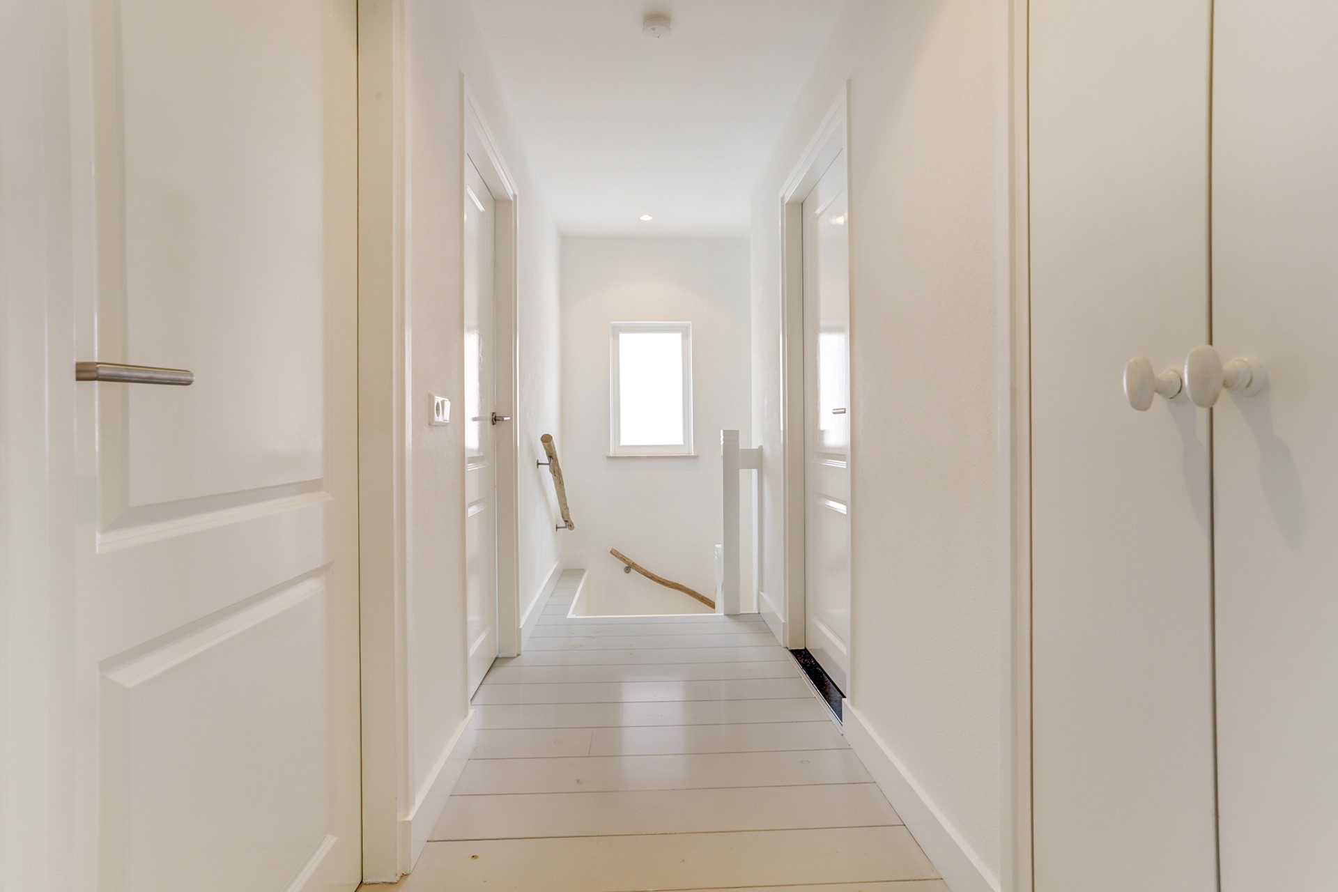 Via vaste trap bereik je de overloop met toegang tot drie slaapkamers en moderne badkamer. De overloop is afgewerkt met een grenen houten vloer, stucwerk wanden en plafond. Hier bevindt zich ook een inbouwkast ideaal voor bijvoorbeeld een stofzuiger en beddengoed.