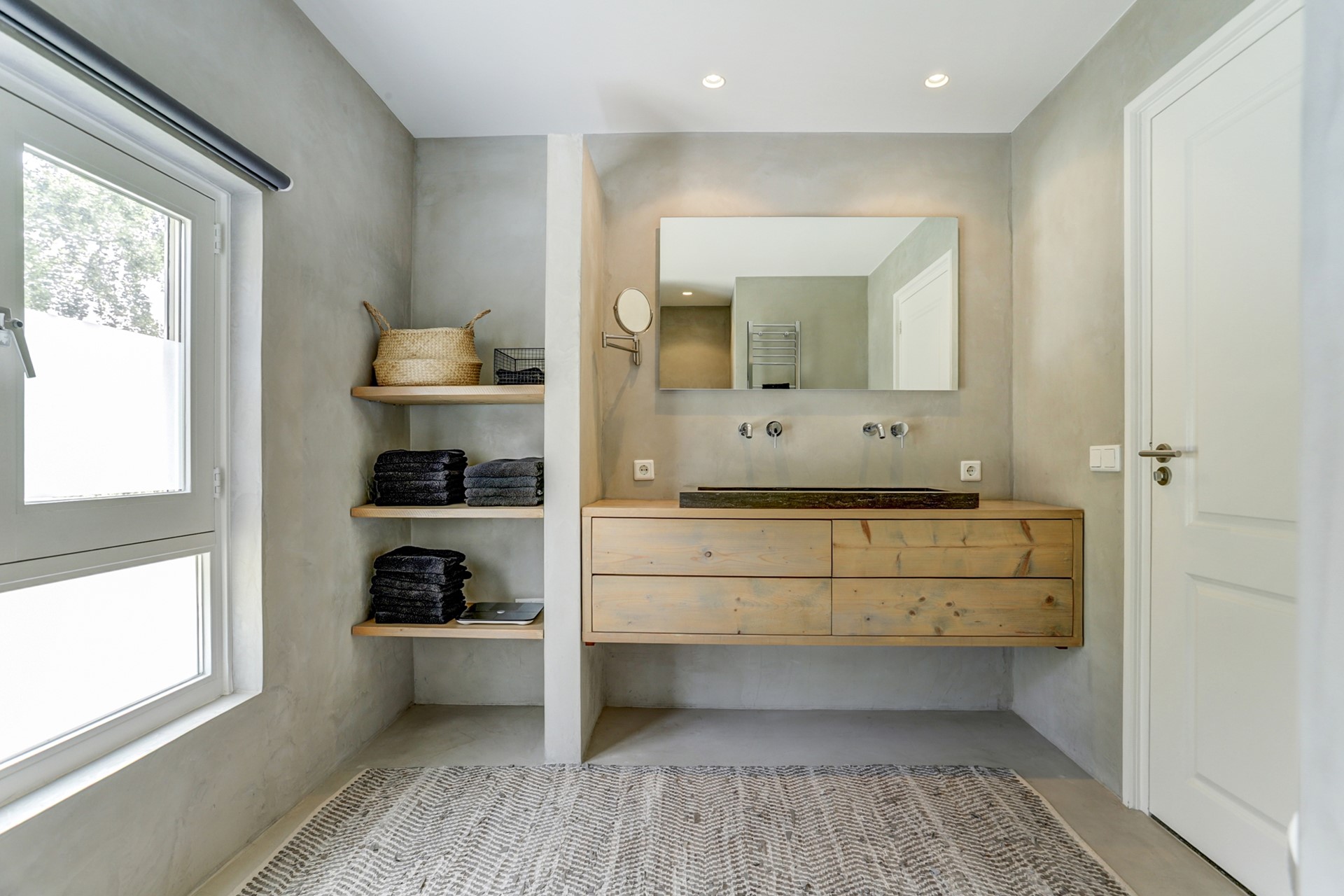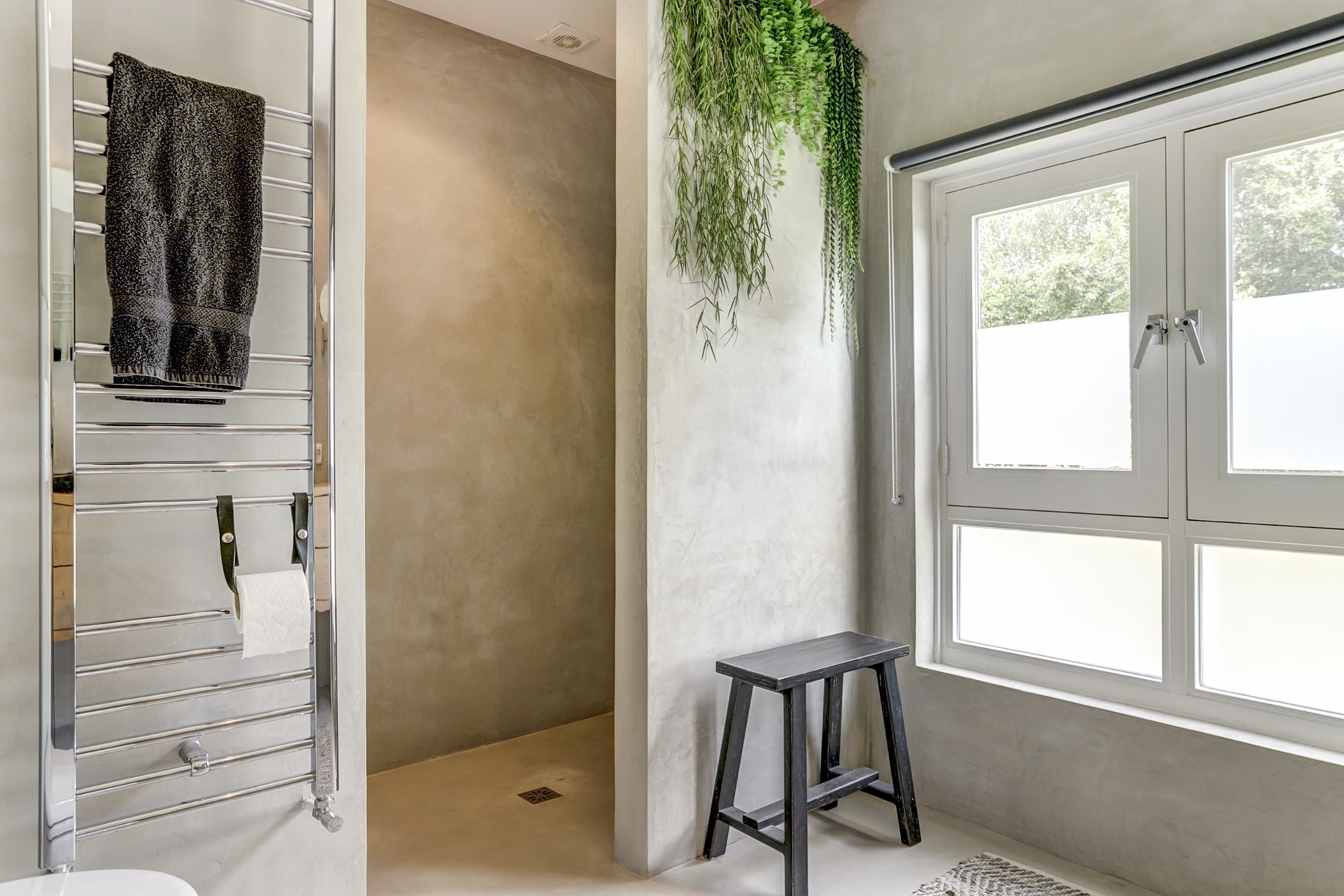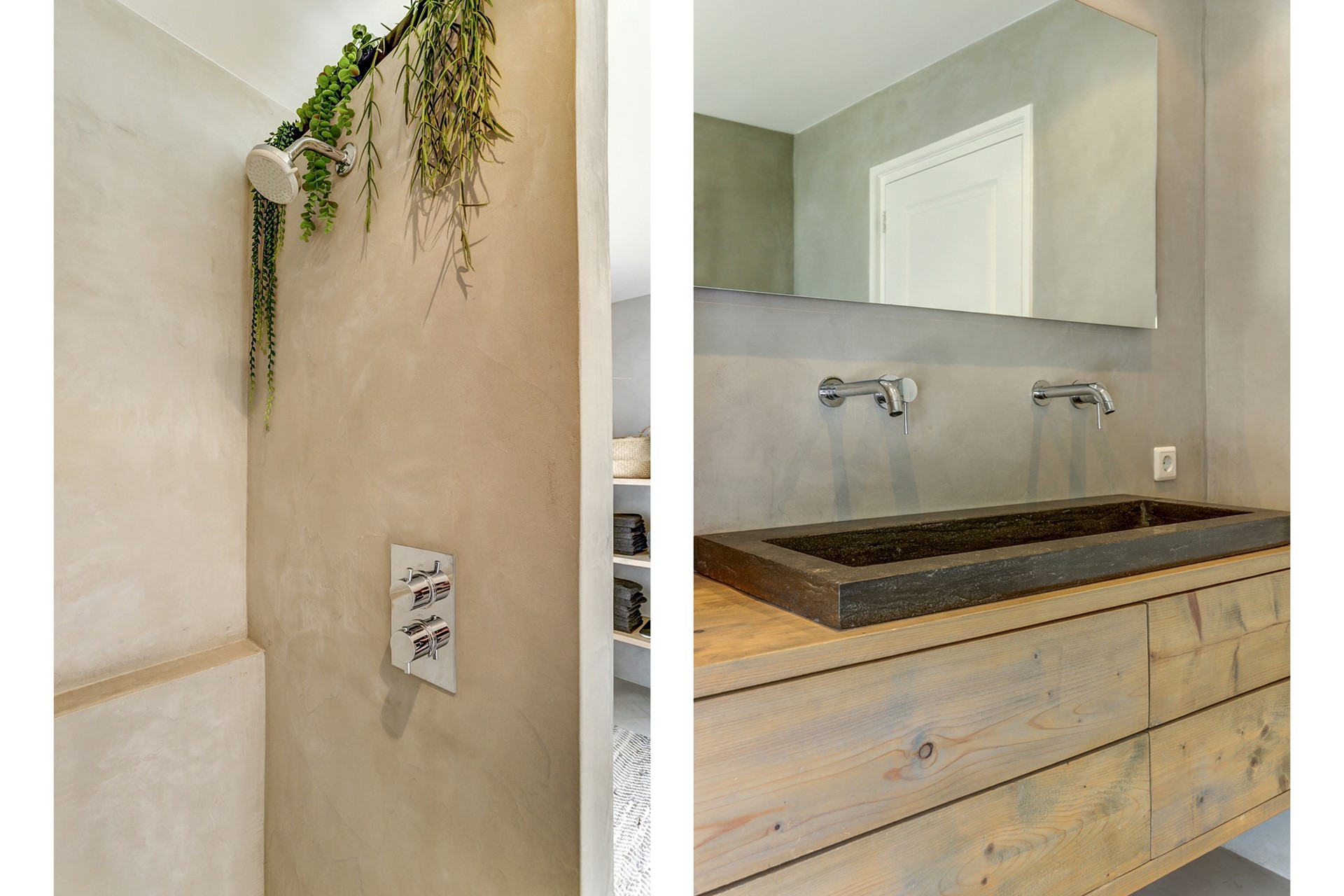 De gehele badkamer is voorzien van betonstuc vloer en wanden voor een industriële touch. Daarnaast is er een royale inloopdouche met mechanische ventilatie en een hangcloset alsmede een groot houten badmeubel met hardstenen wastafel met dubbele inbouwkranen. Links van de wastafel bevindt zich opbergruimte, extra handig voor de opslag van handdoeken en een wasmand. Het grote raam aan de voorzijde zorgt voor voldoende daglicht én ventilatie.