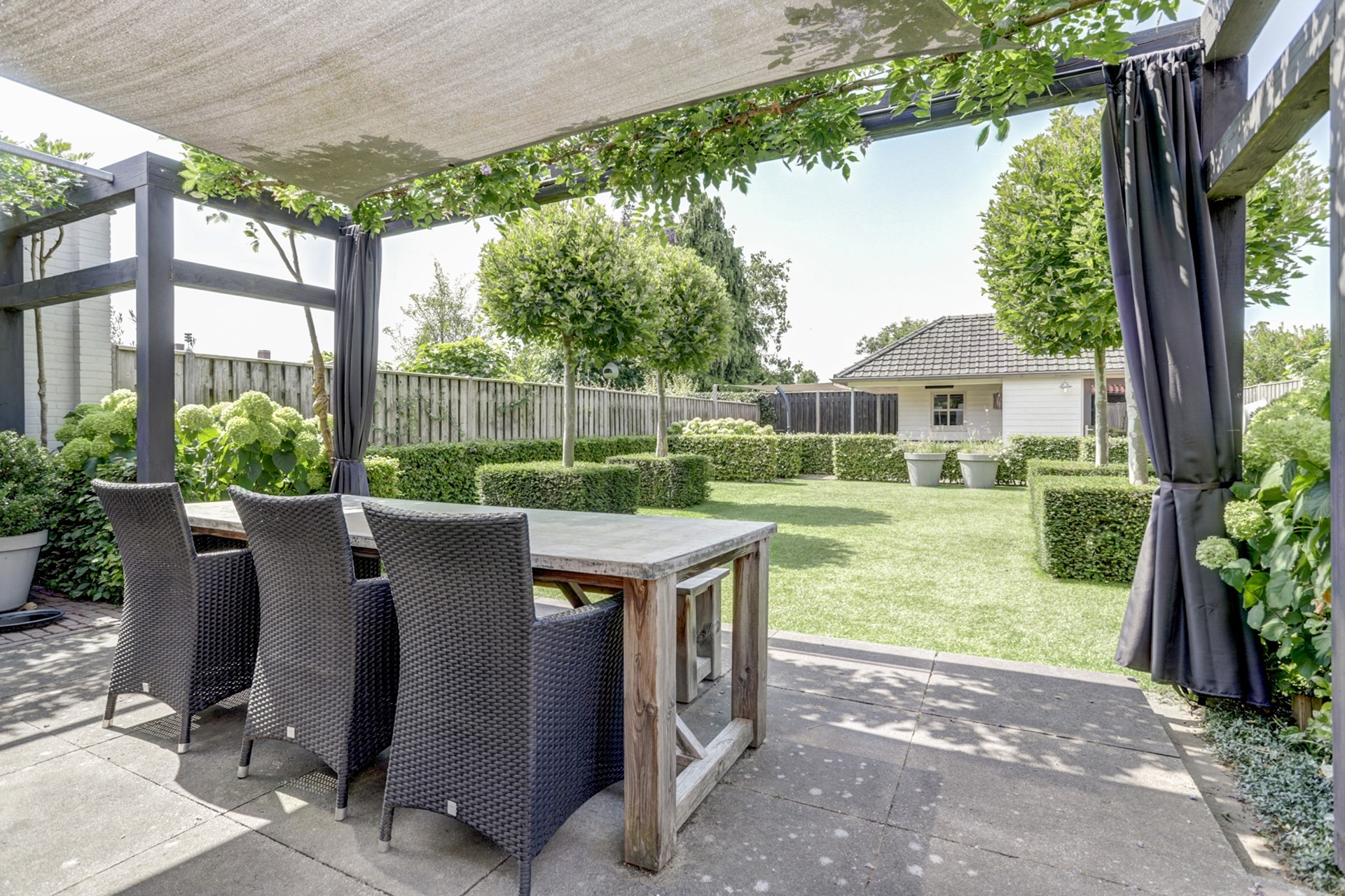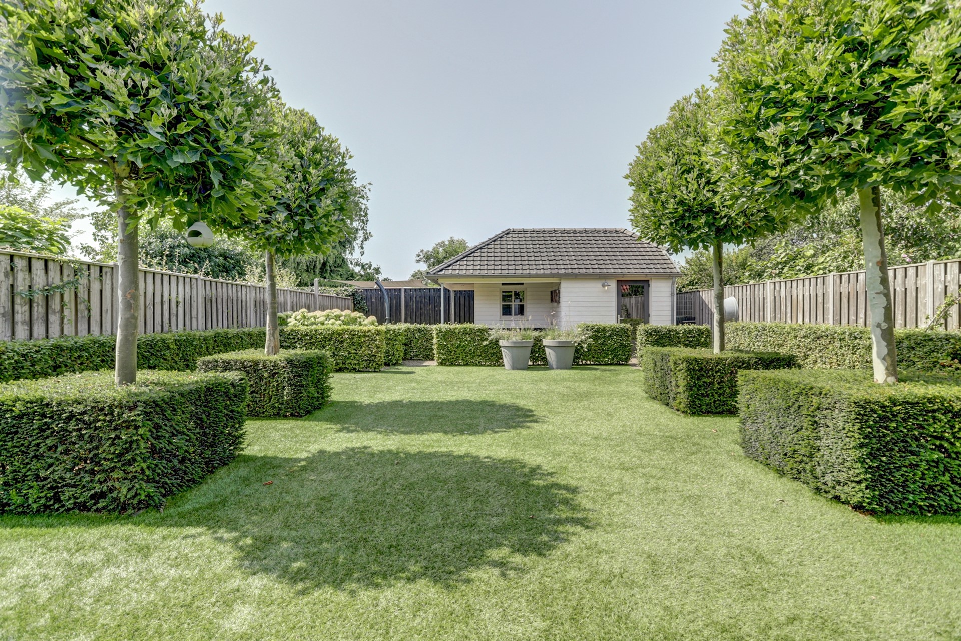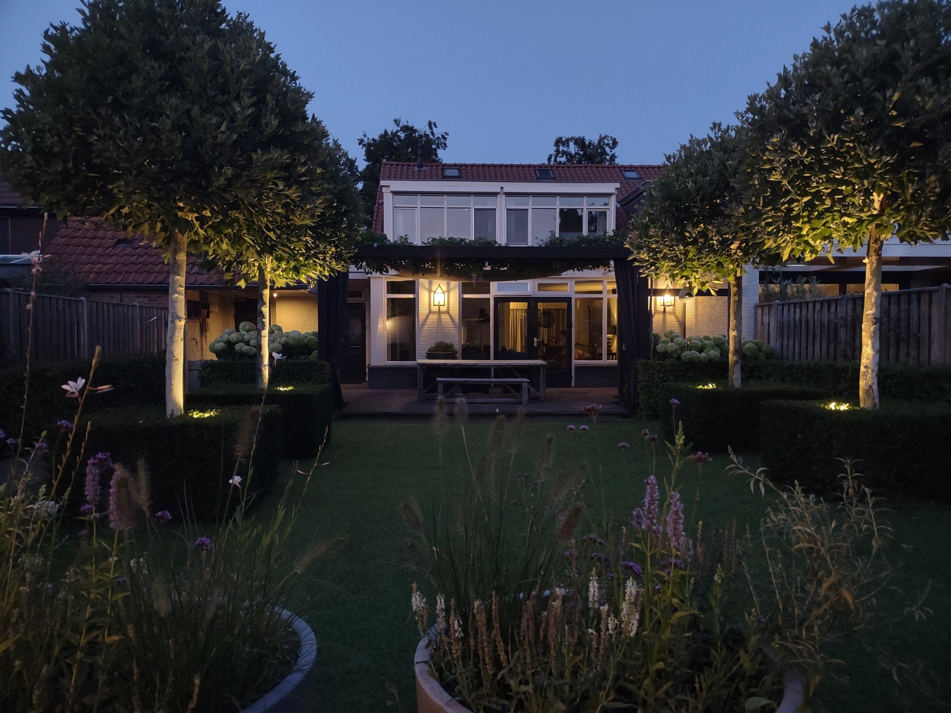 De tuin is voorzien van diverse beplanting en een groen stuk gazon (kunstgras), wat zorgt voor een fijne uitstraling. Ook is er een beregeningsinstallatie aanwezig (grondwaterpomp en pop up sproeiers). Ook ‘s avonds is het genieten in de sfeervol verlichte achtertuin. Als kers op de taart is er zelfs een buitendouche, ideaal om even af te koelen op warme zomerdagen.