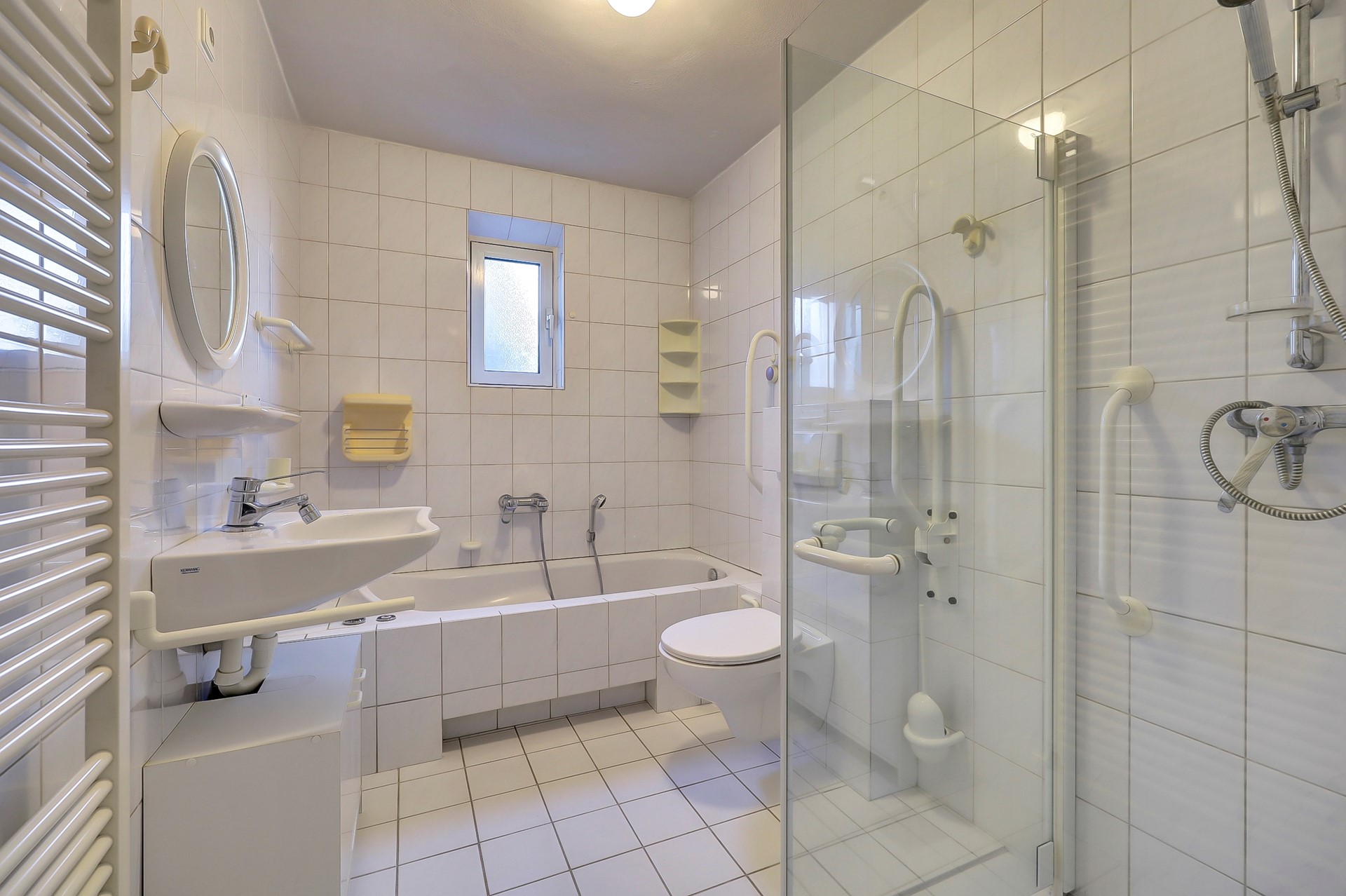 De badkamer is volledig betegeld in een neutrale witte kleur en beschikt over een ligbad, een separate douche met glazen deur, een wastafel, een hangtoilet en een designradiator. Laat hier je fantasie de vrije loop en maak hier jouw droom badkamer van.