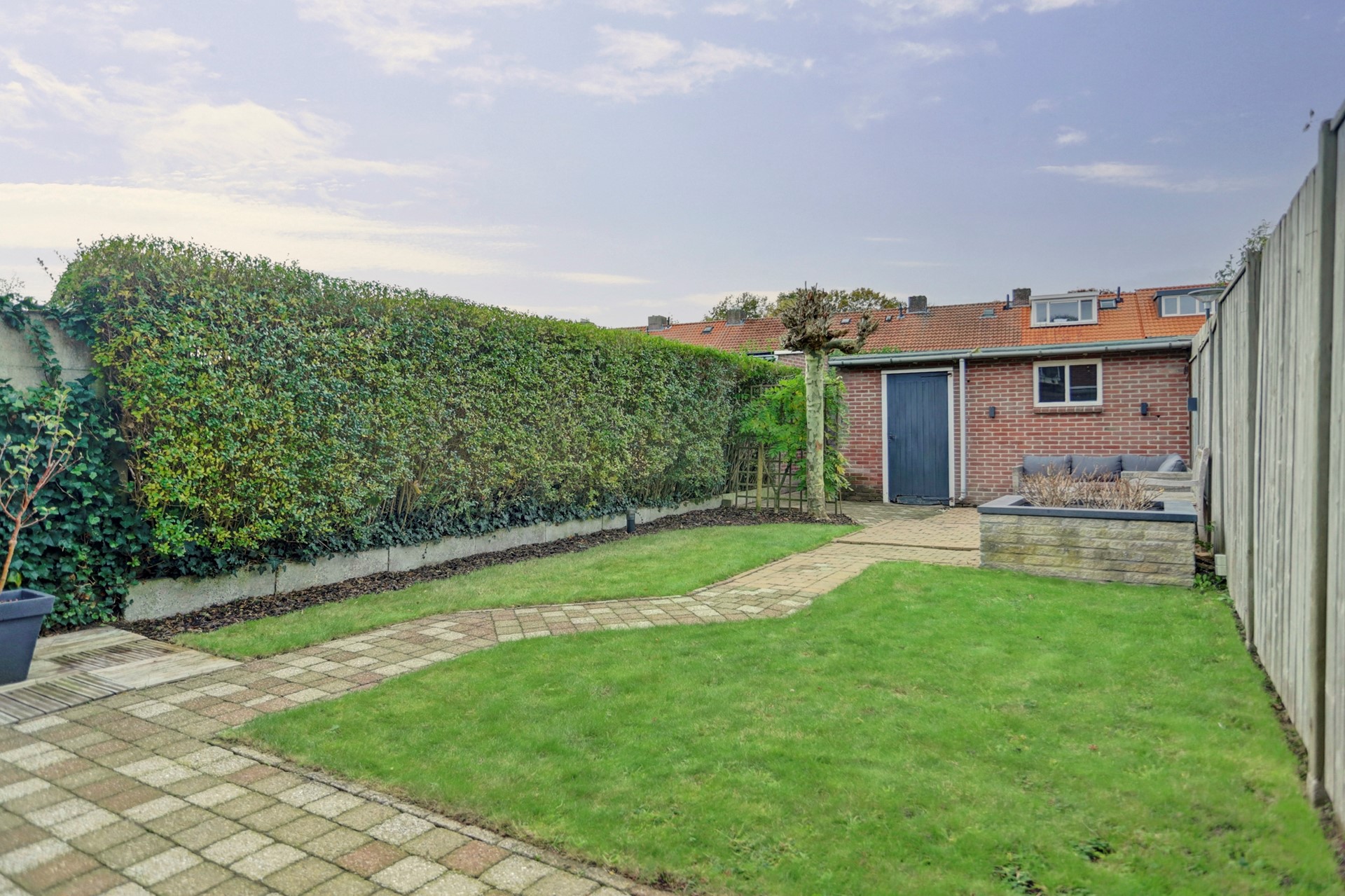 De achtertuin is gelegen op het zonnige westen en is grotendeels voorzien van gras, bestrating en diverse beplanting. Via het looppad bereik je de berging en de achterom, wel zo ideaal om met je fiets achterom te komen.