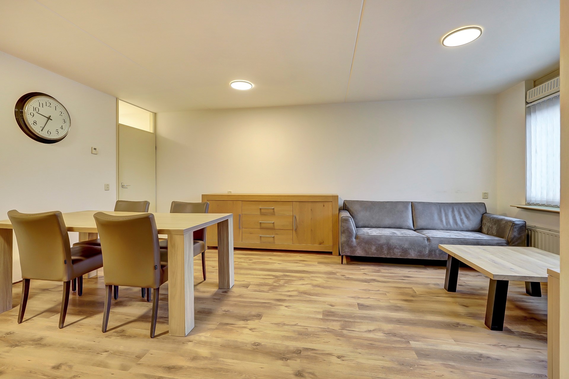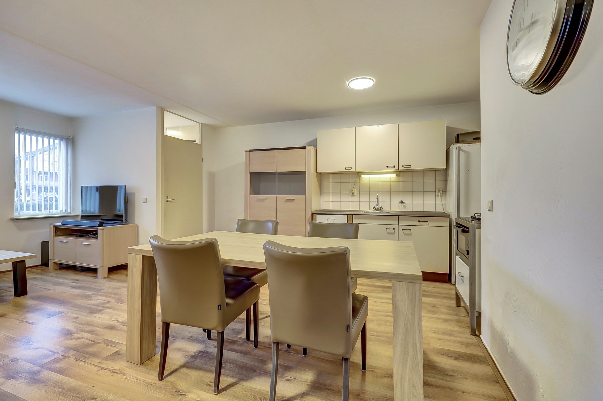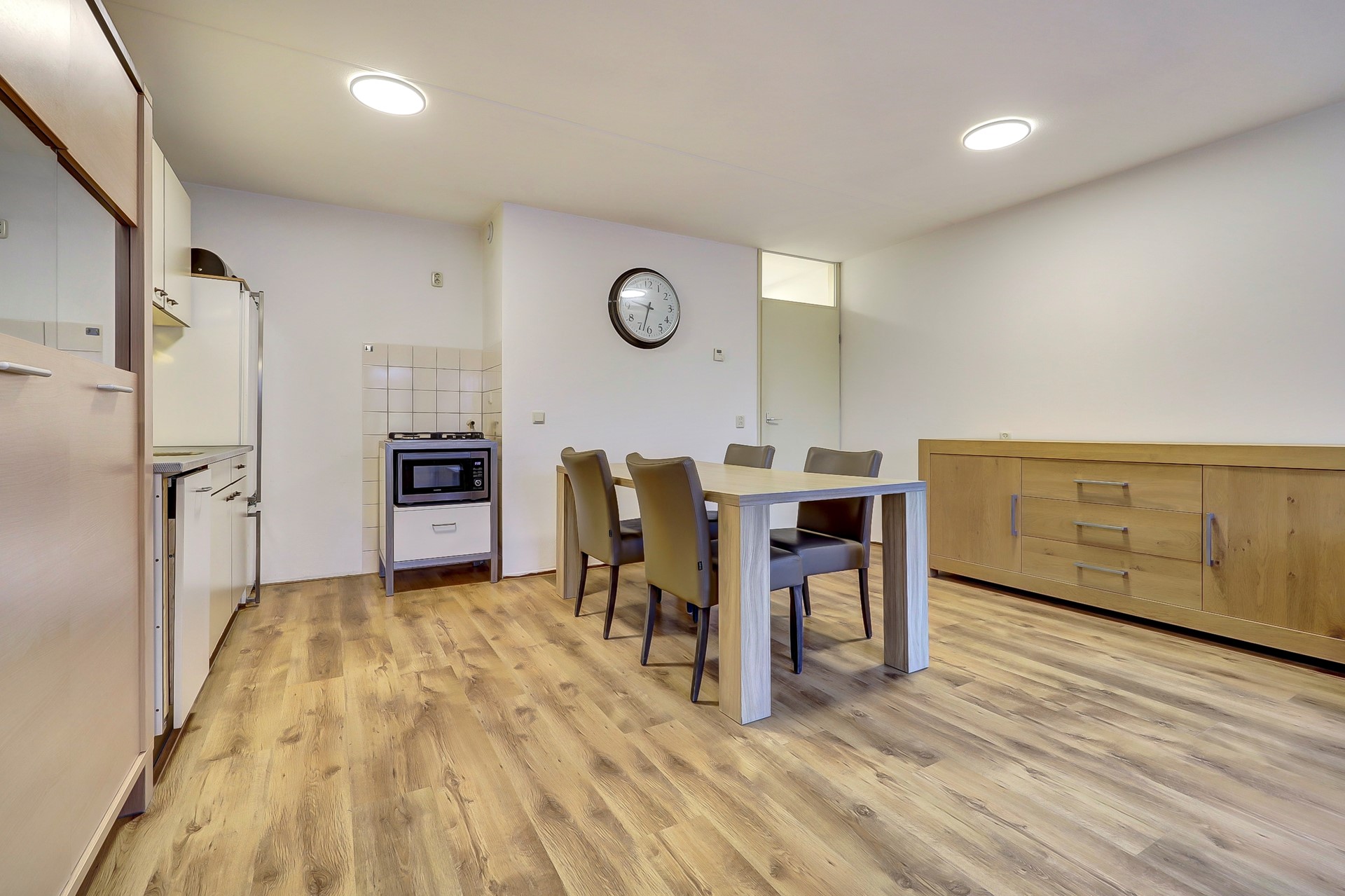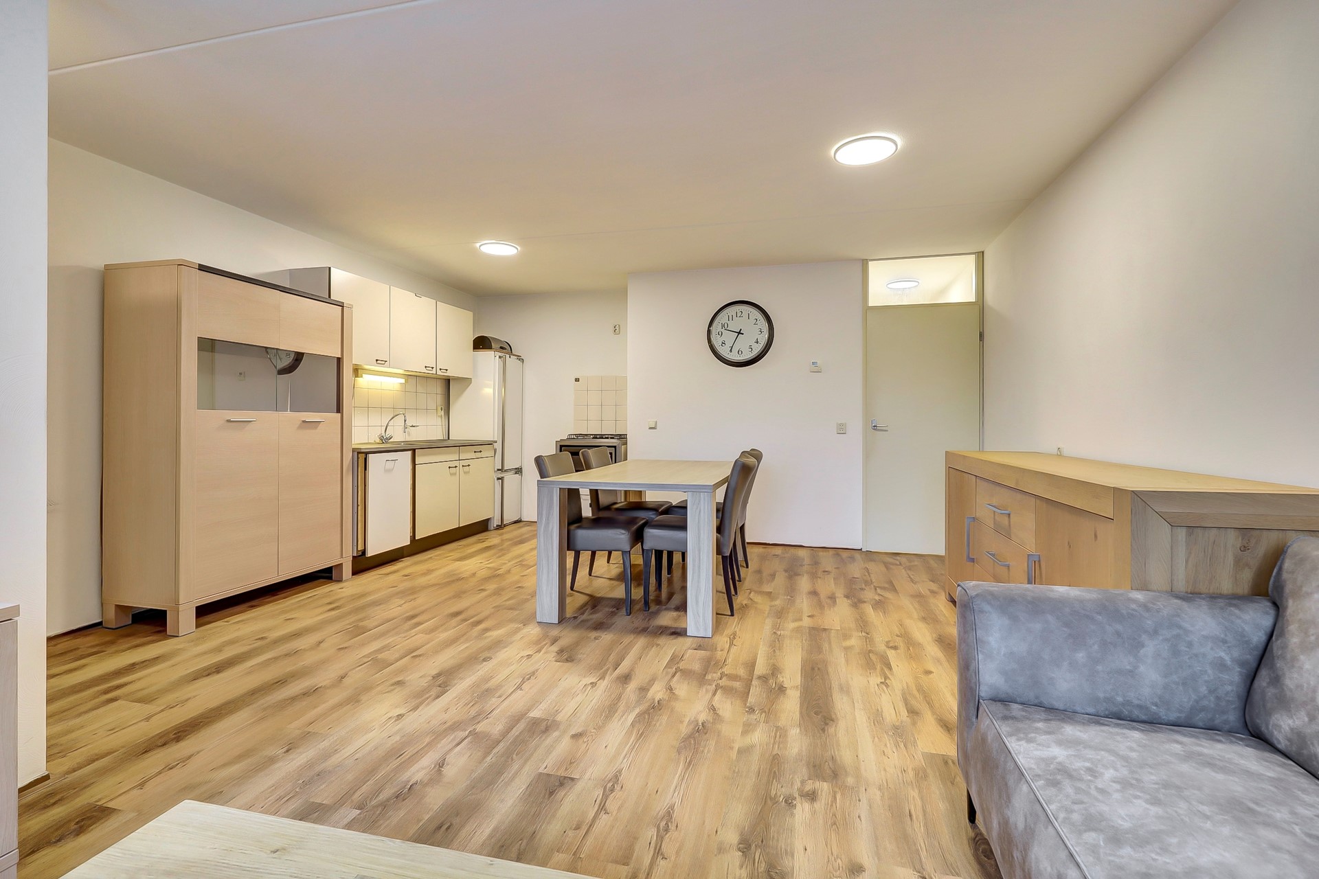 De lichte woonkamer is een hele fijne plek om thuis te komen na een lange dag. De woonkamer is uitgerust met een mooie laminaatvloer, gestuukte wanden en spuitwerk plafonds. De voorzijde is opgedeeld in een zithoek aan de voorzijde met voldoende ruimte voor een loungebank. In het midden is er ruimte voor een eettafel met toegang tot de open keuken.