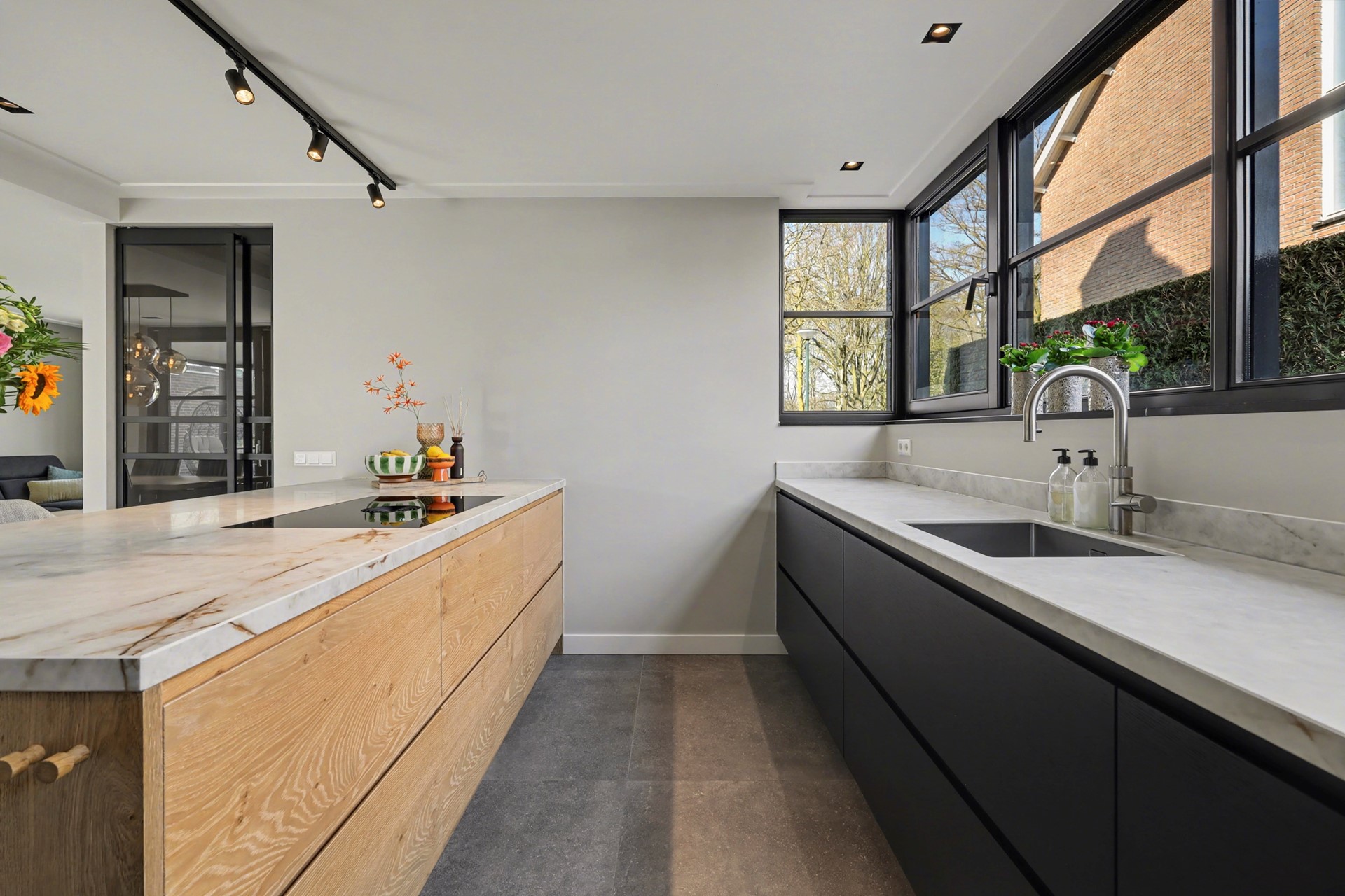 De doorkijkmogelijkheden naar zowel de straat als de tuin versterken het open en verbonden karakter van de ruimte. De open opstelling zorgt voor een fijne verbinding met de woonkamer en maakt het een ideale plek om tijdens het koken in contact te blijven met familie of gasten.