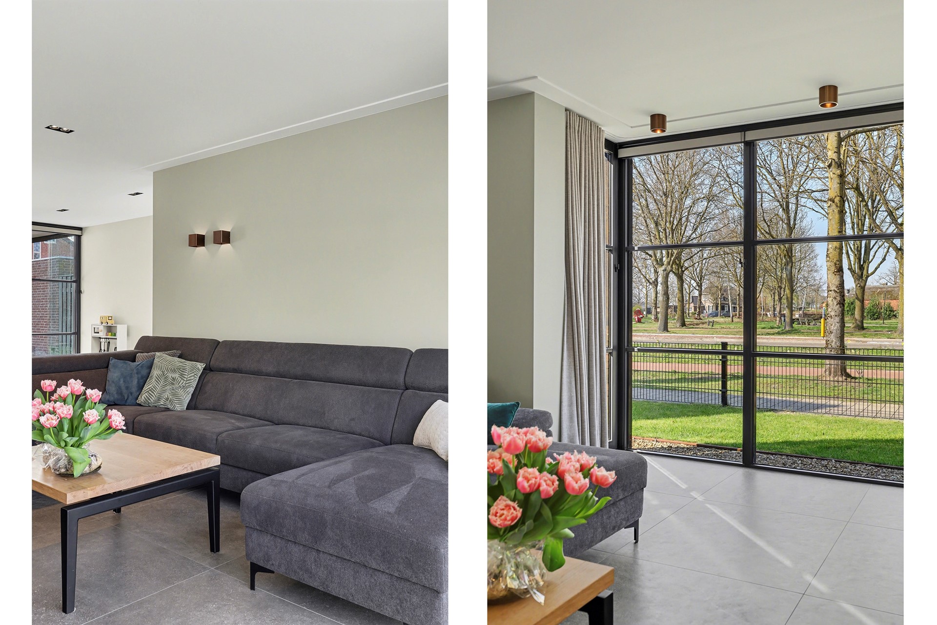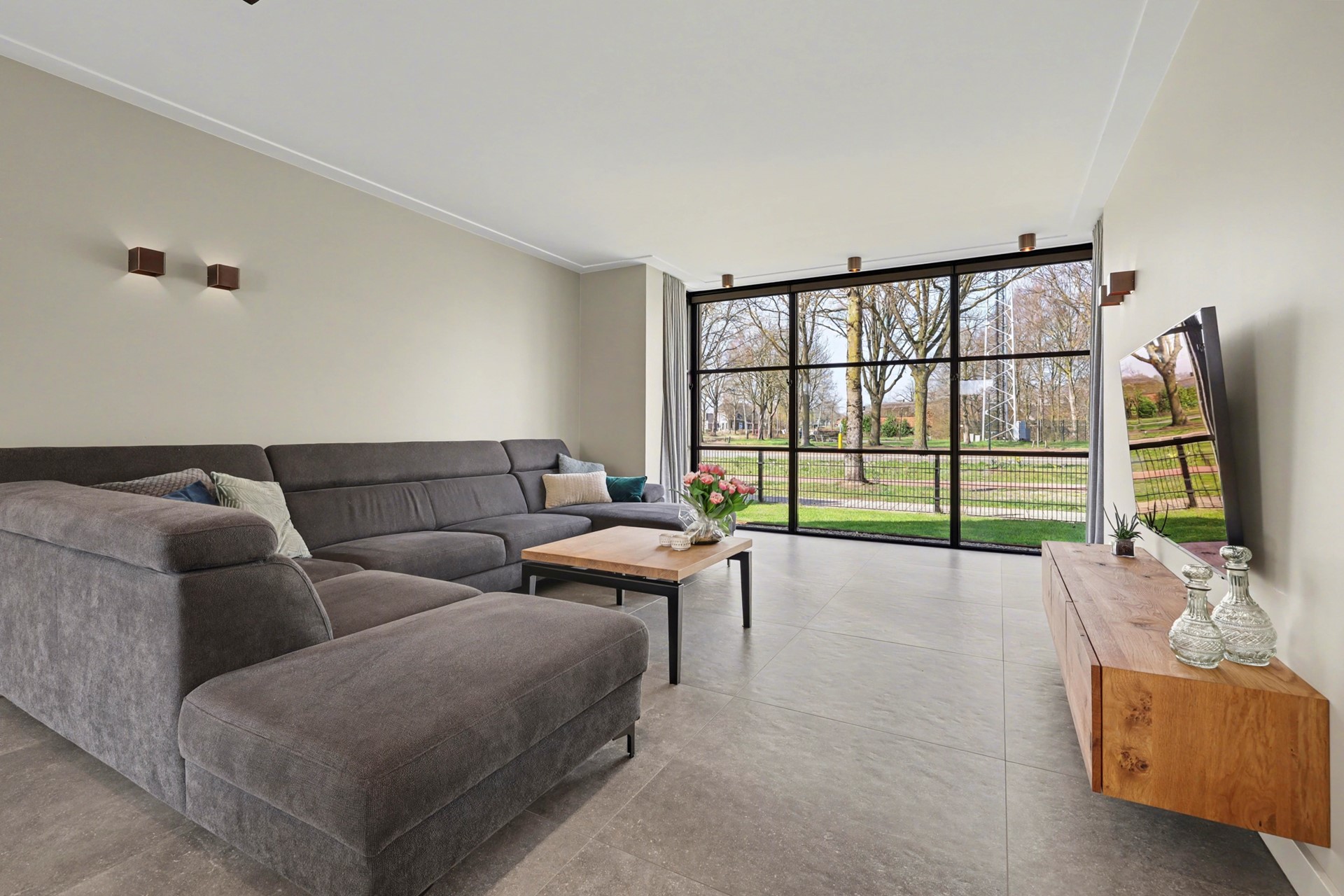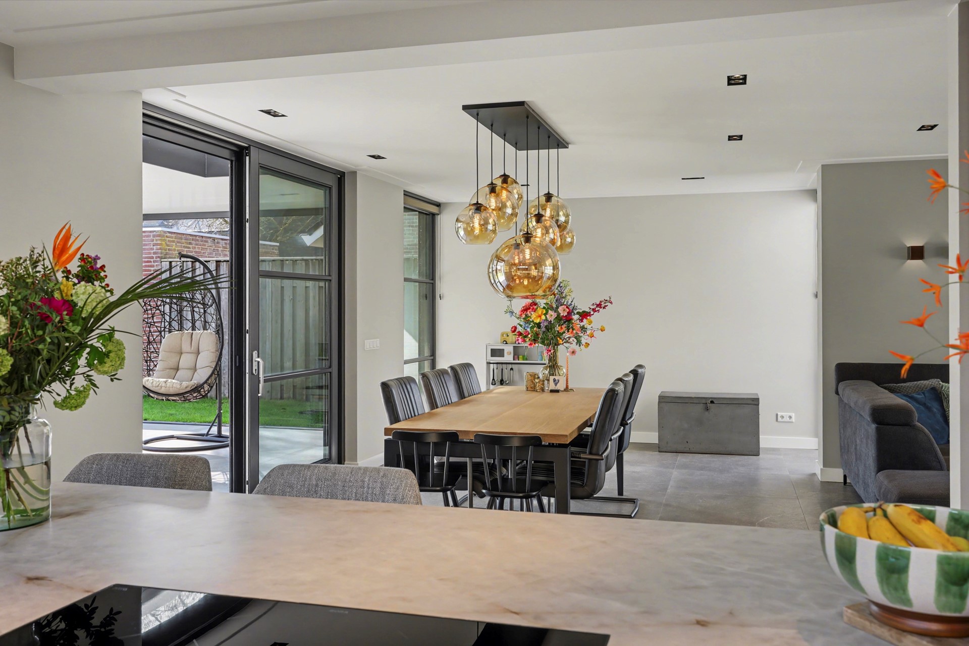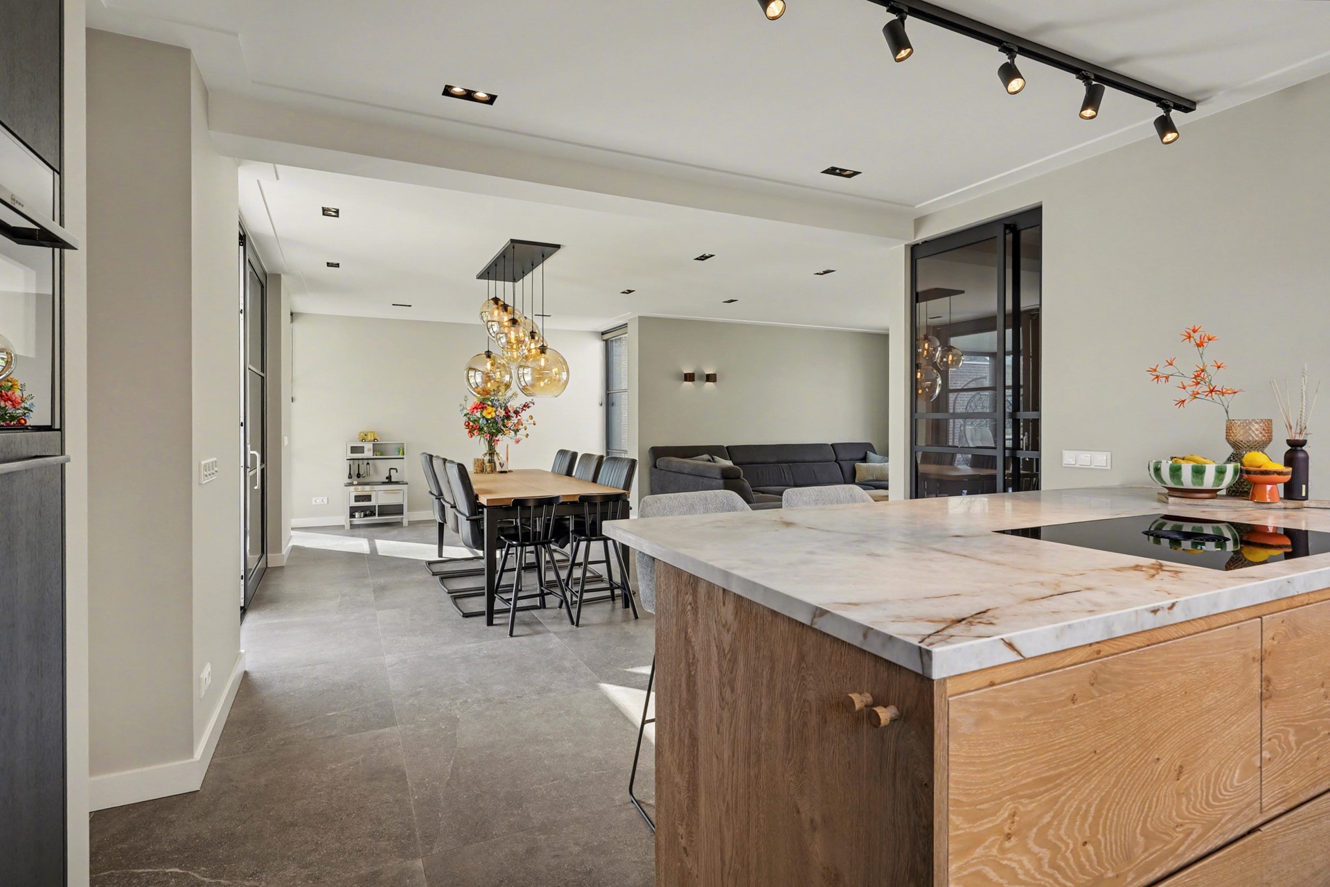 Via een stijlvolle stalen deur, loop je door naar het royale leefgedeelte. Dit is het hart van de begane grond, waar licht, ruimte en luxe samenkomen.