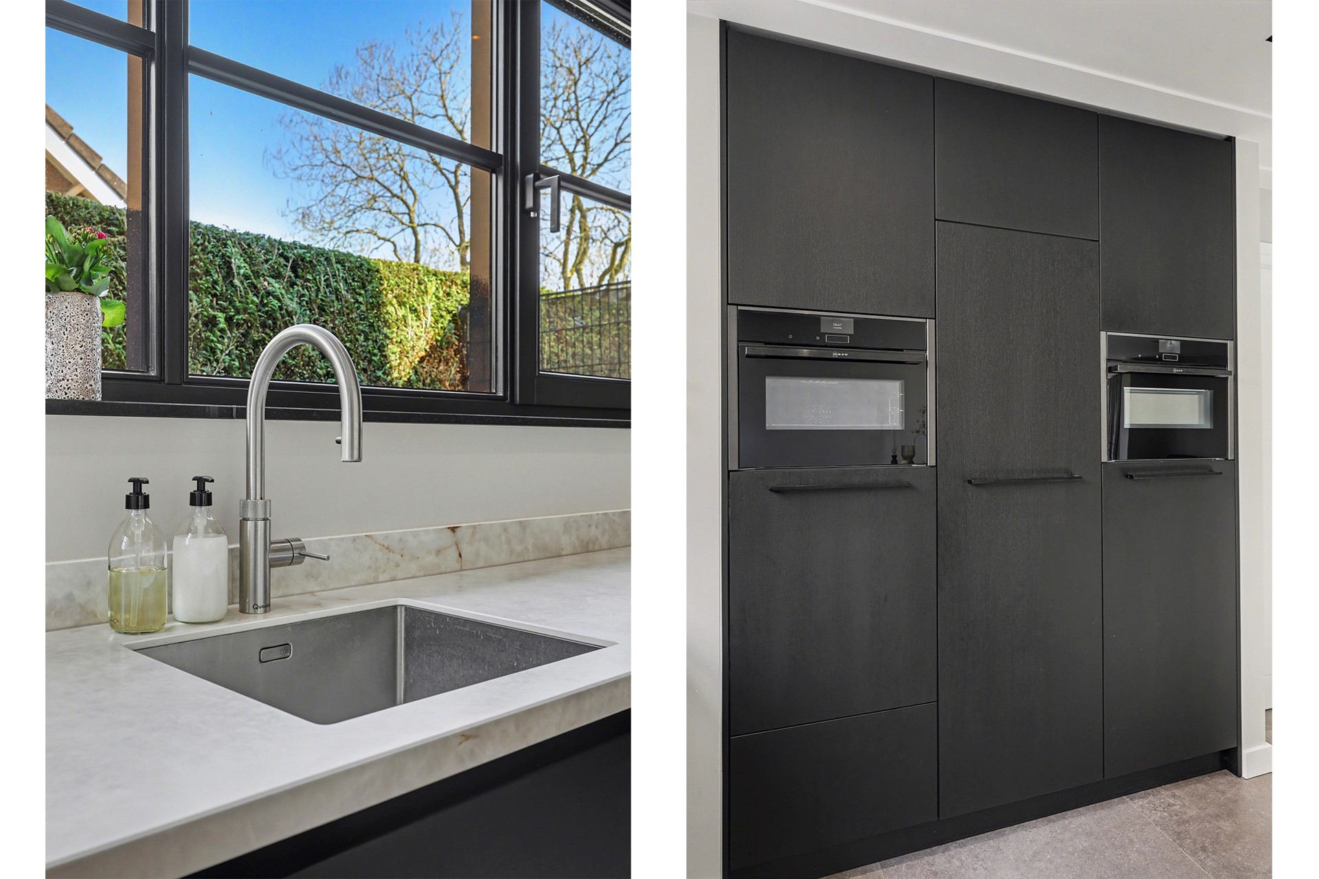 De open keuken vormt de tweede eyecatcher op deze etage en is ontworpen met oog voor detail en gebruiksgemak. De keuken (Royaal keukens) beschikt over hoogwaardige inbouwapparatuur, waaronder een Bora inductiekookplaat met downdraft afzuiging, een Quooker, een oven en stoomoven van NEFF en een vaatwasser op comfortabele hoogte.