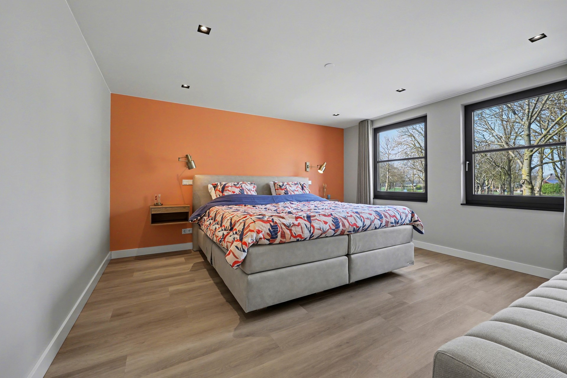 De royale hoofdslaapkamer combineert comfort, luxe en functionaliteit. De kamer biedt volop ruimte voor een groot bed en aanvullende meubels en beschikt over een fraai uitzicht op een groene straat.
