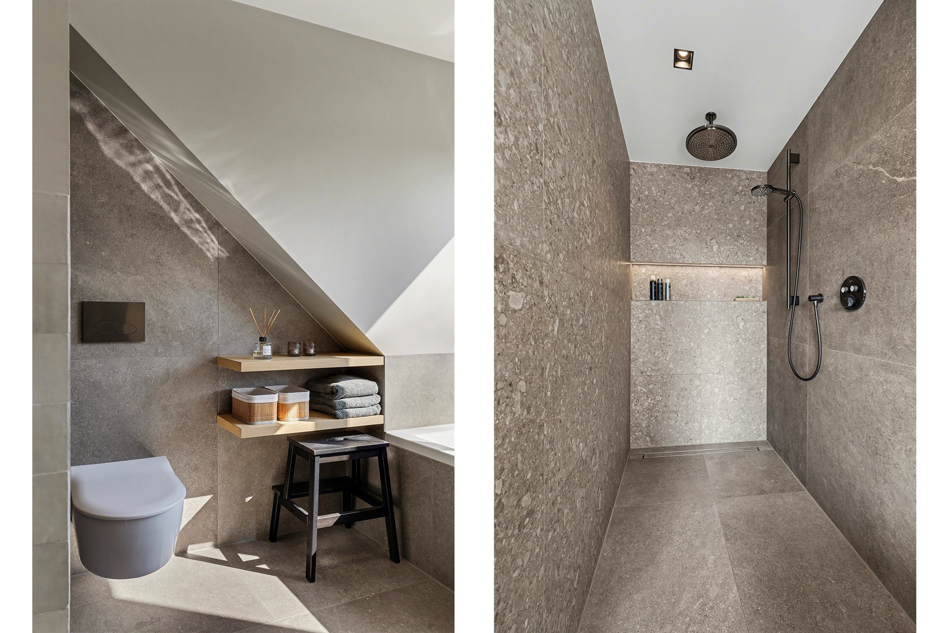 Een verlichte nis in de douche en de toepassing van inbouwspots zorgen voor een luxe wellness-vibe. Daarnaast is onder de dakschuinte een praktische inbouwkast gerealiseerd, ideaal voor extra opbergruimte.