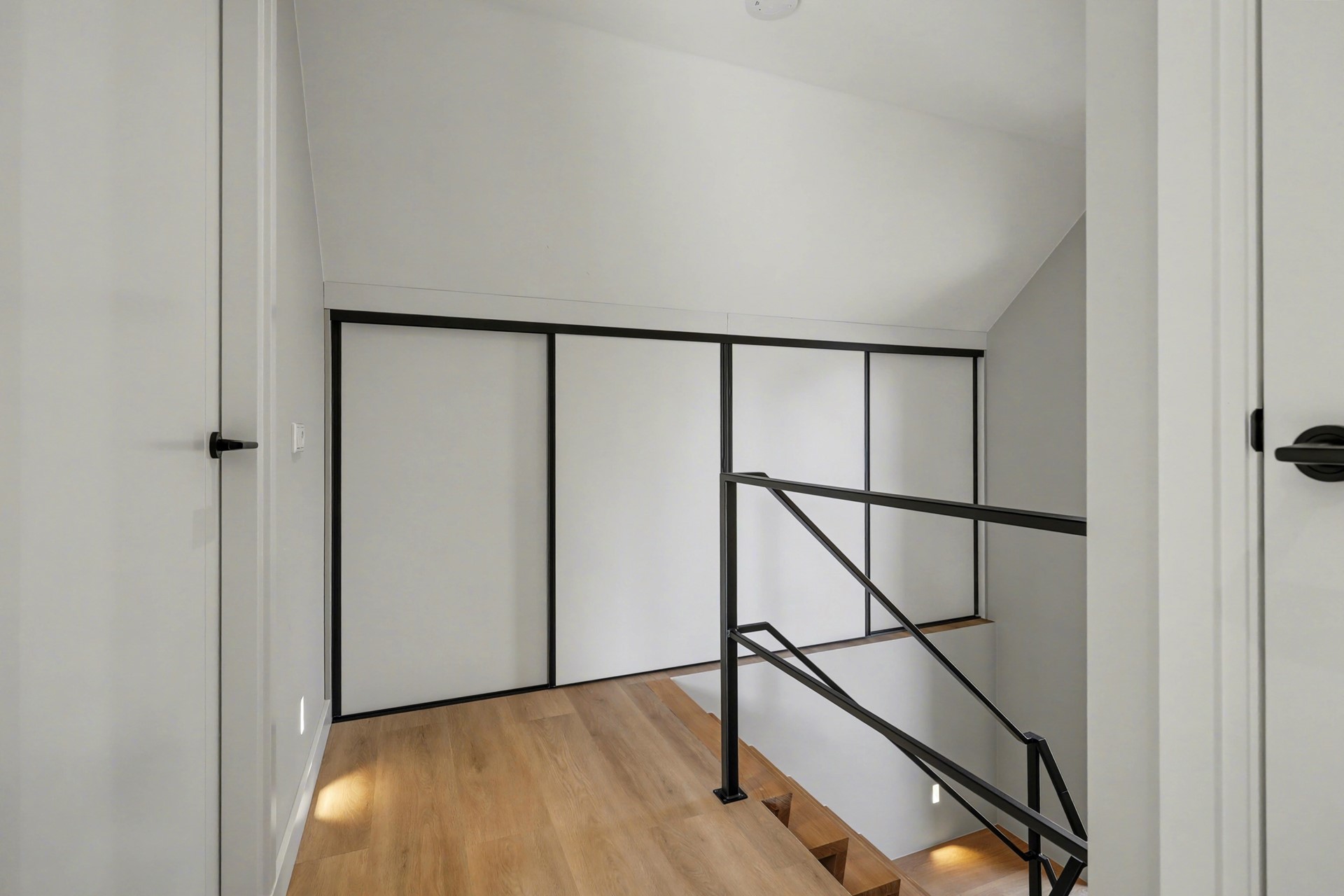 Via de fraaie, brede massief eiken Z-trap bereik je de tweede verdieping. Het trappengat is prachtig afgewerkt met een stijlvolle stalen balustrade. Ook deze etage is volledig afgewerkt met vloerverwarming (en -koeling), een hoogwaardige PVC-vloer en strak gestucte wanden en plafonds, wat zorgt voor een rustige en luxe uitstraling.