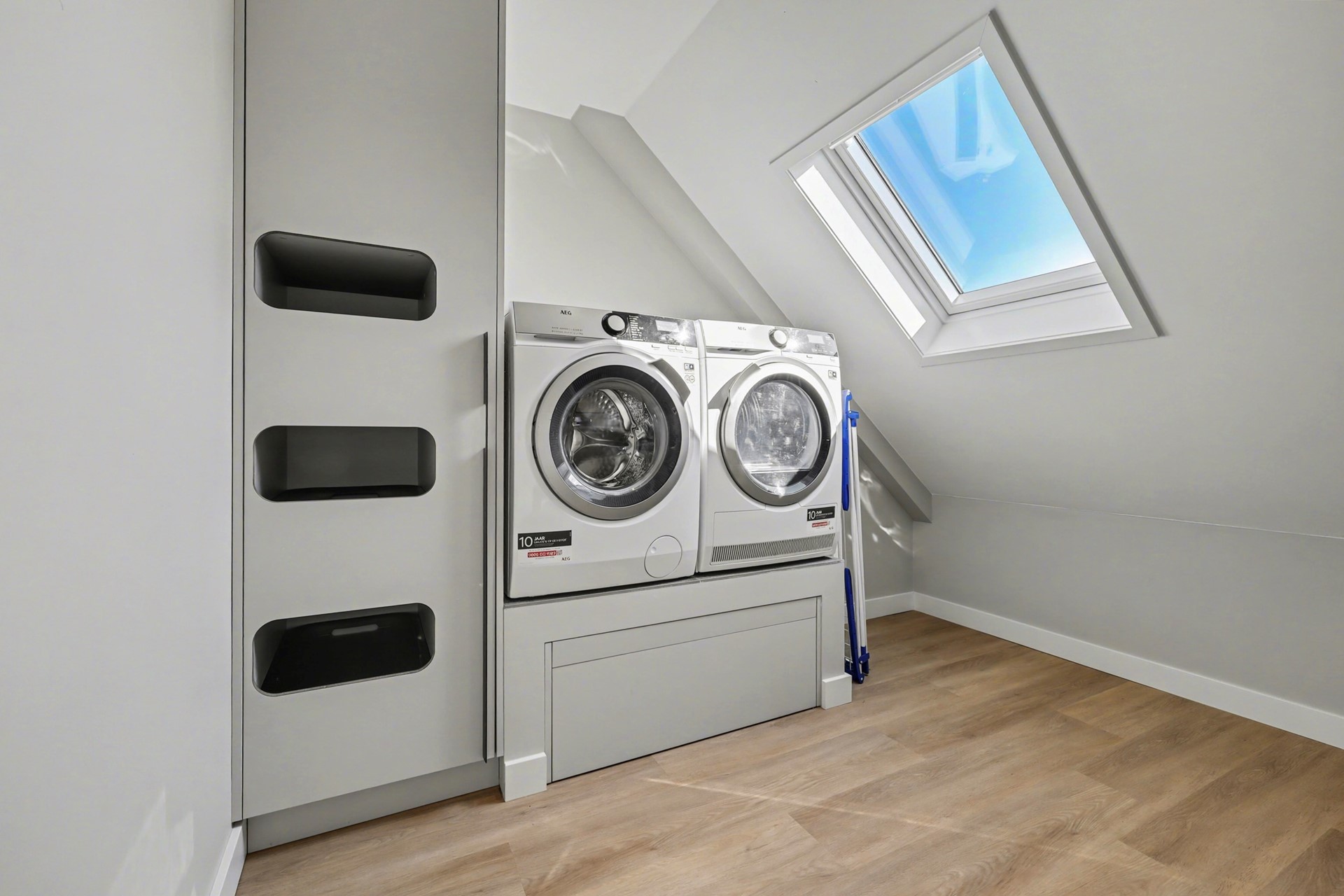Dan zijn we bij de laatste ruimte van de woning aangekomen, de wasruimte. Zelfs deze ruimte is praktisch en stijlvol ingericht! Hier bevinden zich een wastafelmeubel en een op maat gemaakte waskast waarin de wasmachine en droger op hoogte zijn geïntegreerd. Daarnaast is er een Velux dakraam aanwezig, wat zorgt voor prettig daglicht en ventilatie.