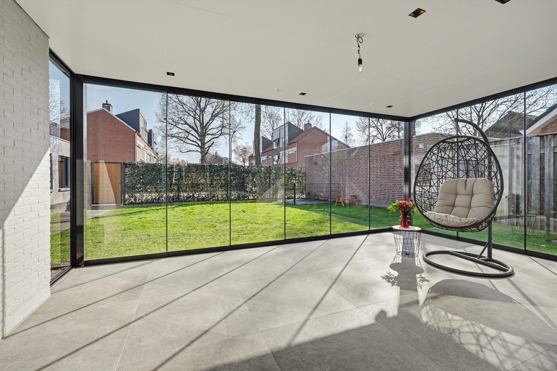 Deze ruimte is een verlenging van de woonkamer, enerzijds omdat de ruimte volledig afsluitbaar is met een glazen schuifwand. Anderzijds omdat het dak is geïsoleerd en de vloer is voorzien van vloerverwarming (en koeling). Zo is de tuinkamer ideaal bruikbaar als speelkamer, ontspanningsruimte of natuurlijk gewoon als overkapping. Daarnaast is de ruimte voorzien van inbouwspots, stopcontacten, een tv-aansluiting en de mogelijkheid tot het plaatsen van heaters. Zo is het mogelijk om vrijwel het hele jaar door van het binnen- en buitenleven te genieten en geeft dit de multifunctionele plek voor ontspannen momenten of gezellig samenzijn met familie en vrienden.