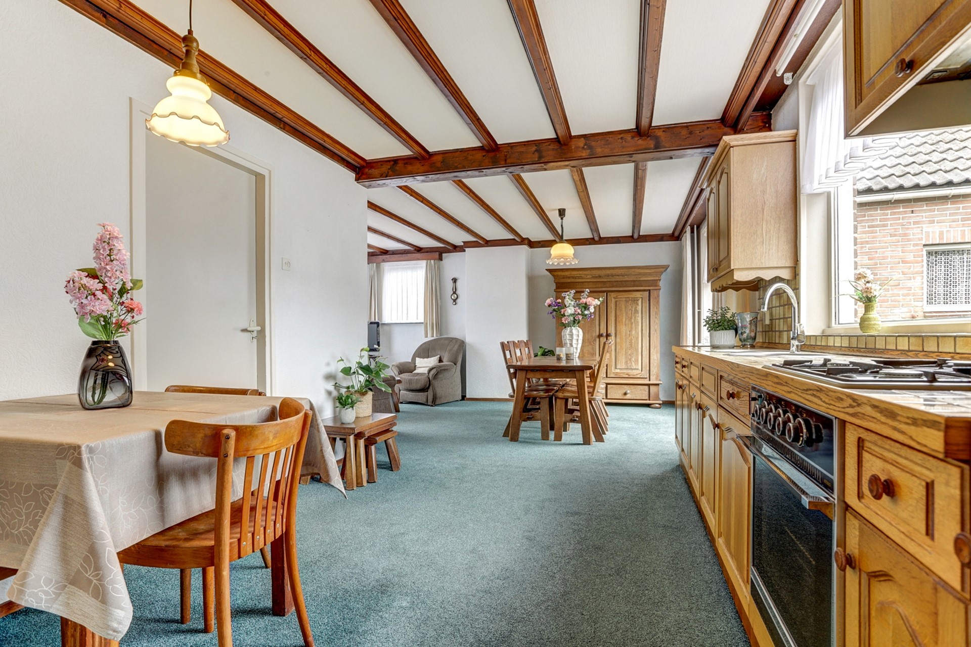 Laten we doorgaan naar de ruime zitkeuken aan de achterzijde van de woning, die dankzij het grote raam een prachtig uitzicht biedt op de tuin. De indeling is praktisch en de ruimte voelt prettig aan, maar de inrichting is toe aan een update. En juist dát maakt het extra leuk.