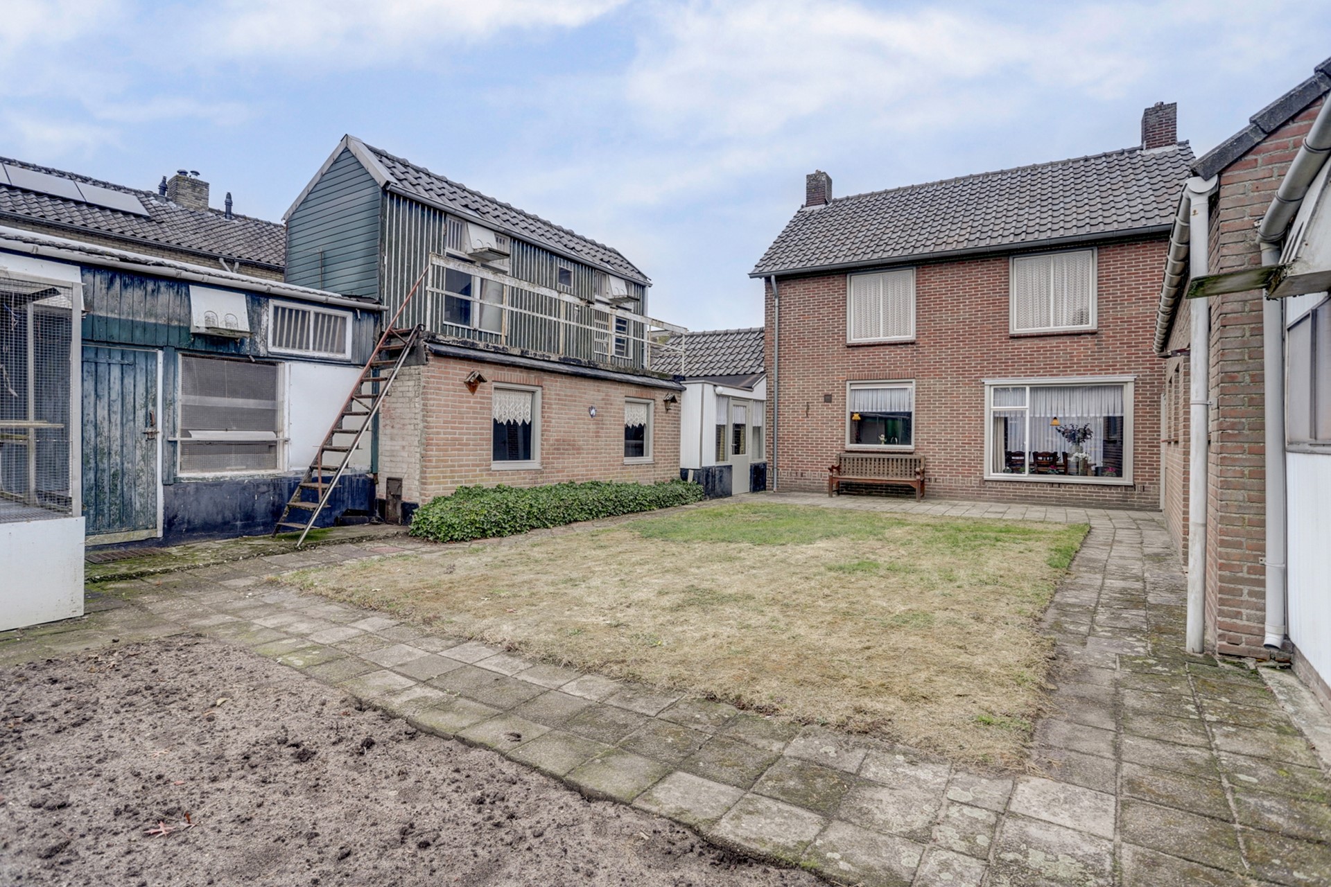 Aan de linkerzijde vind je de ruime, vrijstaande garage, gebouwd in de jaren ’70. Deze is voorzien van een kanteldeur, een aparte loopdeur én een losse trap naar de bergzolder. Bergruimte tekort? Zeker niet hier!