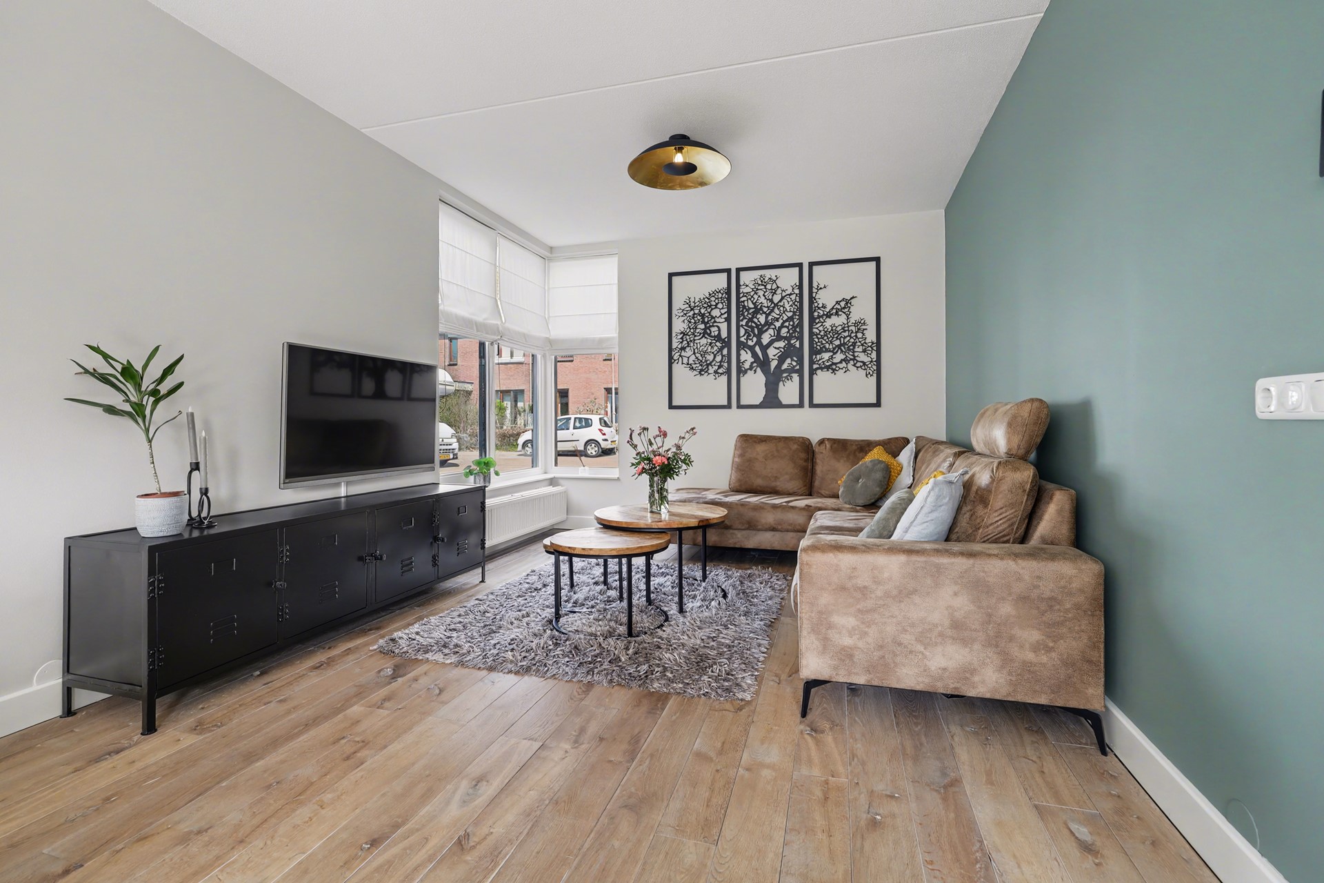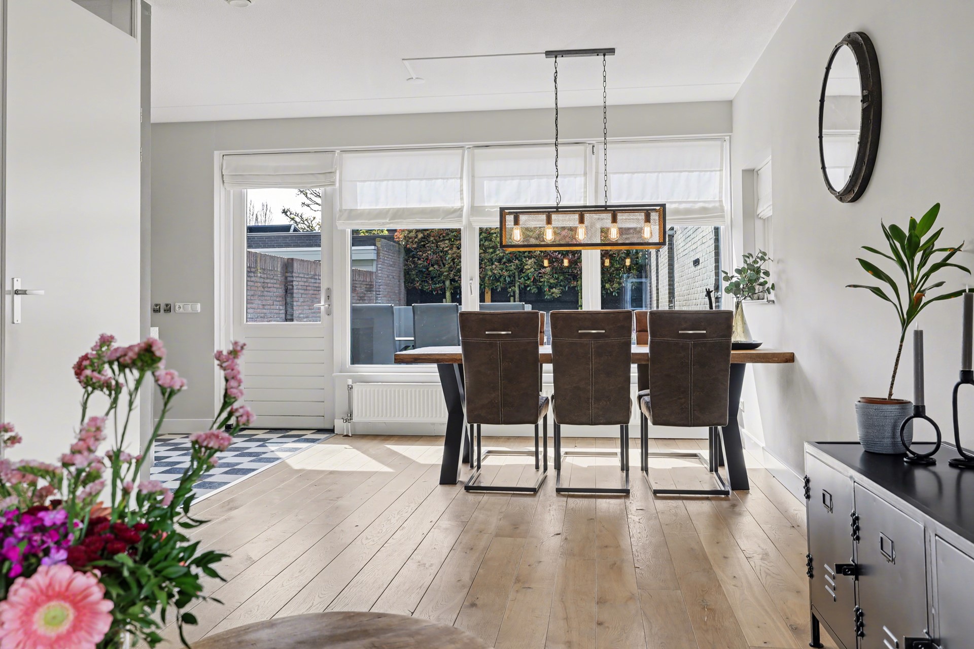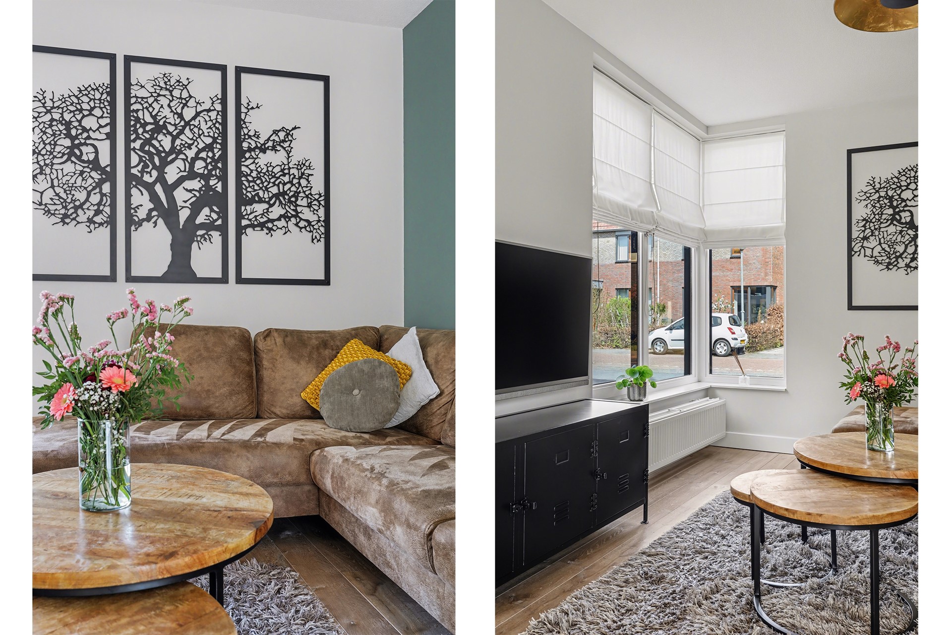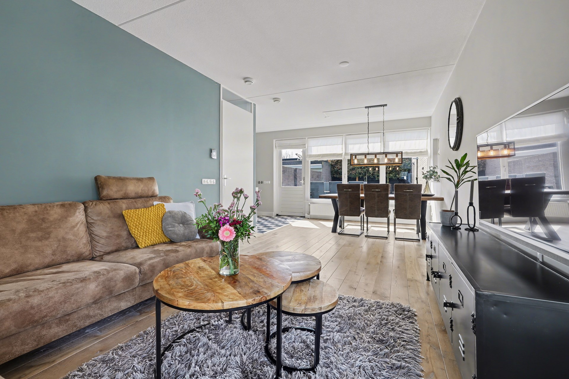 Dankzij de grote raampartijen in de woonkamer is er veel lichtinval en een ruimtelijk gevoel, met een heerlijk uitzicht op de tuin. De doorkijkmogelijkheden naar zowel de straat als de tuin versterken het open en verbonden karakter van de ruimte.