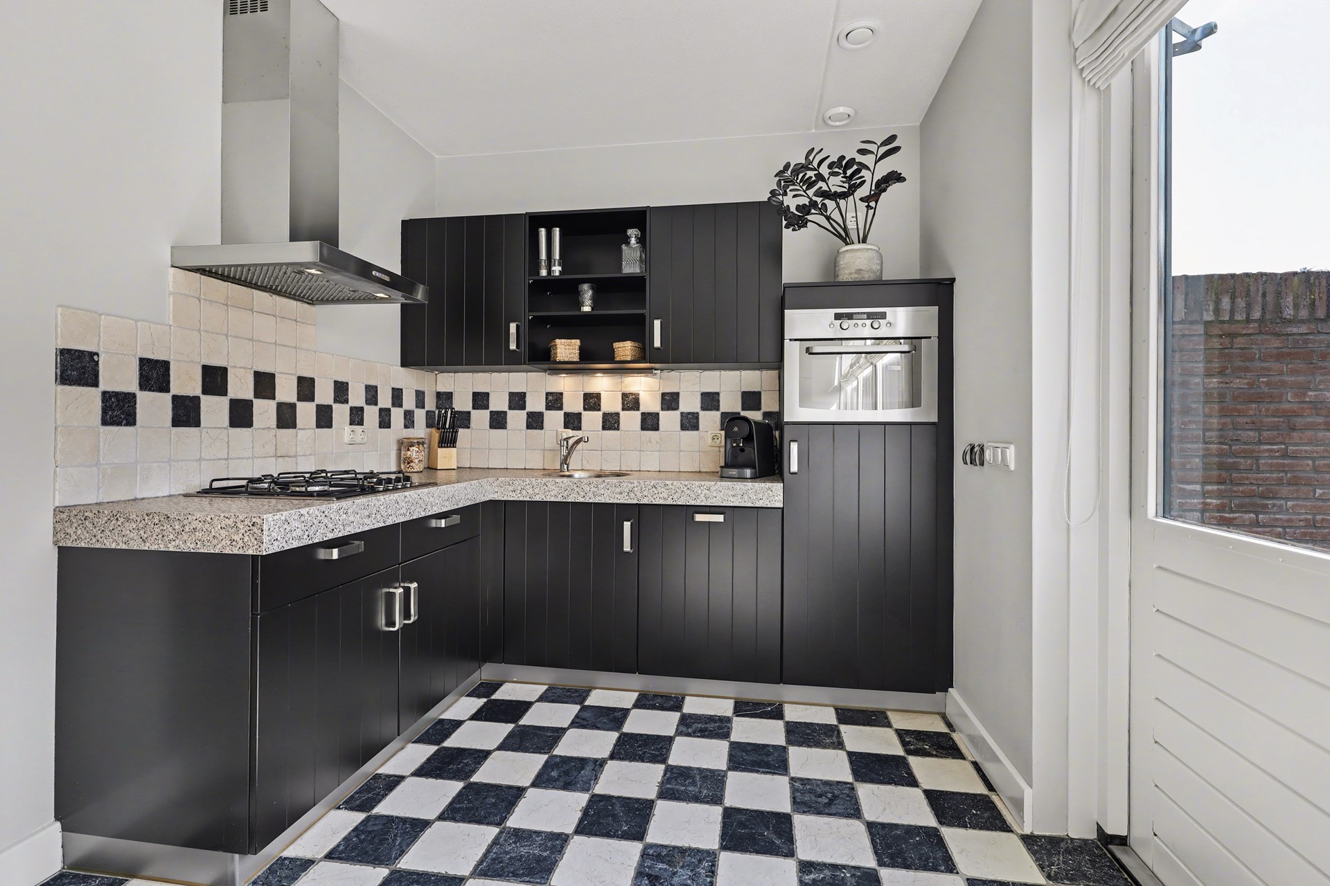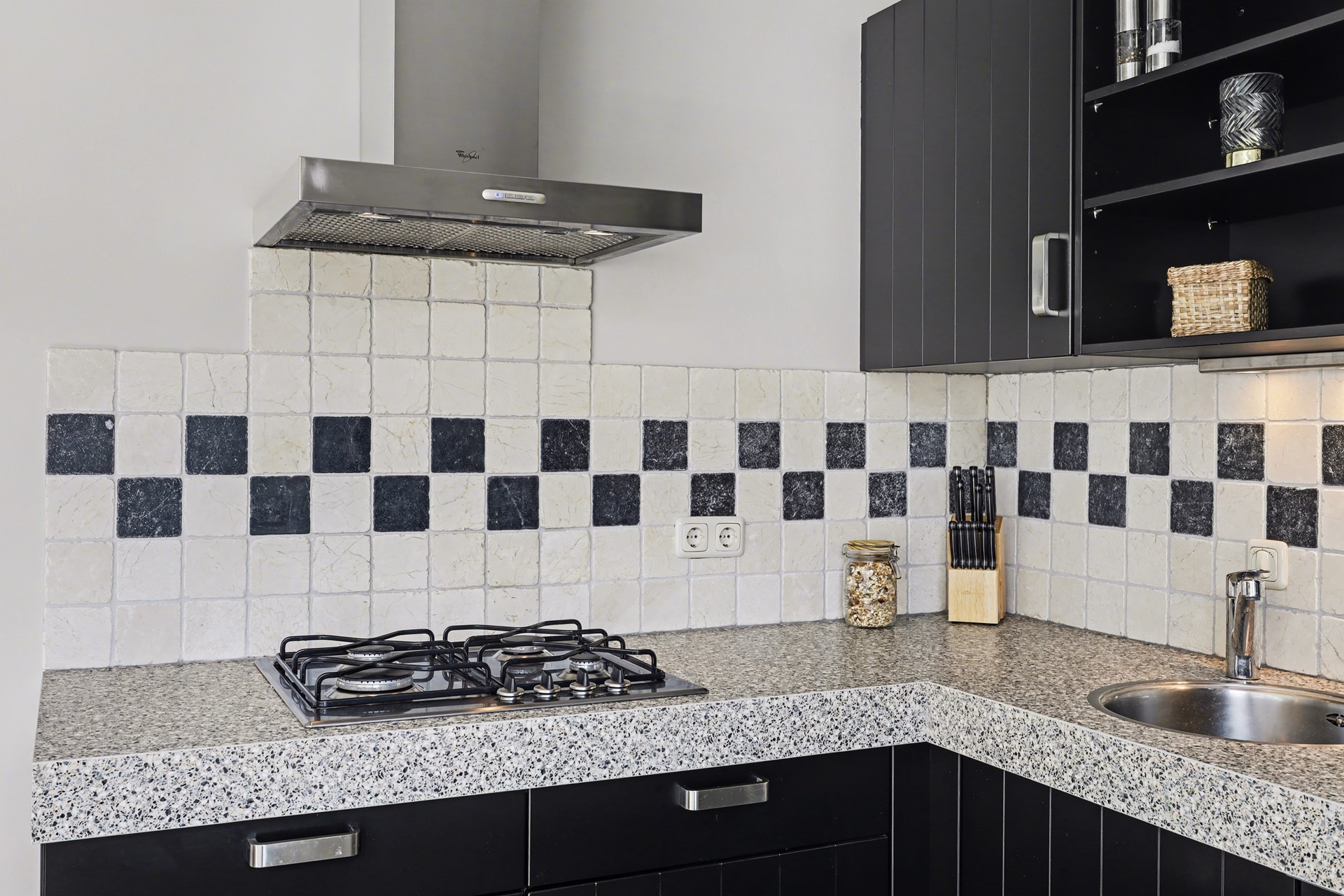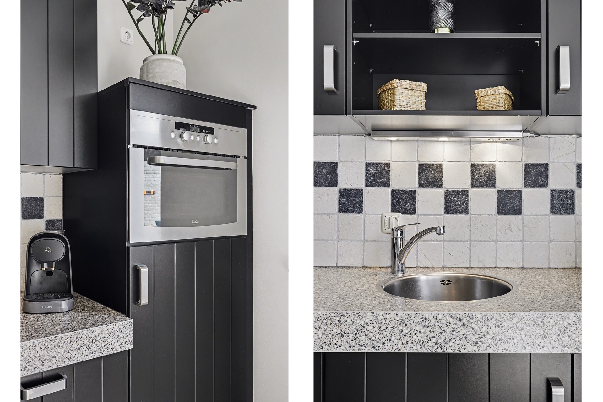 Aan de tuinzijde draagt ook de keuken bij aan de heerlijke sfeer op de begane grond. Dit komt onder andere door de charmante vloertegels en de landelijke, zwarte keukeninrichting. Deze sfeermaker is voorzien van een kunststof werkblad en compleet uitgerust met een 4-pits gaskookplaat, afzuigkap, combi-oven, vaatwasser, koelkast en volop kastruimte. De open opstelling zorgt voor een fijne verbinding met de woonkamer en maakt het een ideale plek om tijdens het koken in contact te blijven met familie of gasten.