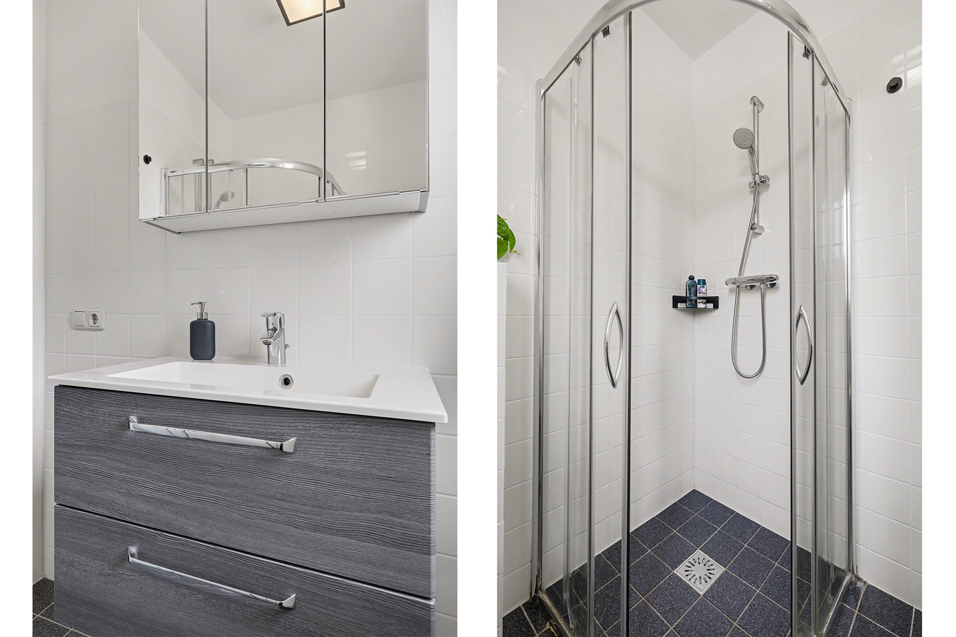 De badkamer is compact, maar praktisch ingedeeld en van alle gemakken voorzien. De ruimte is fris en neutraal betegeld en beschikt over een modern wastafelmeubel met bijpassende spiegelkast, een radiator, een douchecabine en een hangcloset.