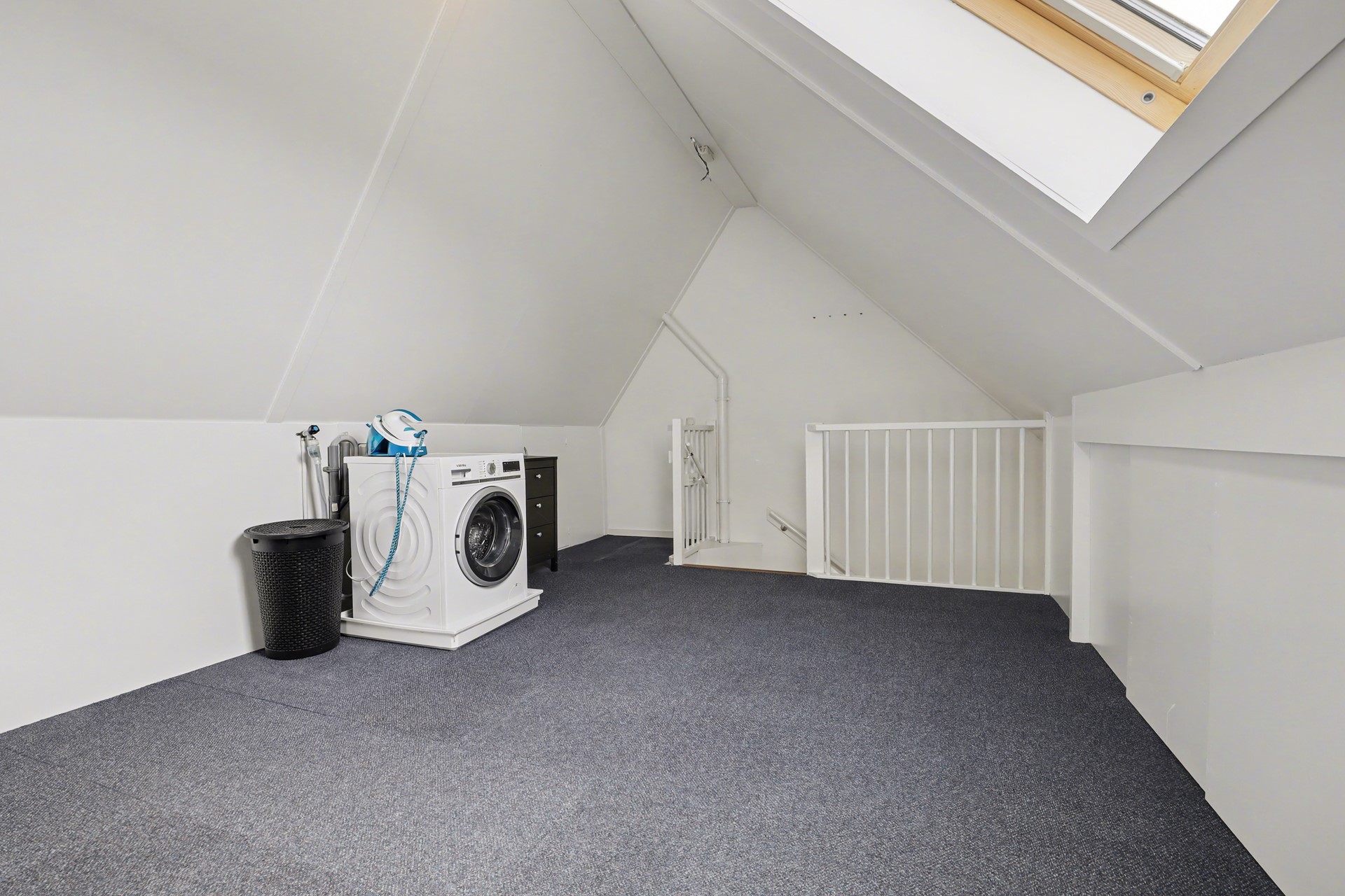 Hier bevinden zich tevens de witgoedaansluitingen, een vernieuwde cv-ketel (Nefit, 2025) en een vernieuwde WTW-unit (2025). Aan opbergruimte geen gebrek, want onder beide dakschuintes zijn praktische bergkasten gerealiseerd. De vloer is afgewerkt met tapijttegels en de wanden en het plafond hebben een lichte, neutrale basis. Dankzij het Velux dakraam profiteert de ruimte van prettig daglicht, wat zorgt voor een extra lichte en aangename sfeer.