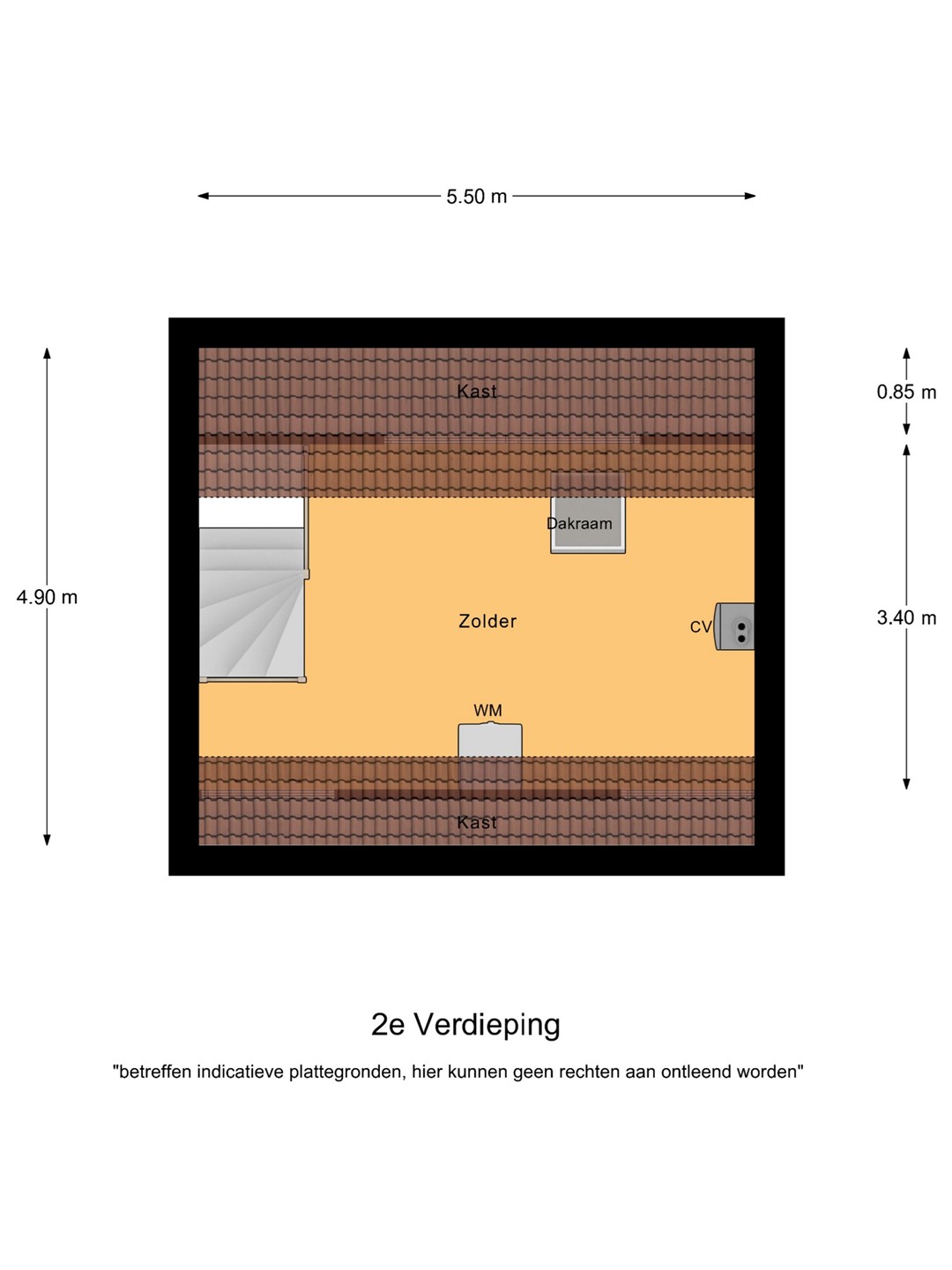 Net als de trap naar de eerste verdieping is ook deze trap voorzien van fraaie trapbekleding. We volgen de treden naar de open, nog vrij in te delen zolderruimte. Momenteel wordt deze gebruikt als was- en bergruimte.