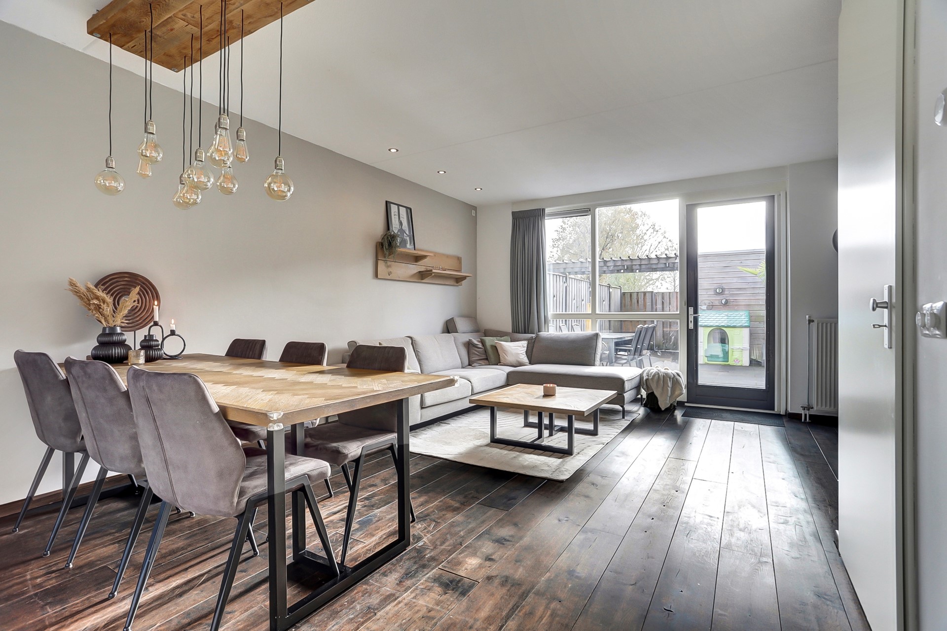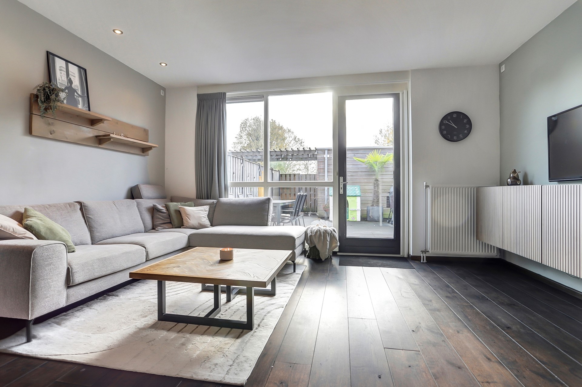 Zodra de deur naar de woonkamer opengaat, word je direct verrast door het prachtige natuurlijke licht dat binnenvalt via de grote raampartijen aan de tuinzijde. De tuingerichte woonkamer heeft een rustige, neutrale basis en is afgewerkt met een stijlvolle houtenvloer in een warme walnoottint, een neutrale wandafwerking en een spuitwerkplafond met inbouwspots.