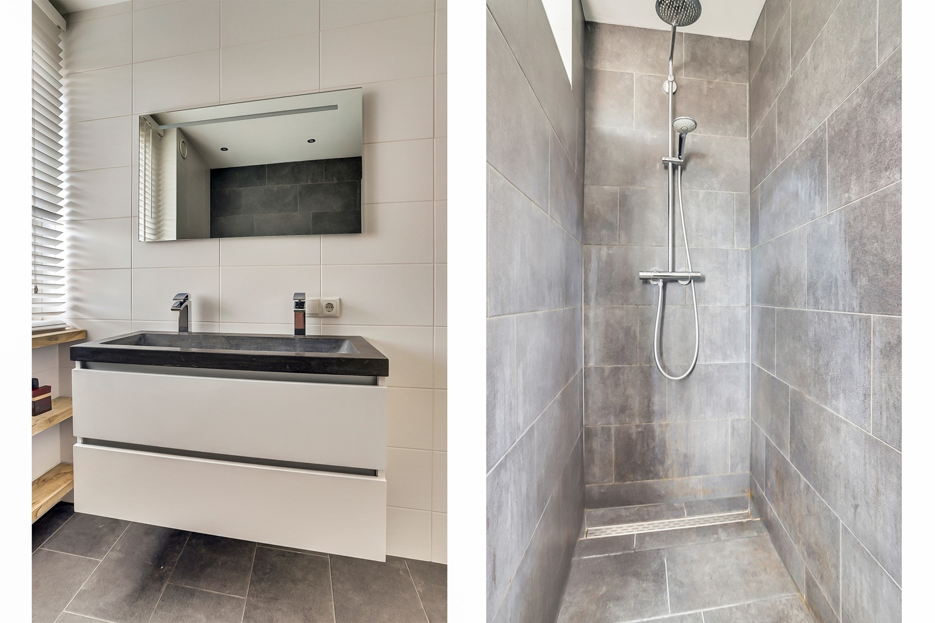 Een badkamer die je echt even tot rust laat komen. Aan de voorzijde gesitueerd, met een fraaie mix van donkere vloertegels en een combinatie van donkere en lichte wandtegels voor een stijlvol contrast. De ruimte is slim ingedeeld: een ruime inloopdouche met hand- en regendouche, een groot wastafelmeubel met dubbele kraan en verlichte spiegel, maar natuurlijk ook met een hangcloset.