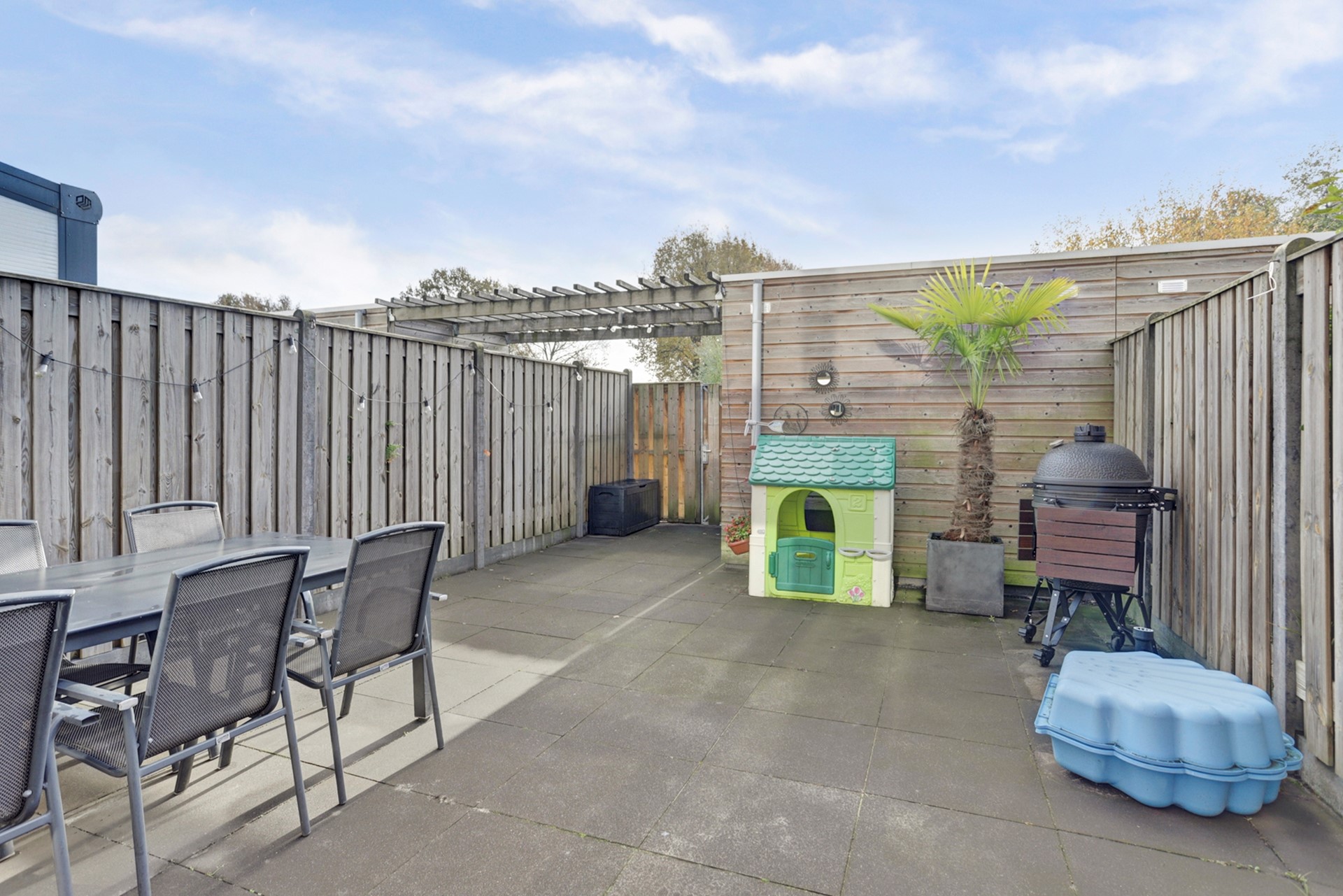 Ook buiten is het volop genieten! De zonnige, onderhoudsvriendelijke tuin ligt op het zuiden en biedt een heerlijke plek om van ’s ochtends vroeg tot ’s avonds laat te ontspannen. Met nette bestrating en omheining van houten schuttingdelen is het onderhoud minimaal, terwijl de praktische houten berging achterin perfect is voor tuinspullen of fietsen.
