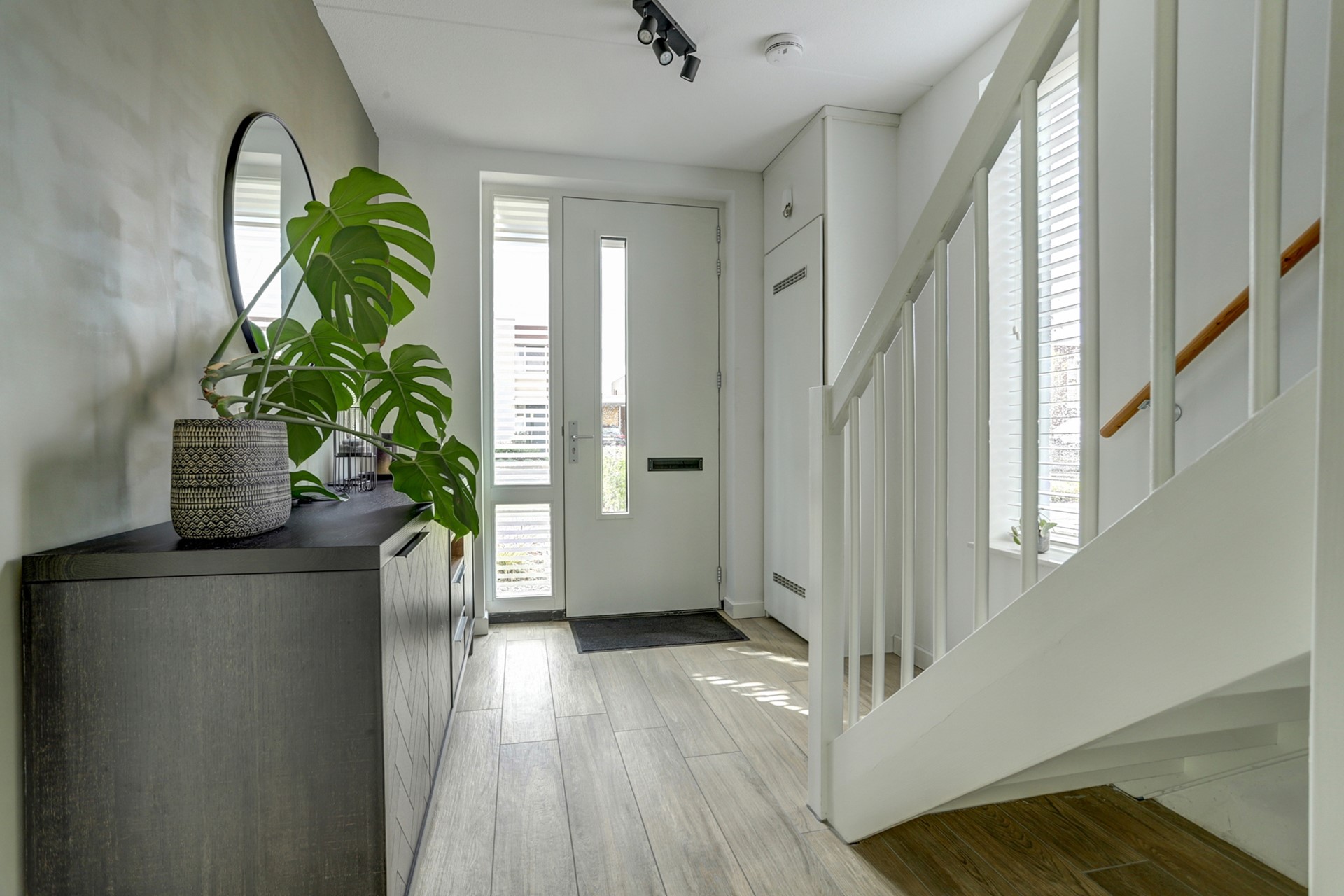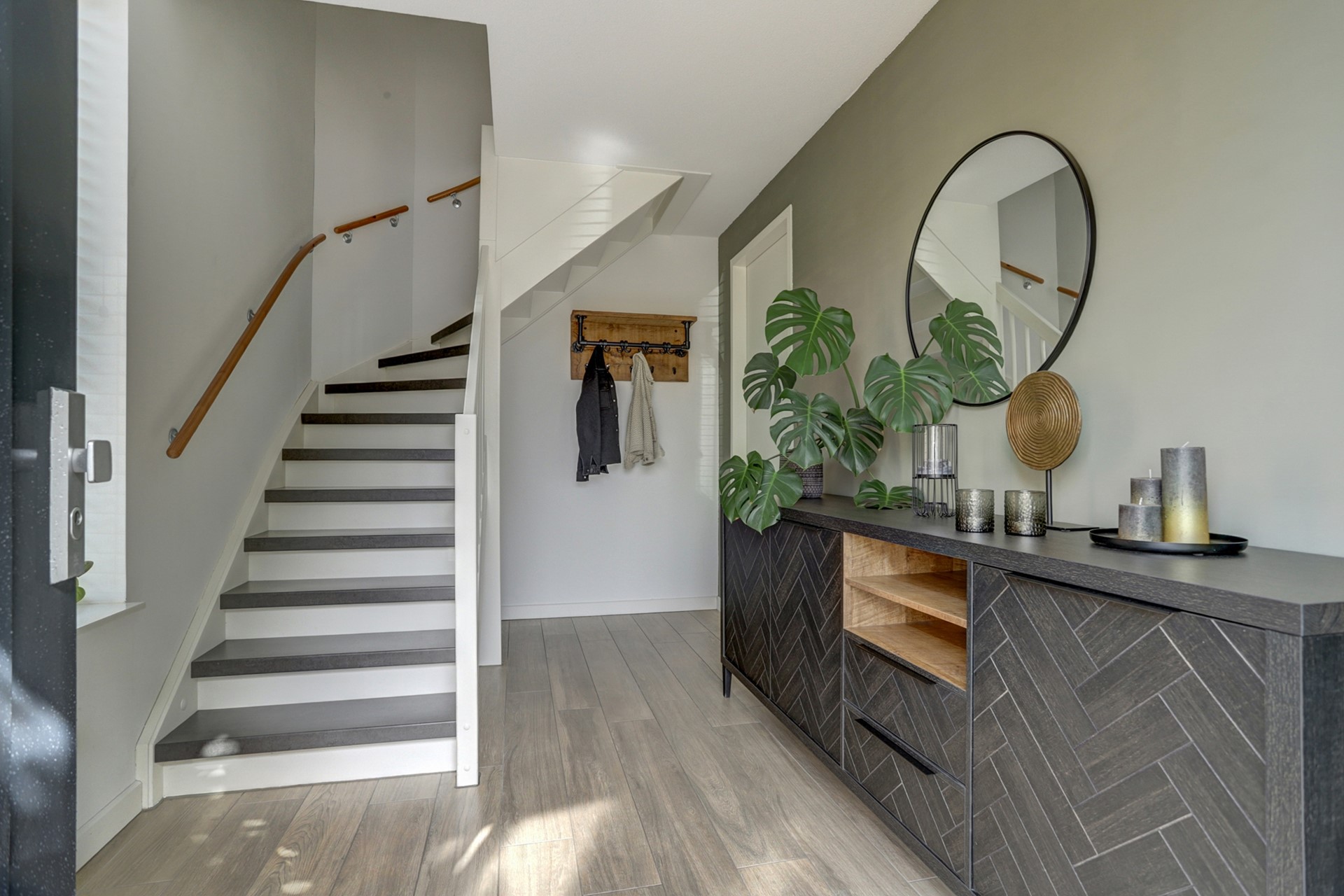 Vanuit de overdekte entree stap je zo de woning binnen en niet zomaar een halletje. Hier heb je alle ruimte: geen geduw of gestoei met jassen, maar een fijne binnenkomer waar je meteen de trap naar boven, de meterkast én de lichte doorzon-woonkamer vindt.