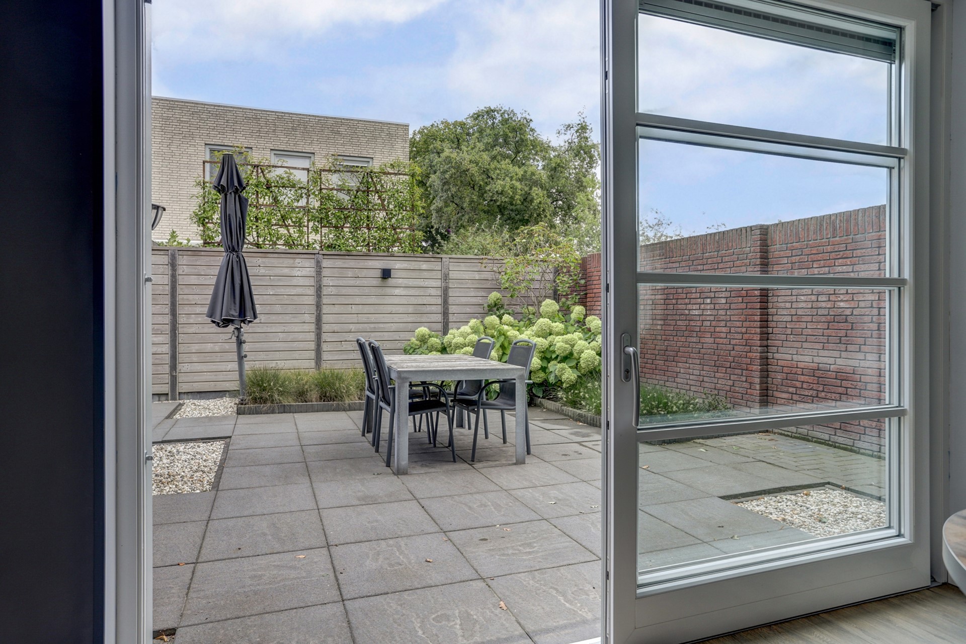 Vanuit de woonkamer stap je zó via de schuifpui de tuin in, heerlijk toch? Ook via het achterportaal is de tuin direct bereikbaar.