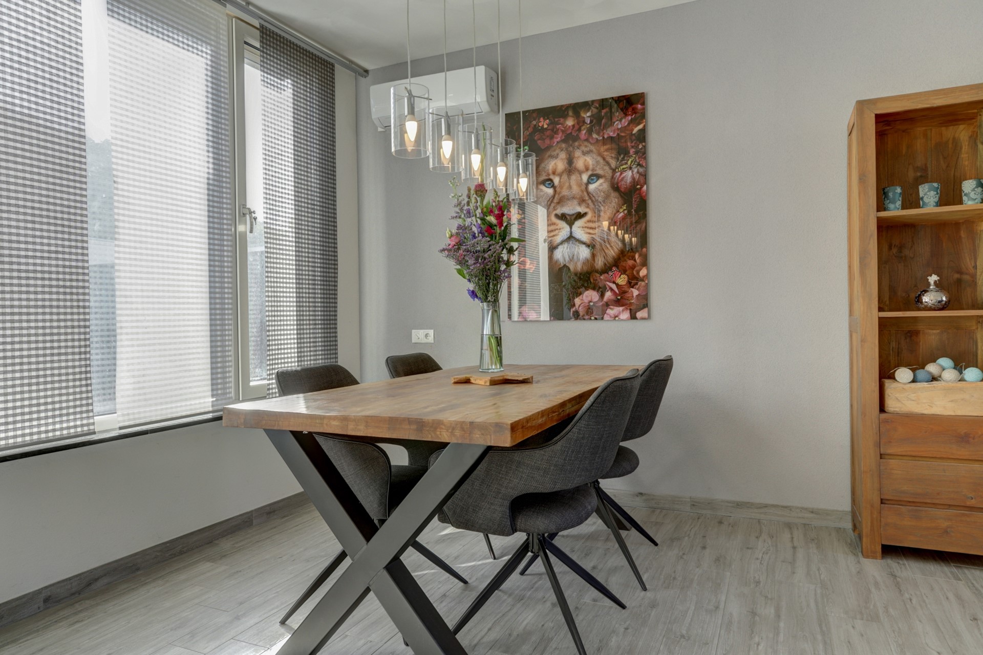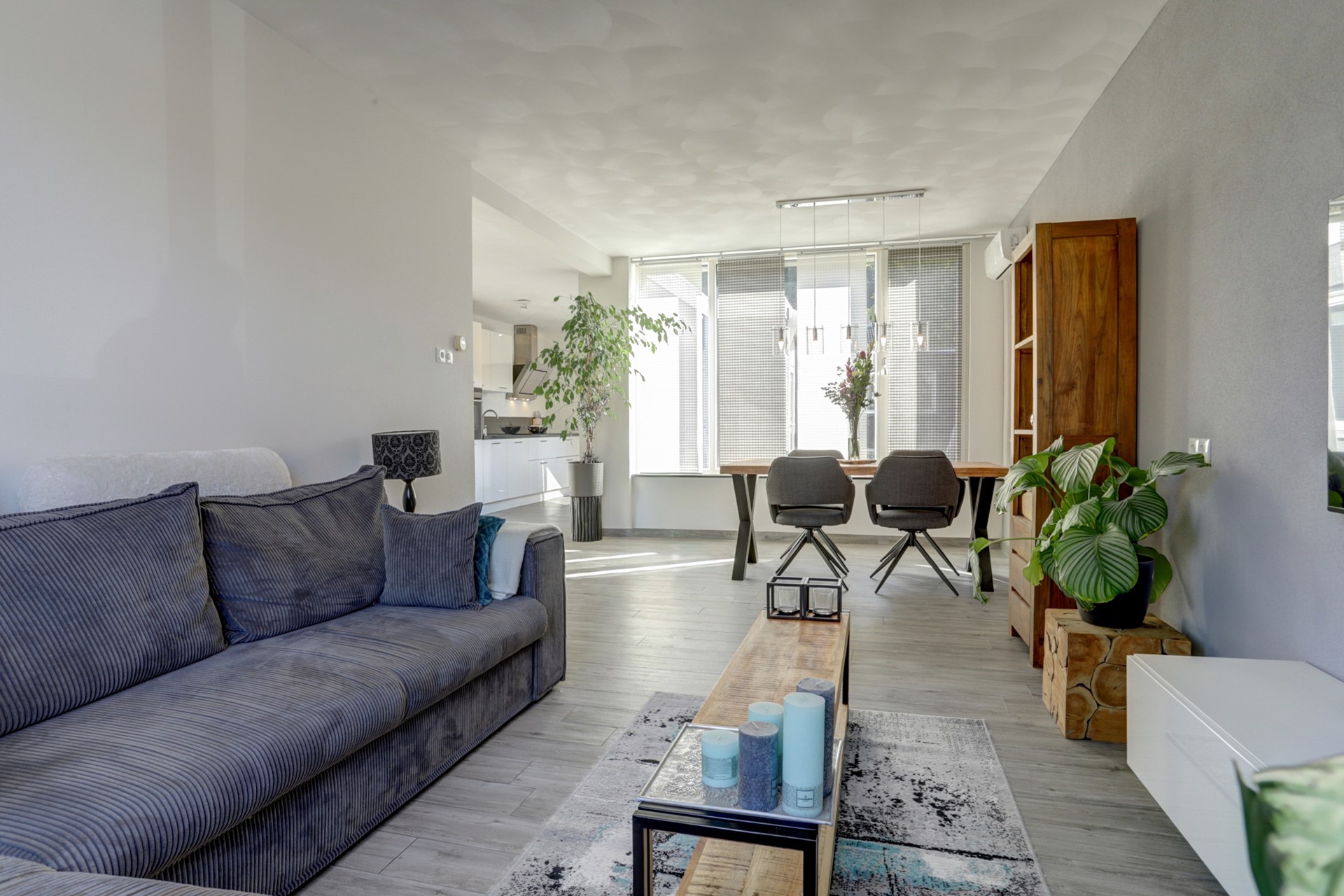 De afwerking is modern en tijdloos met een houtlook tegelvloer inclusief vloerverwarming, strak gestuukte wanden en een strak plafond met een mooie maantjesstructuur.