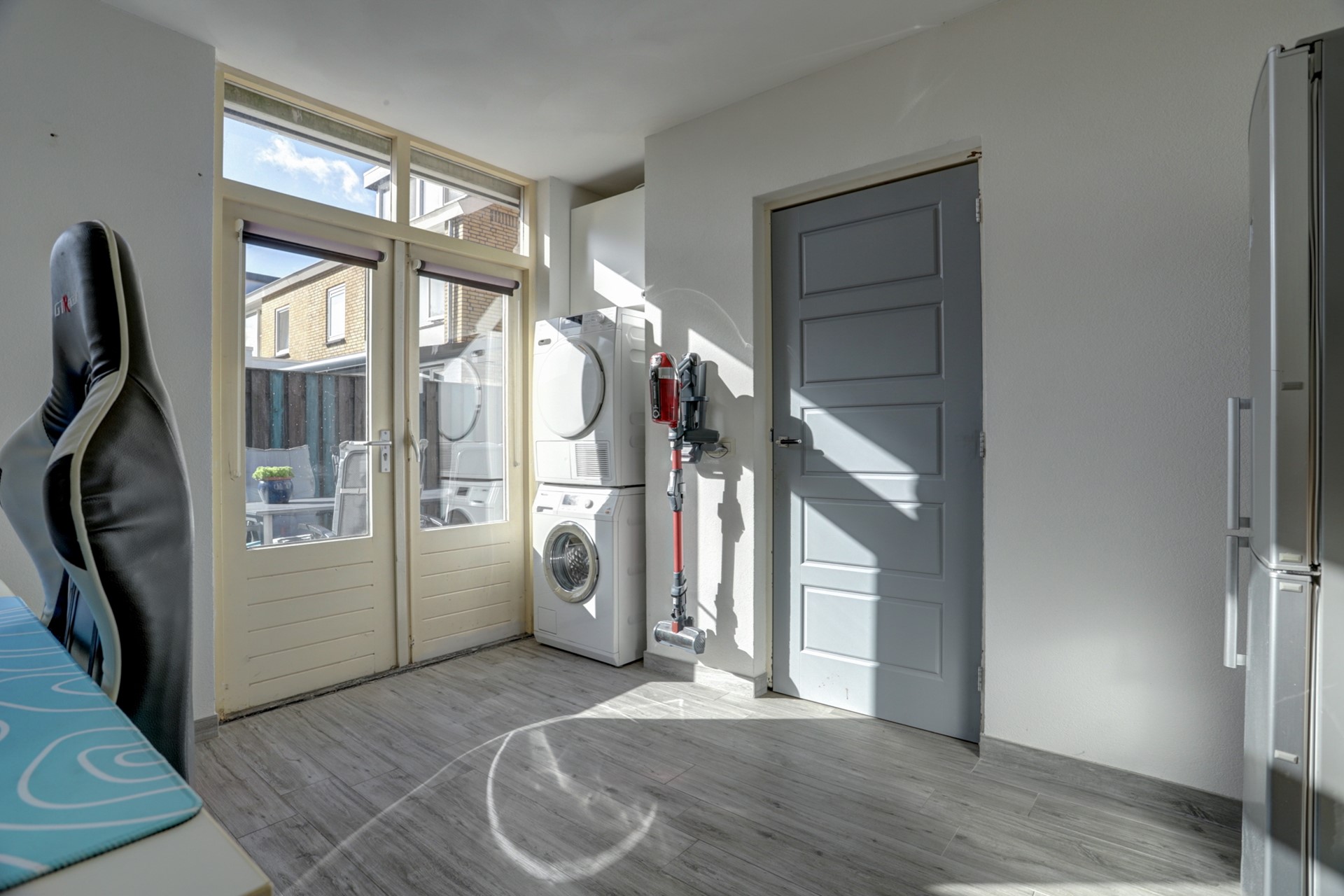 Wat een verrassing wacht er achter de keuken: een echte multifunctionele ruimte! Op dit moment wordt deze gebruikt als studieruimte, bergruimte én wasruimte. Multifunctioneel in de puurste vorm.