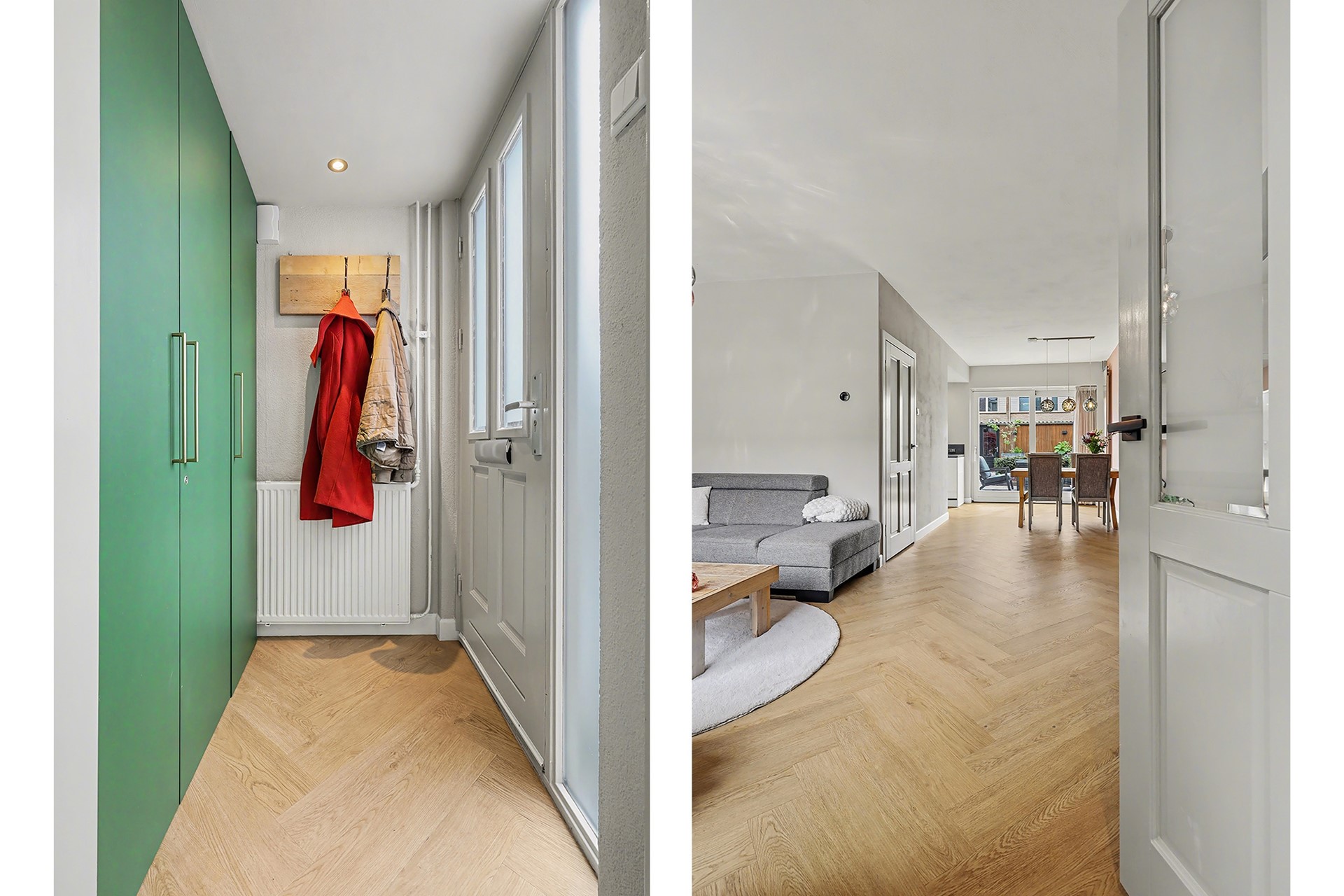 Eenmaal over de drempel voelt het meteen goed. Je komt binnen in een frisse, verzorgde entree waar de visgraat PVC-vloer direct in het oog springt en naadloos doorloopt over de gehele begane grond. Dit zorgt voor een rustige en stijlvolle basis.