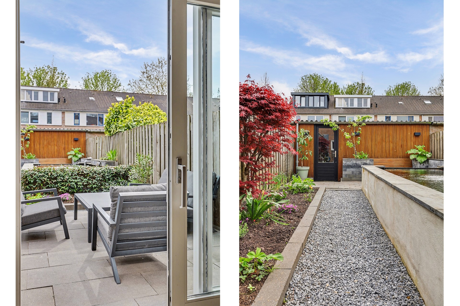 Stap de woonkamer uit, schuif de pui open en laat je direct verrassen door de uitzonderlijk diepe, sfeervolle tuin. Deze is met zorg aangelegd en voorzien van prachtige groene borders en een heerlijk zonnig terras direct achter de woning. De perfecte plek om te ontspannen of gezellig te borrelen.