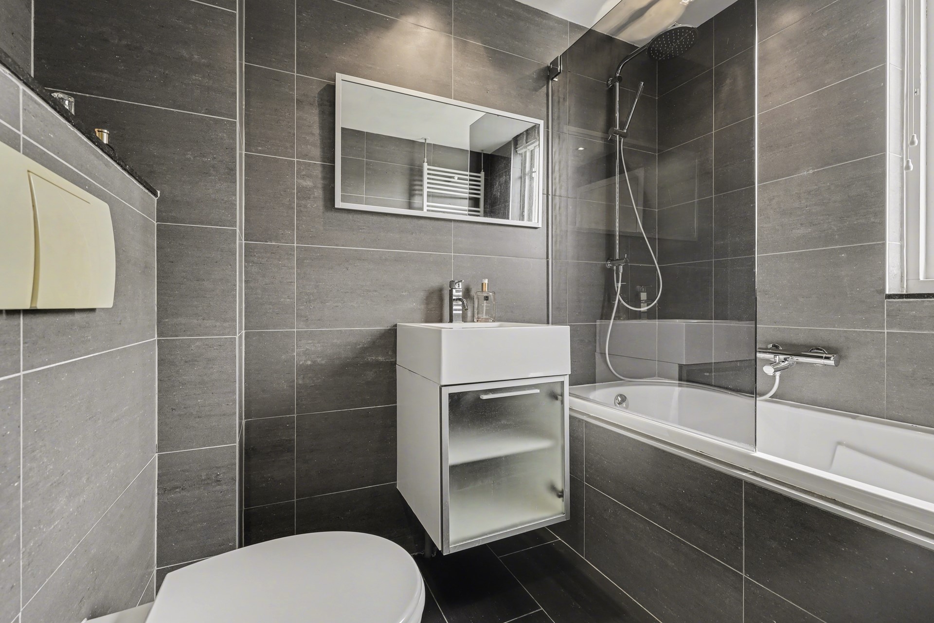 De badkamer is uitgerust met een ligbad met glazen douchescherm, voorzien van een regen- en handdouche. Daarnaast beschikt de ruimte over een wastafelmeubel met spiegel, een handdoekradiator en een hangcloset. Het raam zorgt voor prettig daglicht en natuurlijke ventilatie, terwijl de recent vernieuwde mechanische ventilatie extra comfort biedt.