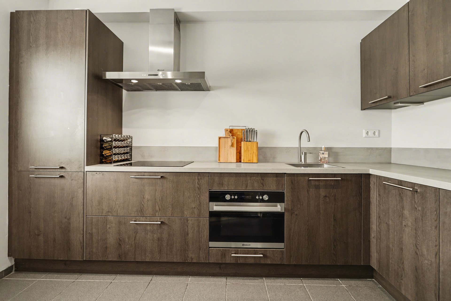 De moderne keuken is uitgevoerd in een praktische L opstelling en geplaatst in 2018. De keuken beschikt over diverse onder en bovenkasten, een kunststof werkblad en is compleet uitgerust met een inductiekookplaat, afzuigkap, rvs spoelbak, koel vriescombinatie en combimagnetron. De ruimte is afgewerkt met een tegelvloer en strak gestucte wanden en plafond met spots. Voor de fanatieke kookliefhebber een prettige keuken om in aan de slag te gaan!